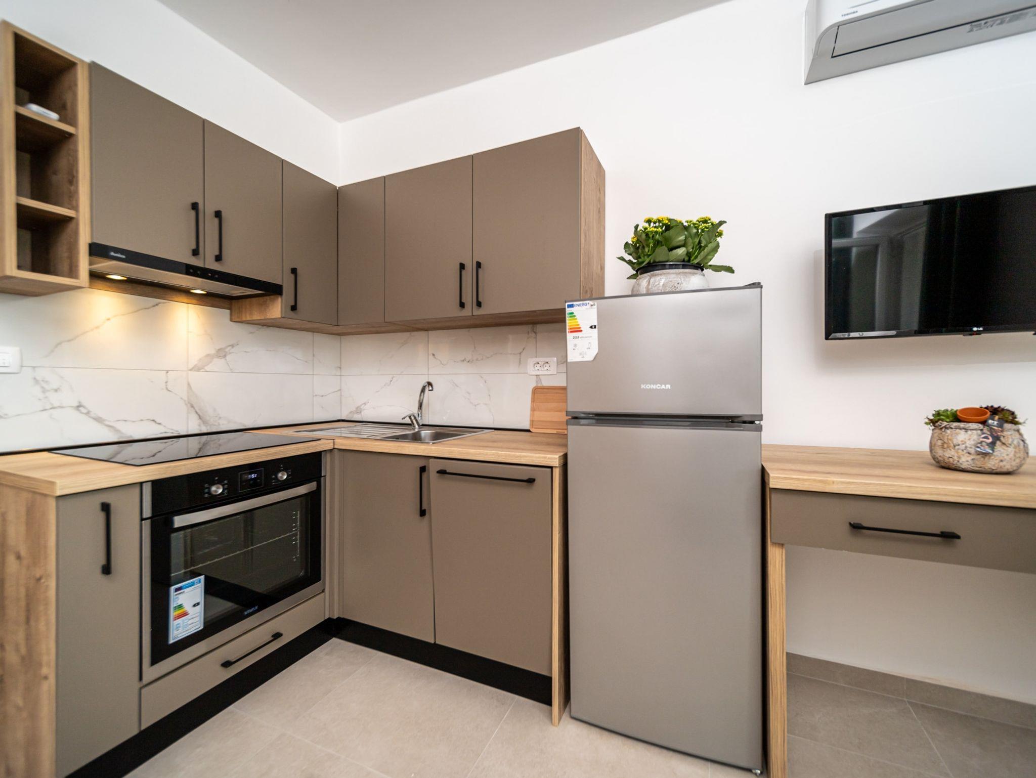 Ferienwohnung bietet Platz für 3 Gäste. Die Betten sind in Schlafzimmern, die es 1 gibt, innerhalb einer Gesamtfläche von 31m2, angeordnet. Die Gäste haben eine eigene Terrasse zur Verfügung, auf der sie in warmen Sommernächten genießen können. Das Apartment bietet Meerblick. Es ist erlaubt, Speisen auf dem Gemeinschafts-Grill vorzubereiten. IM PREIS INBEGRIFFEN: Kurtaxe, Endreinigung, Klimatisierung, Parkplatz, Internet, Bügeleisen, Föhn. VERBINDLICHE ZUSÄTZLICHE KOSTEN: Aufzahlung für Kurzaufenthalte (prozentualer Zuschlag pro Nächtigungsanzahl: 30% - 1, 20% - 2, 10% - 3). UNVERBINDLICHE ZUSÄTZLICHE KOSTEN: Bootsanlegeplatz (10,00 € pro Nacht), 2 Kinderbettchen (10,00 € Person/Tag). Die Verfügbarkeit zusätzlicher Dienstleistungen in Ihrem reservierten Termin und die Preise derselben (falls nicht aufgeführt) müssen im Voraus überprüft werden. Zusätzliche Dienstleistungen die in der Zahlungsaufforderung nicht aufgeführt sind werden direkt beim Vermieter bezahlt, angenommen der Gast nutzt auch diese.