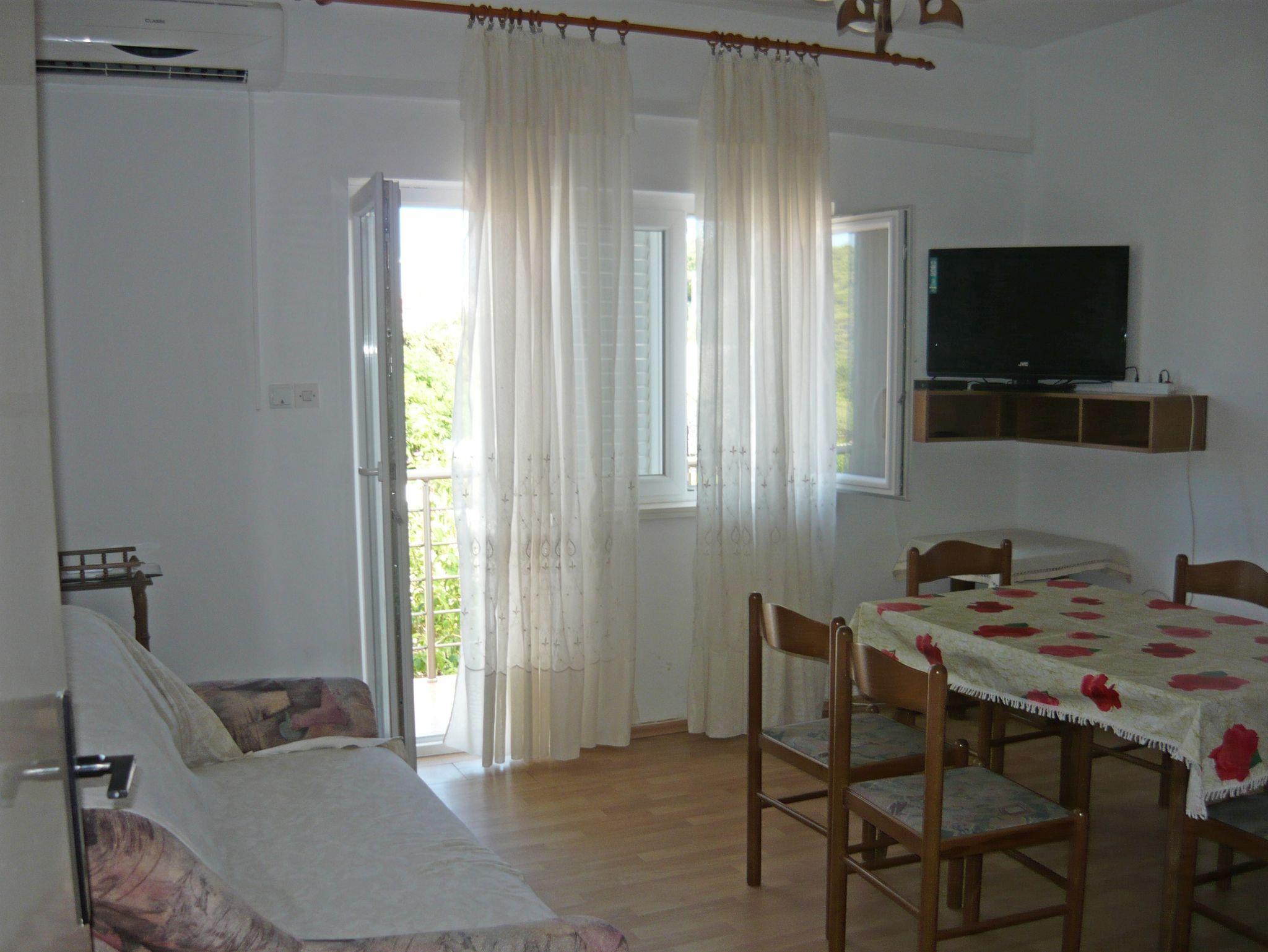 Ferienwohnung bietet Platz für 4 Gäste. Die Betten sind in Schlafzimmern, die es 2 gibt, innerhalb einer Gesamtfläche von 60m2, angeordnet. Die Gäste haben eine eigene Terrasse zur Verfügung, auf der sie in warmen Sommernächten genießen können. Das Apartment bietet Meerblick. Es ist erlaubt, Speisen auf dem Gemeinschafts-Grill vorzubereiten. Unterkunftseinheit hat Räume, die von dem Rest der Einheit abgetrennt werden. IM PREIS INBEGRIFFEN: Kurtaxe, Endreinigung, Klimatisierung, Parkplatz, Internet. VERBINDLICHE ZUSÄTZLICHE KOSTEN: Aufzahlung für Kurzaufenthalte (prozentualer Zuschlag pro Nächtigungsanzahl: 30% - 1, 20% - 2, 10% - 3). UNVERBINDLICHE ZUSÄTZLICHE KOSTEN: Wäschewaschen (5,00 € Waschen), Bootsanlegeplatz (5,00 € pro Nacht). Die Verfügbarkeit zusätzlicher Dienstleistungen in Ihrem reservierten Termin und die Preise derselben (falls nicht aufgeführt) müssen im Voraus überprüft werden. Zusätzliche Dienstleistungen die in der Zahlungsaufforderung nicht aufgeführt sind werden direkt beim Vermieter bezahlt, angenommen der Gast nutzt auch diese. Ermäßigung auf den Grundpreis: Gratistag 14=13 (bei einem Aufenthalt von 14 Tagen oder mehr erhalten Sie einen Gratistag für den Aufenthalt bis 31.12.26).