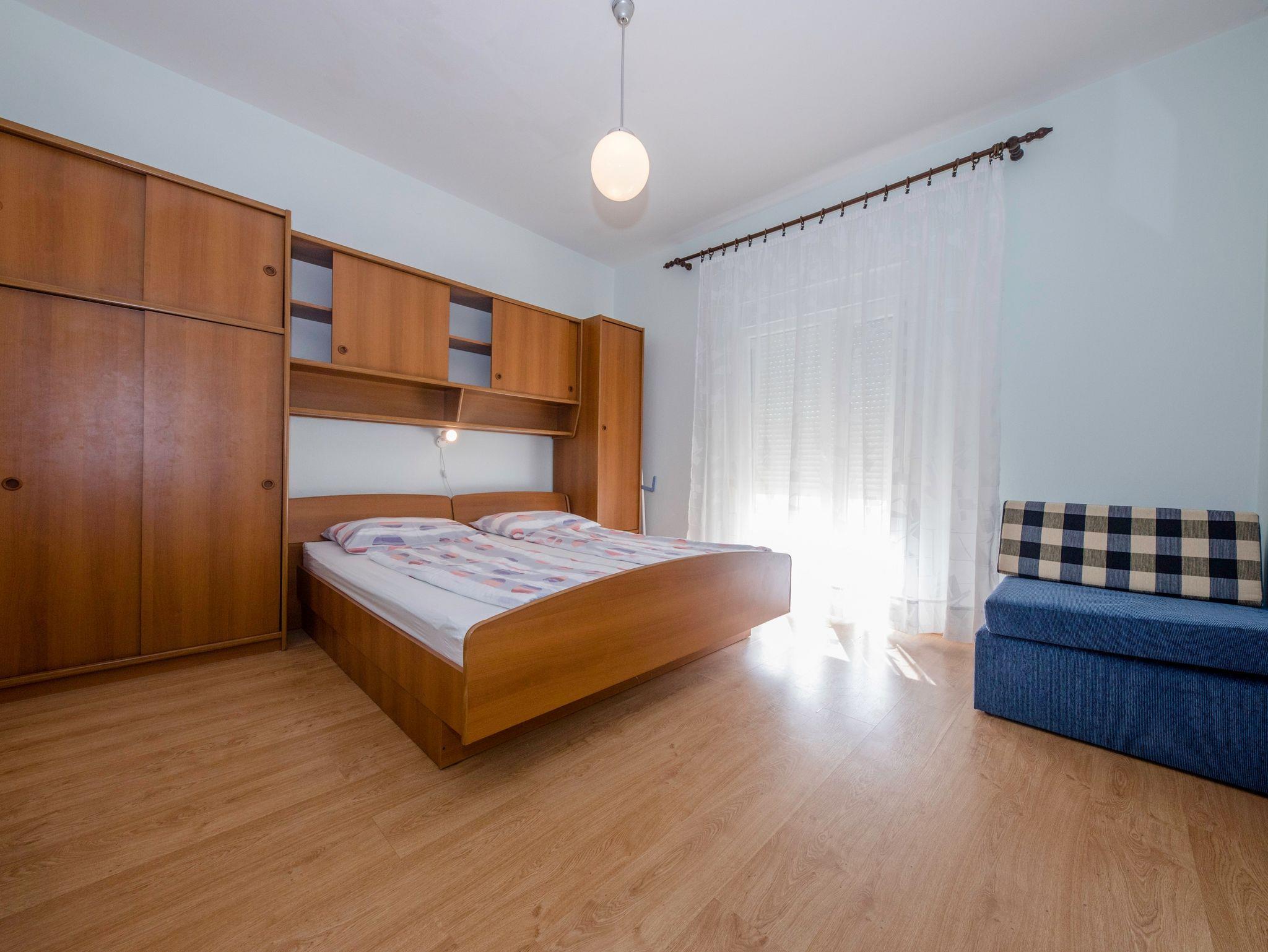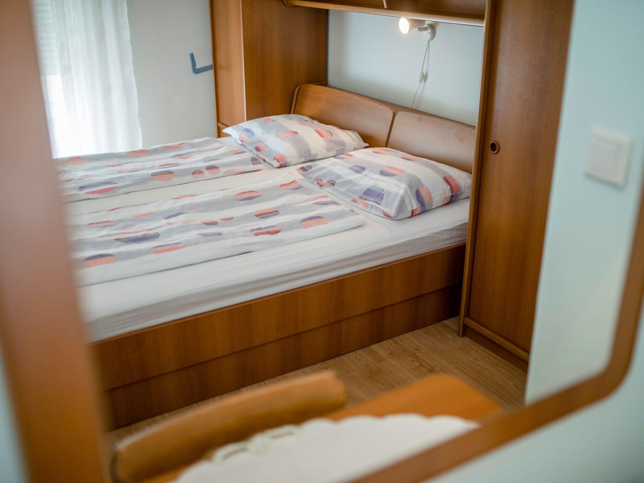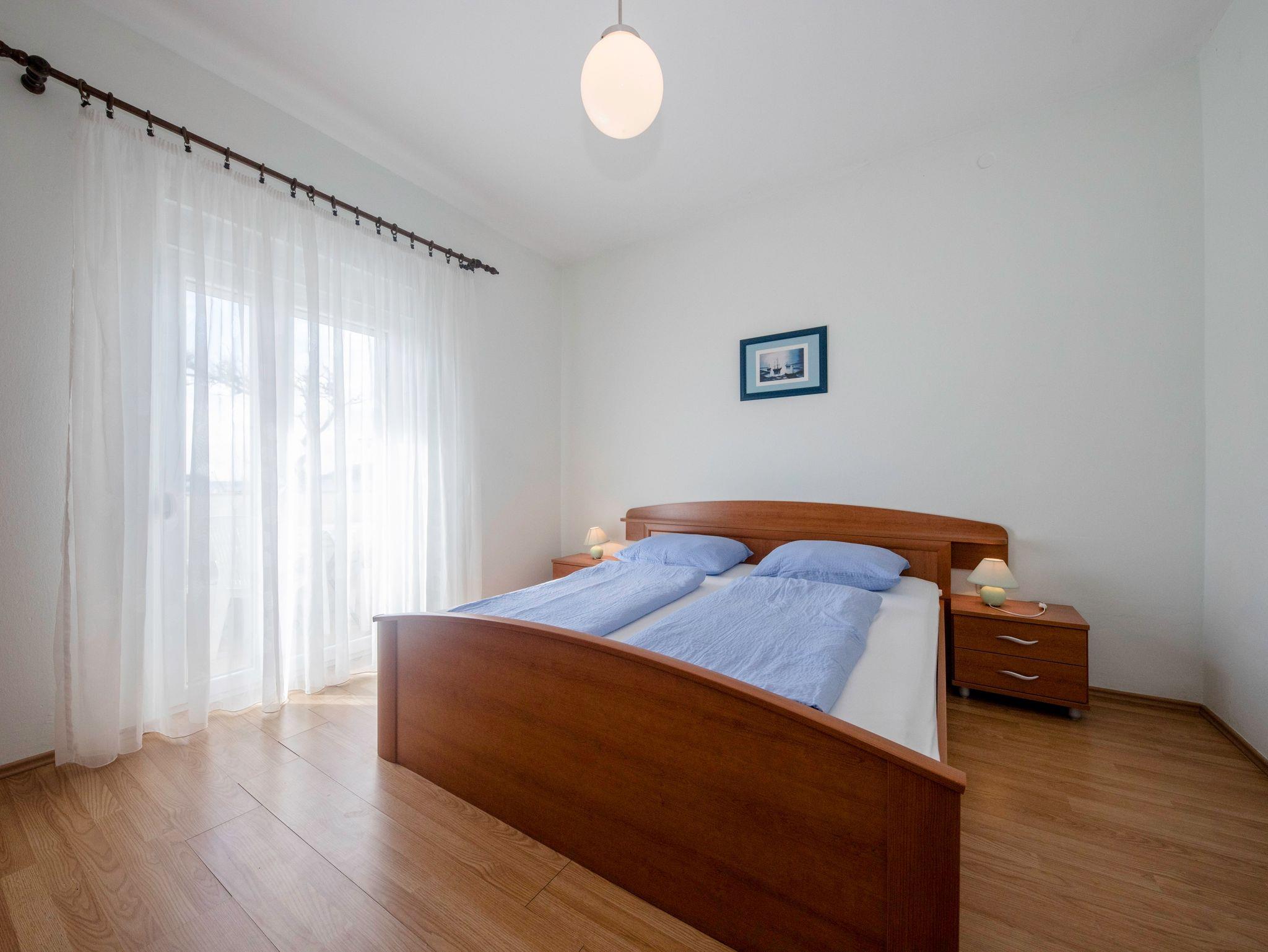 Ferienwohnung bietet Platz für 5 Gäste. Die Betten sind in Schlafzimmern, die es 2 gibt, innerhalb einer Gesamtfläche von 50m2, angeordnet. Die Gäste haben einen eigenen Balkon zur Verfügung, auf der sie in warmen Sommernächten genießen können. Das Apartment bietet Meerblick. Es ist erlaubt, Speisen auf dem Gemeinschafts-Grill vorzubereiten. In der Unterkunftseinheit besteht die Möglichkeit des Mitbringens von Haustieren gegen Aufpreis. IM PREIS INBEGRIFFEN: Kurtaxe, Endreinigung, Klimatisierung, Parkplatz, Internet, Wäschewaschen, Kinderbett, Bügeleisen, Föhn. VERBINDLICHE ZUSÄTZLICHE KOSTEN: Aufzahlung für Kurzaufenthalte (prozentualer Zuschlag pro Nächtigungsanzahl: 30% - 1, 20% - 2, 10% - 3). UNVERBINDLICHE ZUSÄTZLICHE KOSTEN: Bootsanlegeplatz (5,00 € pro Nacht), Haustiere (5,00 € pro Nacht). Die Verfügbarkeit zusätzlicher Dienstleistungen in Ihrem reservierten Termin und die Preise derselben (falls nicht aufgeführt) müssen im Voraus überprüft werden. Zusätzliche Dienstleistungen die in der Zahlungsaufforderung nicht aufgeführt sind werden direkt beim Vermieter bezahlt, angenommen der Gast nutzt auch diese.