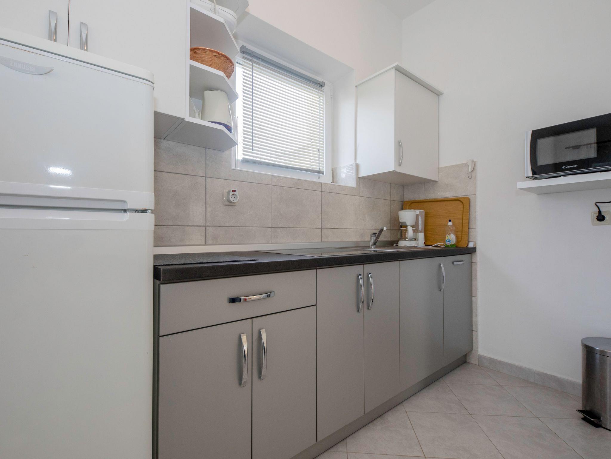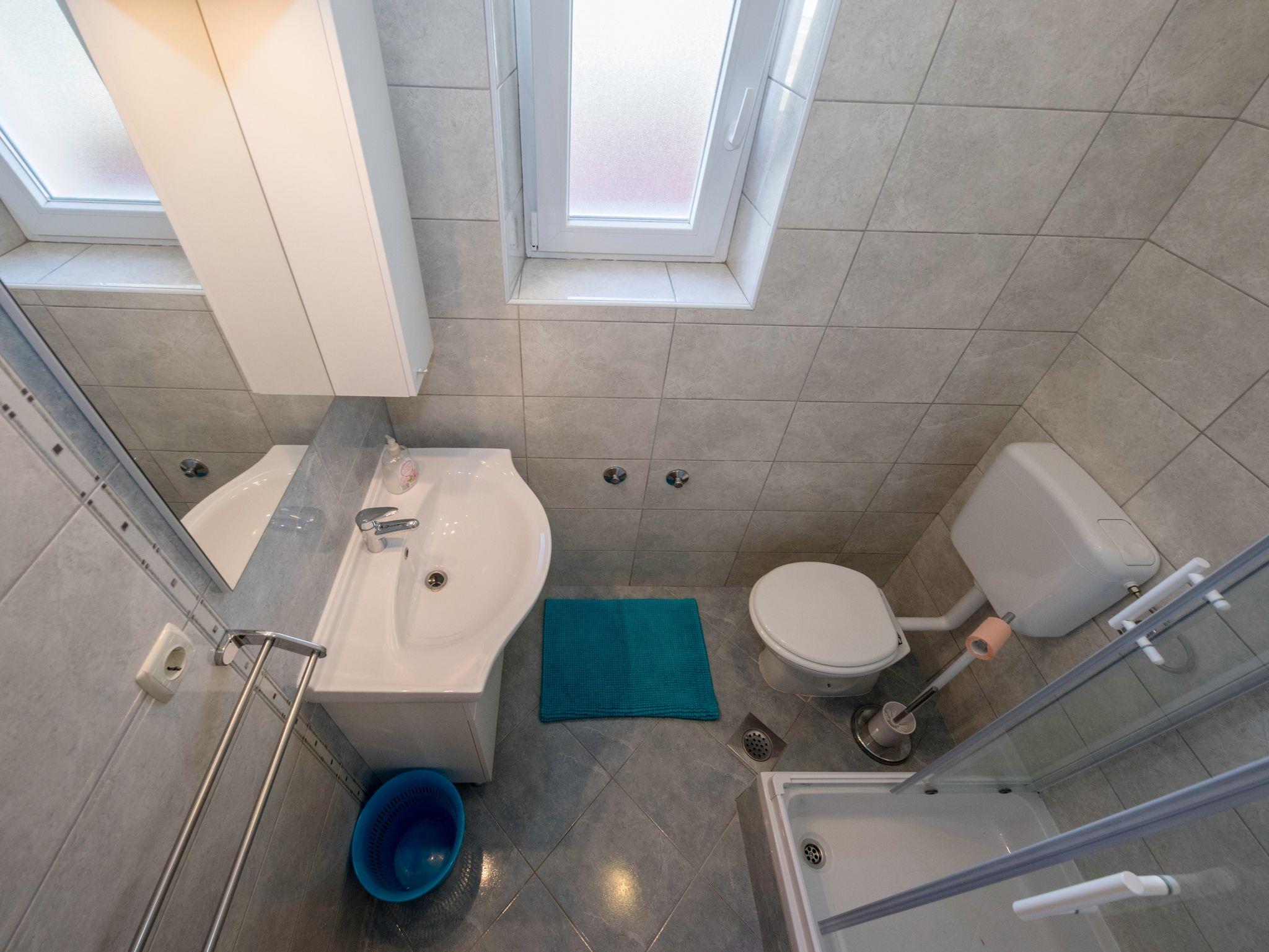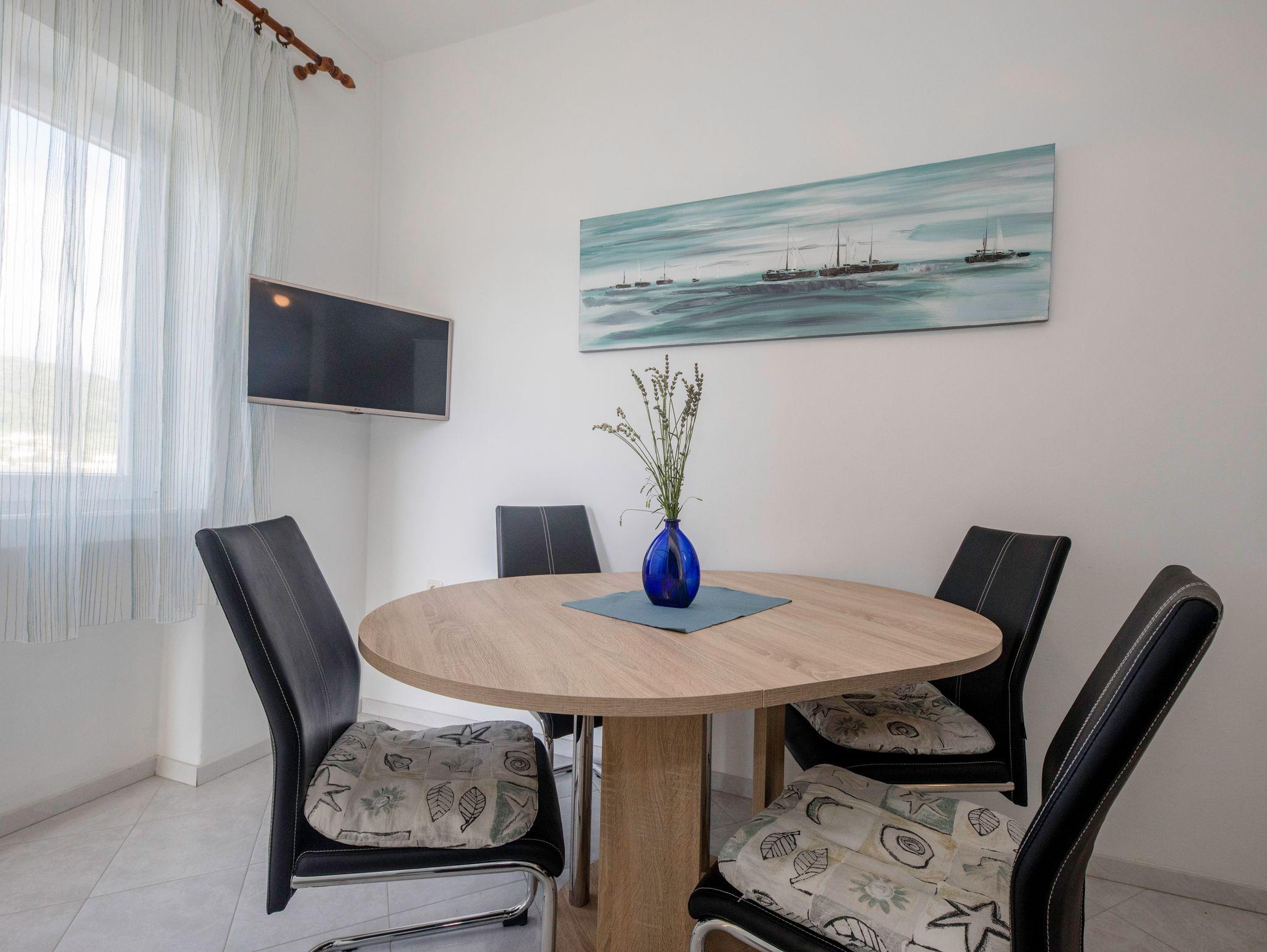 Ferienwohnung bietet Platz für 5 Gäste. Die Betten sind in Schlafzimmern, die es 2 gibt, innerhalb einer Gesamtfläche von 50m2, angeordnet. Die Gäste haben einen eigenen Balkon zur Verfügung, auf der sie in warmen Sommernächten genießen können. Das Apartment bietet Meerblick. Es ist erlaubt, Speisen auf dem Gemeinschafts-Grill vorzubereiten. In der Unterkunftseinheit besteht die Möglichkeit des Mitbringens von Haustieren gegen Aufpreis. IM PREIS INBEGRIFFEN: Kurtaxe, Endreinigung, Klimatisierung, Parkplatz, Internet, Wäschewaschen, Kinderbett, Bügeleisen, Föhn. VERBINDLICHE ZUSÄTZLICHE KOSTEN: Aufzahlung für Kurzaufenthalte (prozentualer Zuschlag pro Nächtigungsanzahl: 30% - 1, 20% - 2, 10% - 3). UNVERBINDLICHE ZUSÄTZLICHE KOSTEN: Bootsanlegeplatz (5,00 € pro Nacht), Haustiere (5,00 € pro Nacht). Die Verfügbarkeit zusätzlicher Dienstleistungen in Ihrem reservierten Termin und die Preise derselben (falls nicht aufgeführt) müssen im Voraus überprüft werden. Zusätzliche Dienstleistungen die in der Zahlungsaufforderung nicht aufgeführt sind werden direkt beim Vermieter bezahlt, angenommen der Gast nutzt auch diese.