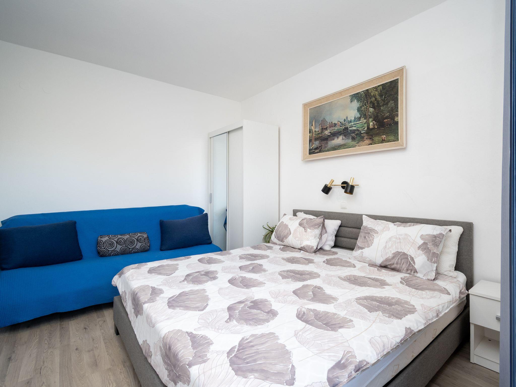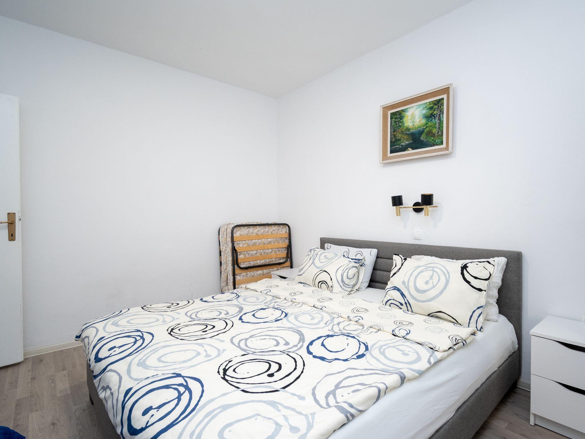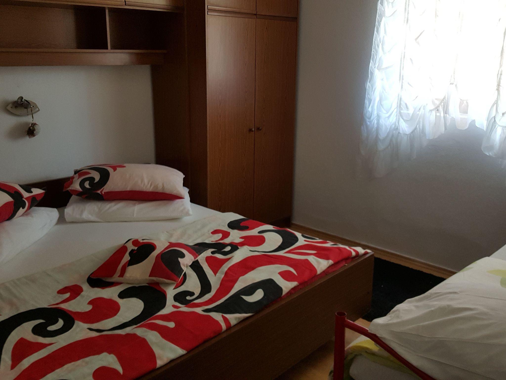 Ferienwohnung bietet Platz für 7 Gäste. Die Betten sind in Schlafzimmern, die es 2 gibt, und in Wohnzimmer, innerhalb einer Gesamtfläche von 53m2, angeordnet. Die Gäste haben eine eigene Terrasse zur Verfügung, auf der sie in warmen Sommernächten genießen können. Es ist erlaubt, Speisen auf dem Gemeinschafts-Grill vorzubereiten. In der Unterkunftseinheit besteht die Möglichkeit des Mitbringens von Haustieren gegen Aufpreis. IM PREIS INBEGRIFFEN: Kurtaxe, Endreinigung, Klimatisierung, Parkplatz, Internet, Bügeleisen, Bügelbrett, Föhn, Sonnenschirm. VERBINDLICHE ZUSÄTZLICHE KOSTEN: Aufzahlung für Kurzaufenthalte (prozentualer Zuschlag pro Nächtigungsanzahl: 30% - 1, 20% - 2, 10% - 3). UNVERBINDLICHE ZUSÄTZLICHE KOSTEN: Haustiere (5,00 € pro Nacht). Die Verfügbarkeit zusätzlicher Dienstleistungen in Ihrem reservierten Termin und die Preise derselben (falls nicht aufgeführt) müssen im Voraus überprüft werden. Zusätzliche Dienstleistungen die in der Zahlungsaufforderung nicht aufgeführt sind werden direkt beim Vermieter bezahlt, angenommen der Gast nutzt auch diese.