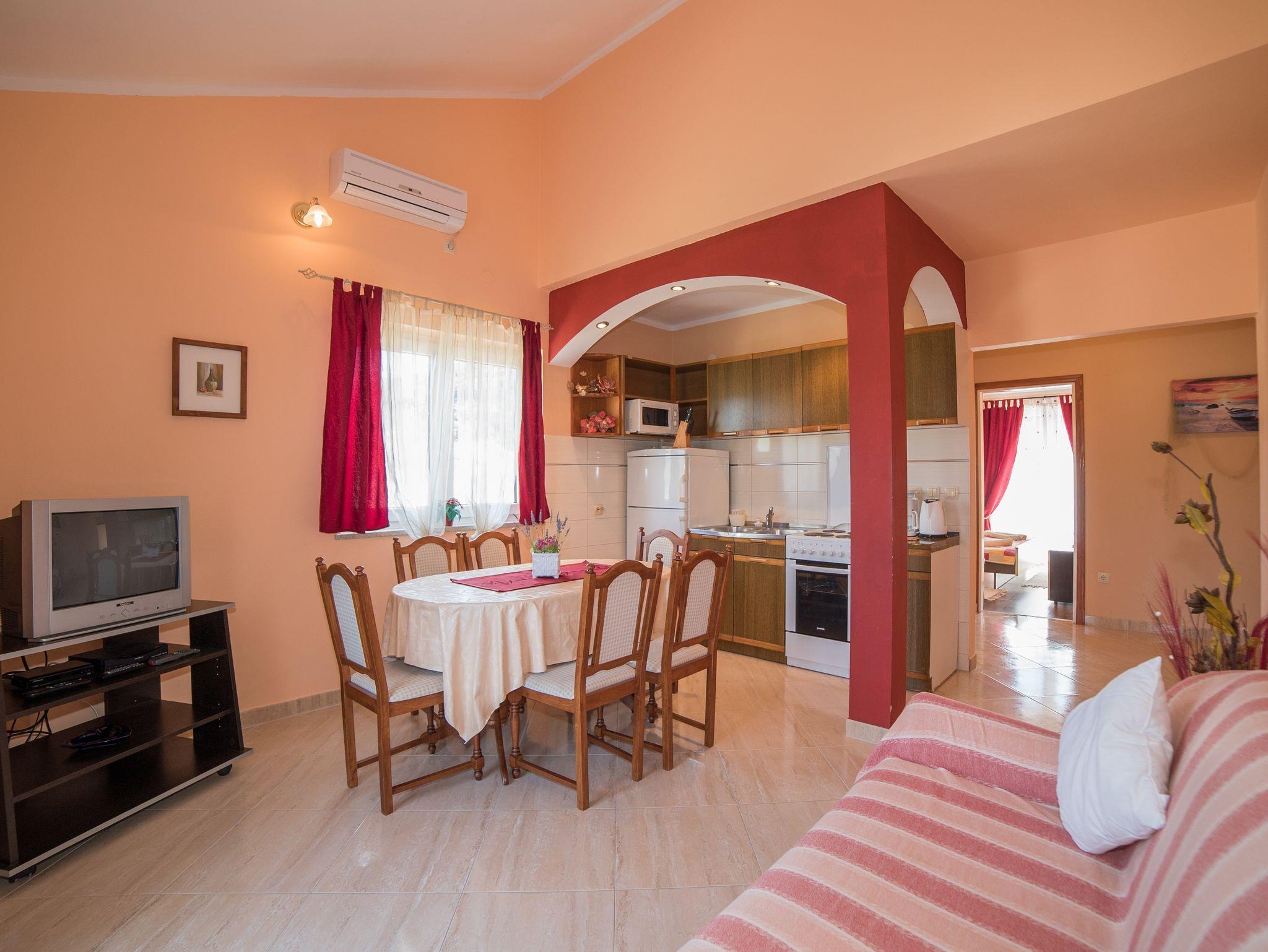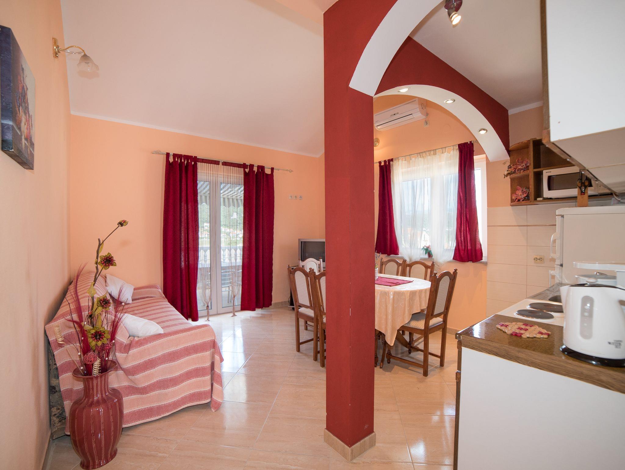 Ferienwohnung bietet Platz für 5 Gäste. Die Betten sind in Schlafzimmern, die es 2 gibt, und in Wohnzimmer, innerhalb einer Gesamtfläche von 46m2, angeordnet. Die Gäste haben eine eigene Terrasse zur Verfügung, auf der sie in warmen Sommernächten genießen können. Das Apartment bietet Meerblick. Es ist erlaubt, Speisen auf dem Gemeinschafts-Grill vorzubereiten. In der Unterkunftseinheit besteht die Möglichkeit des Mitbringens von Haustieren gegen Aufpreis. IM PREIS INBEGRIFFEN: Kurtaxe, Endreinigung, Klimatisierung, Parkplatz, Internet, Föhn. VERBINDLICHE ZUSÄTZLICHE KOSTEN: Aufzahlung für Kurzaufenthalte (prozentualer Zuschlag pro Nächtigungsanzahl: 30% - 1, 20% - 2, 10% - 3). UNVERBINDLICHE ZUSÄTZLICHE KOSTEN: Wäschewaschen (10,00 € Waschen), Bootsanlegeplatz (20,00 € pro Nacht), Haustiere (10,00 € pro Nacht), Zusatzbett (10,00 € pro Nacht). Die Verfügbarkeit zusätzlicher Dienstleistungen in Ihrem reservierten Termin und die Preise derselben (falls nicht aufgeführt) müssen im Voraus überprüft werden. Zusätzliche Dienstleistungen die in der Zahlungsaufforderung nicht aufgeführt sind werden direkt beim Vermieter bezahlt, angenommen der Gast nutzt auch diese.
