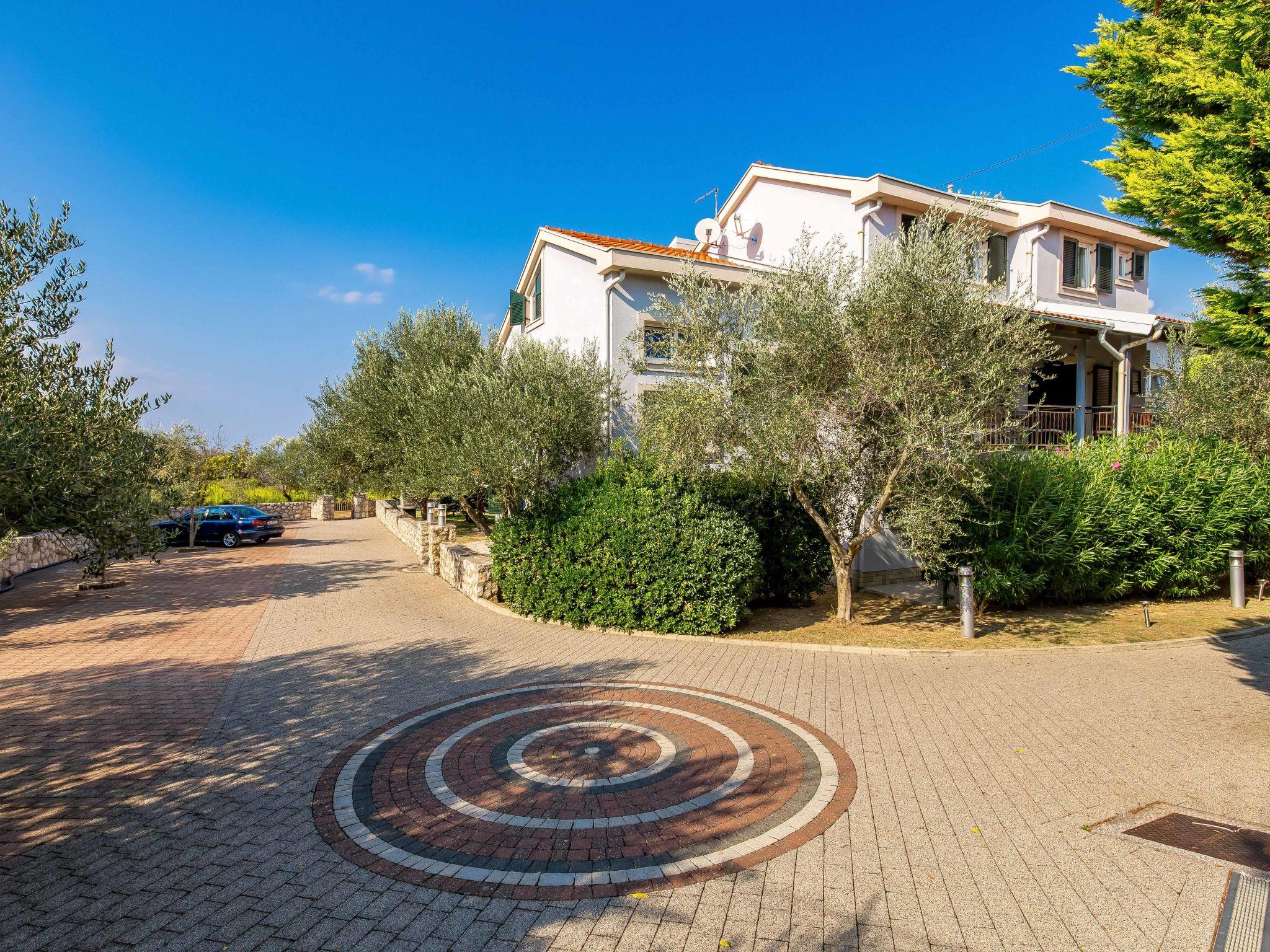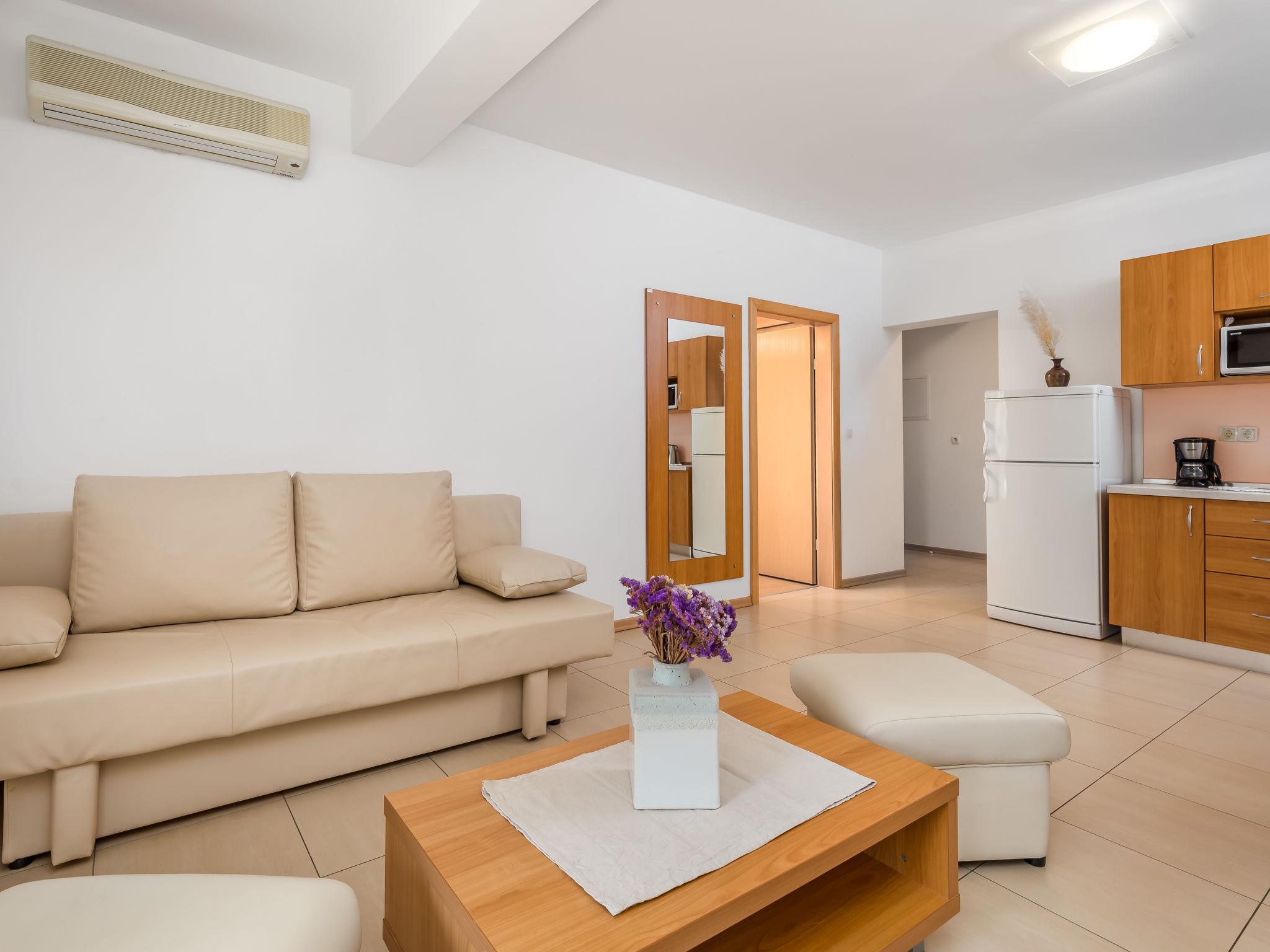 "Mare 7", 2-room apartment 40 m2 on 1st floor. Beautiful and modern furnishings: living/dining room 18 m2 with 1 double sofabed, satellite TV and air conditioning. Exit to the terrace. 1 room with 1 double bed (160 cm, length 200 cm). Open kitchen (4 hot plates, microwave, freezer). Shower/WC. Terrace 8 m2, roofed. Terrace furniture. View of the swimming pool and the garden. Facilities: safe. Internet (WiFi, free). Parking.