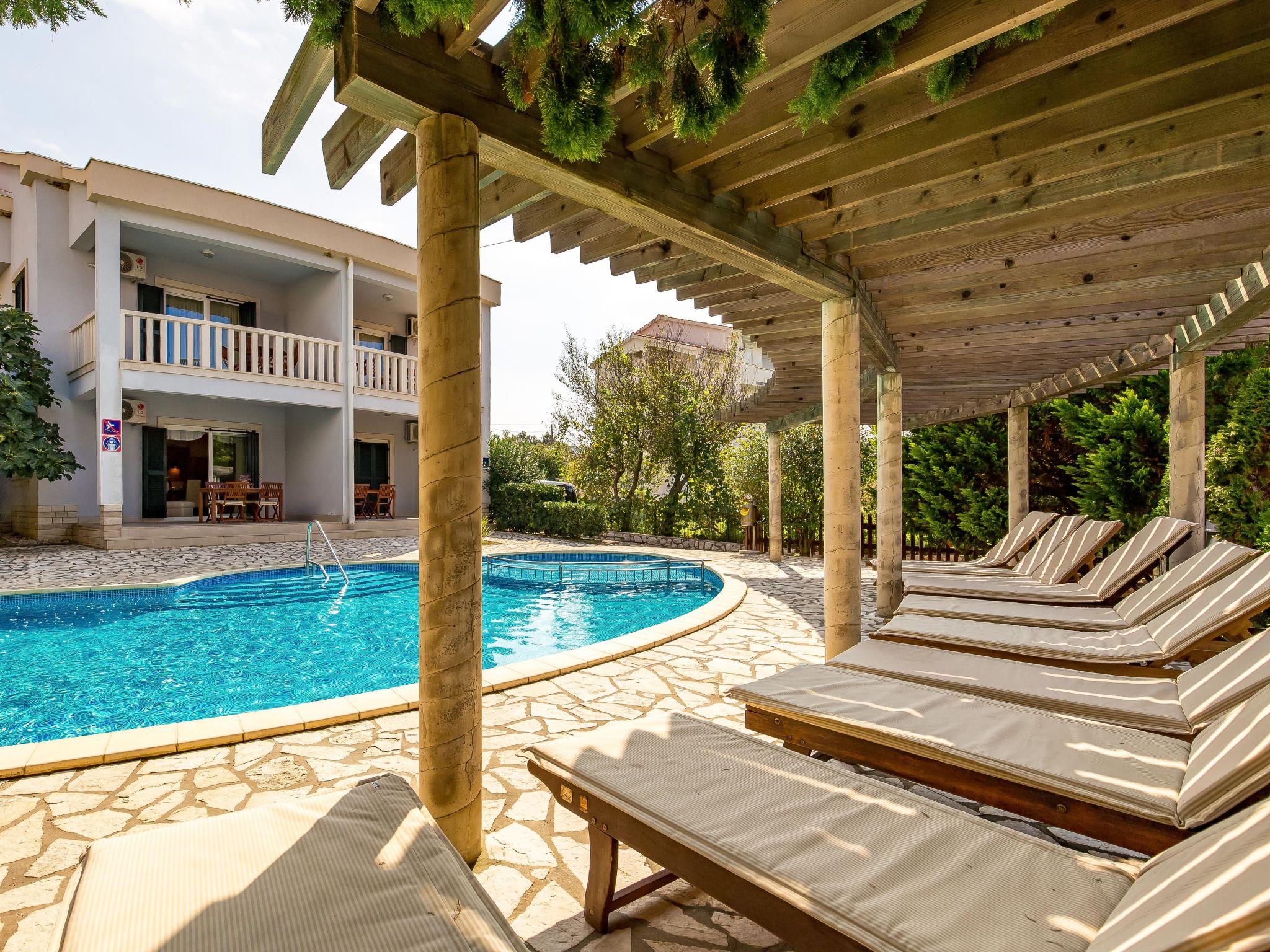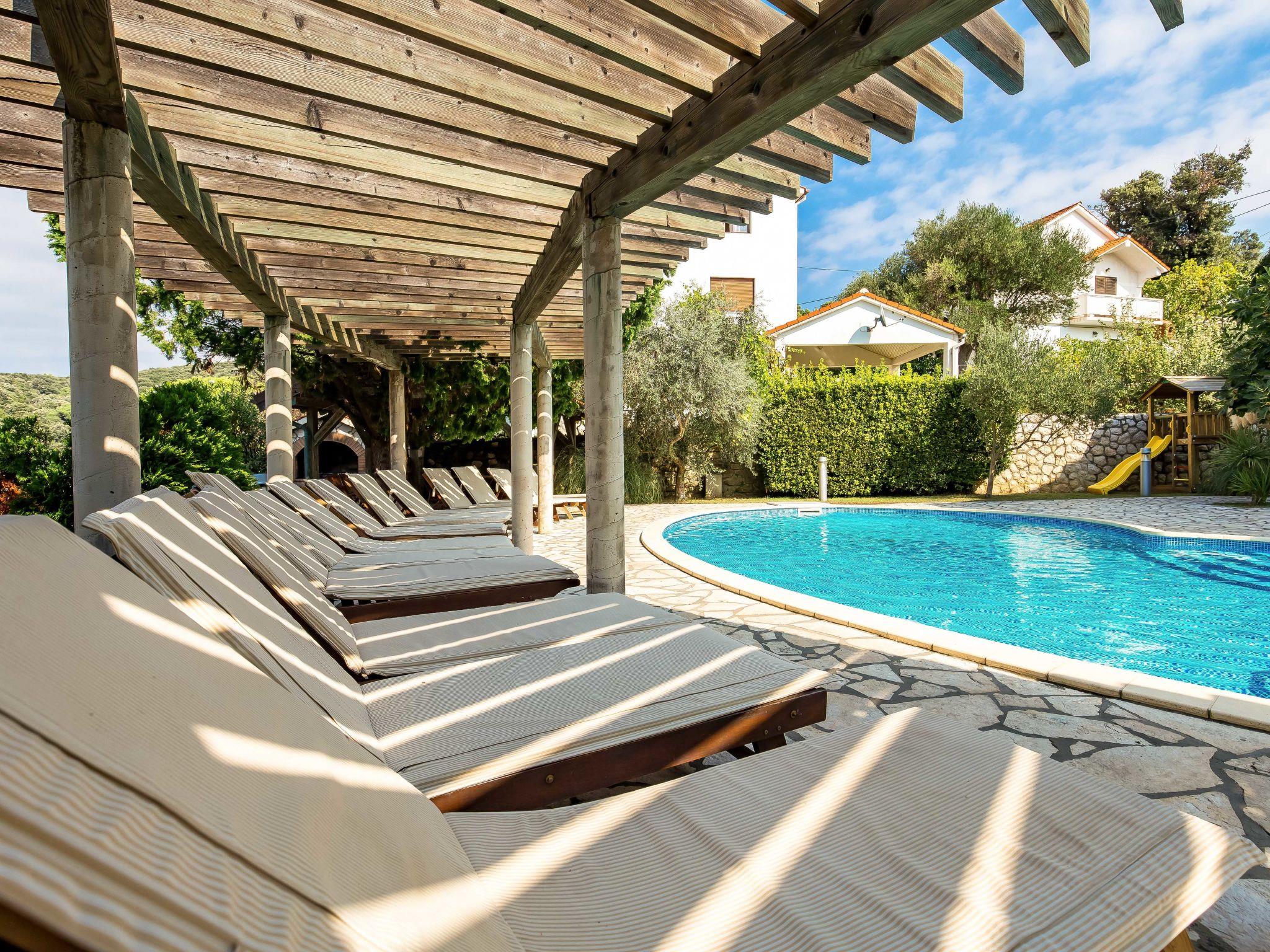 Kampor 6 km from Rab: Child friendly apartment block. In a quiet, sunny position, 40 m from the sea, 40 m from the beach. For shared use: property (fenced), well-kept garden with lawn, swimming pool kidney-shaped heated (12 x 6 m, depth 120 - 160 cm, seasonal availability: 13.May. - 30.Sep.) with internal staircase. Children's pool, outdoor shower, arbour, garden furniture, barbecue. In the house: internet access. Parking. Shop, restaurant 150 m, bus stop 2.4 km, concrete beach 40 m. Please note: the photograph shows a typical example. Additional accommodations can be booked. Property ref. HR3703.620 is situated on the same property. The apartment house "Tomislav" is situated on the same grounds (2700 m2) with the apartment house "Mare", with swimming pool for shared use with counterflow. One part of the pool is a paddling pool, depth 30 - 60 cm. Deck chairs at disposal. Concrete beach with sand sea bottom, slightly sloping, very suitable for children 40 m from the house.
