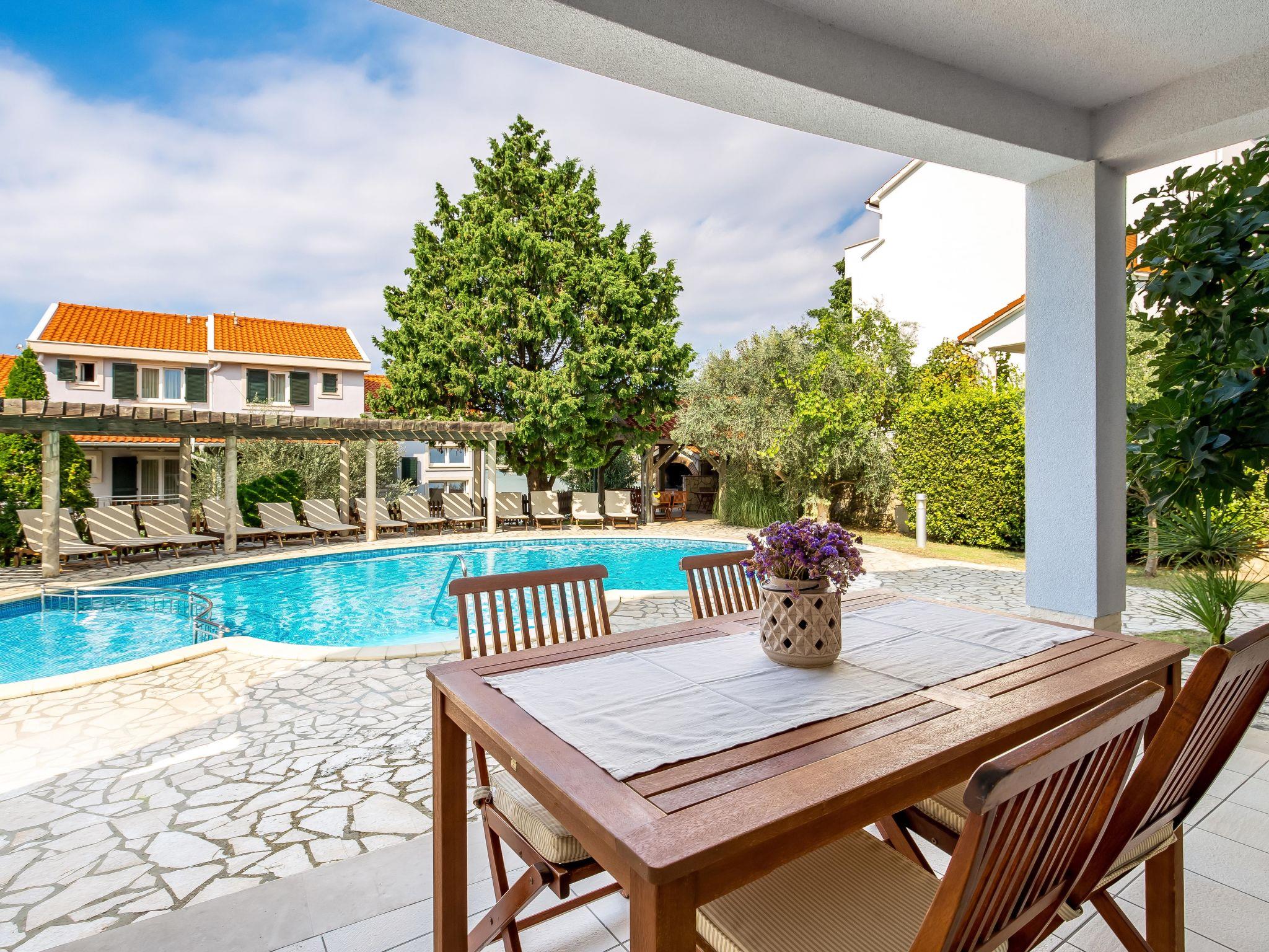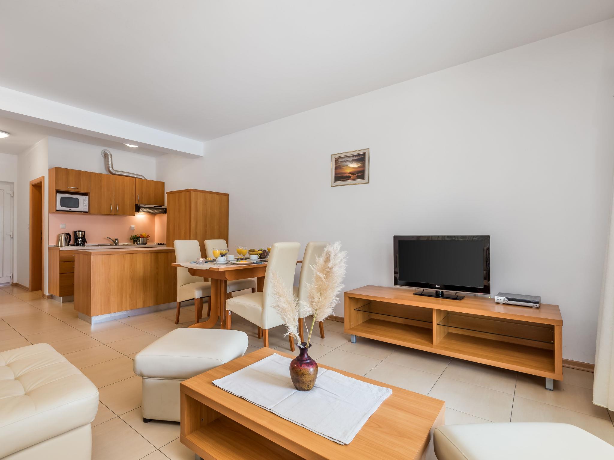 "Tomislav 2", 2-room apartment 48 m2, on the ground floor. Modern and cosy furnishings: living/dining room 30 m2 with 1 double sofabed (145 cm, length 195 cm), satellite TV and air conditioning. Exit to the terrace, to the swimming pool. 1 room with 1 double bed (160 cm, length 200 cm). Exit to the terrace. Open kitchen (4 hot plates, microwave, freezer). Shower/WC. Terrace 12 m2, roofed. Terrace furniture. View of the swimming pool. Facilities: safe. Internet (WiFi, free). Parking.