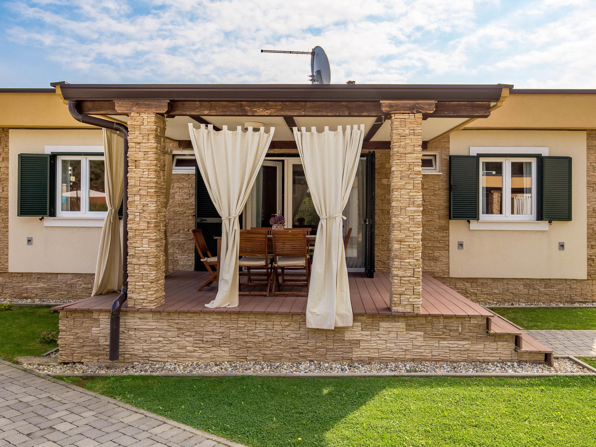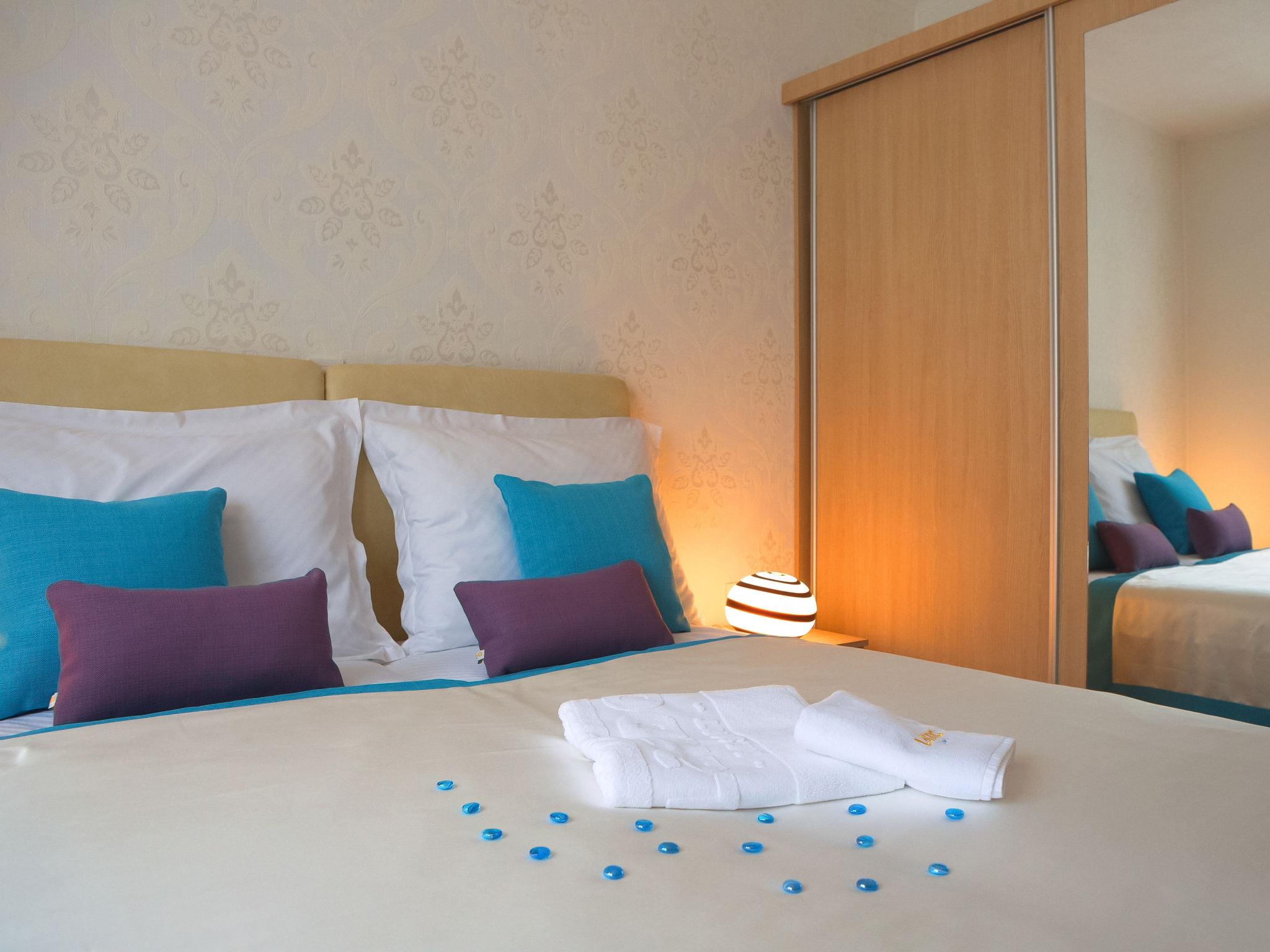 "Superior", 3-room house 50 m2. Beautiful furnishings: living/dining room with 1 double sofabed (160 cm, length 190 cm), satellite TV (flat screen), air conditioning. Exit to the terrace. 2 rooms, each room with 1 double bed (2 x 80 cm, length 200 cm). Open kitchen (oven, dishwasher, 4 ceramic glass hob hotplates, microwave, freezer, electric coffee machine). 2 showers/WC. Terrace 20 m2, roofed. Terrace furniture. Facilities: Internet (WiFi, free).