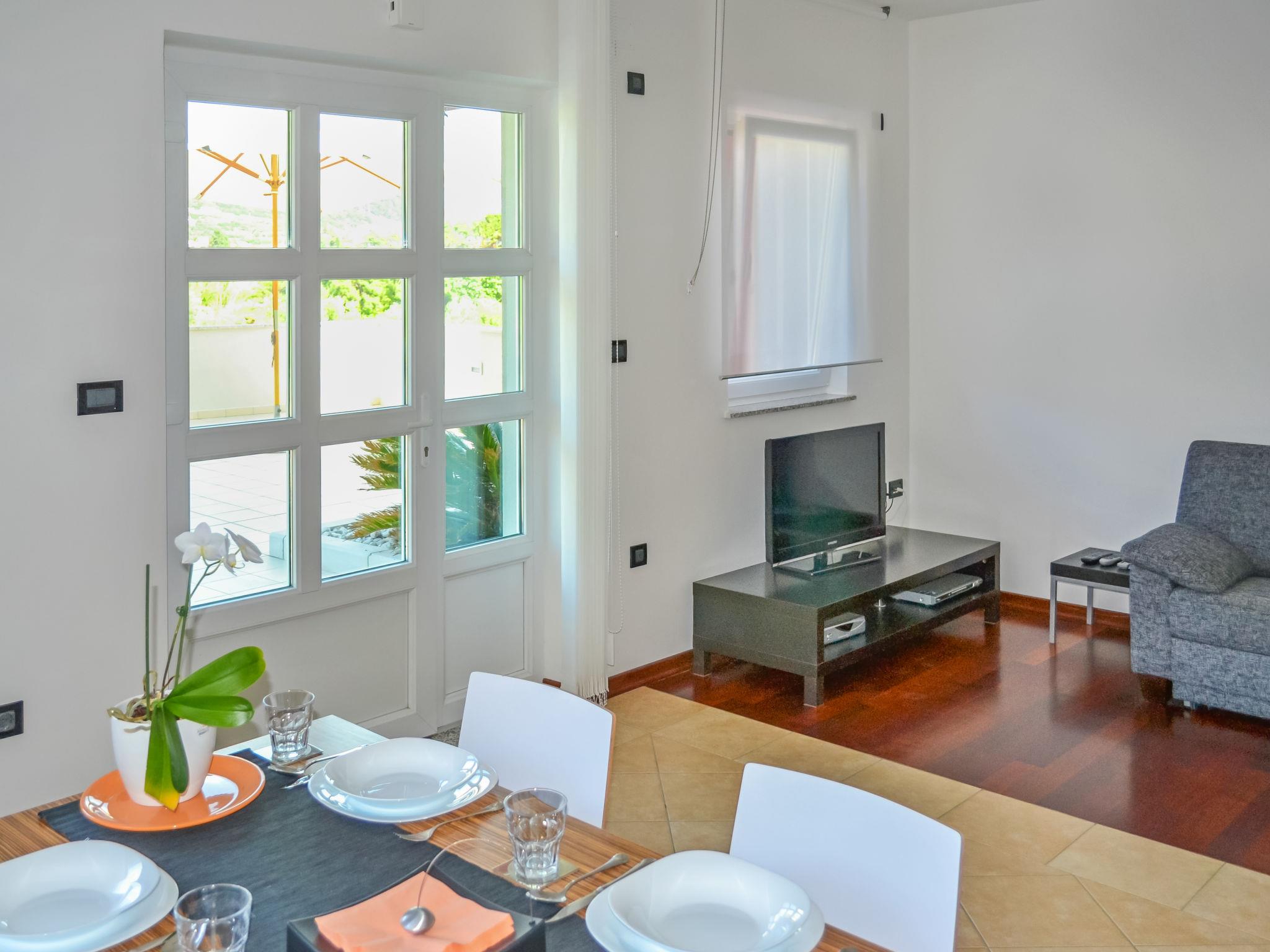 3-room apartment 65 m2, on the ground floor, east facing position. Comfortable and beautiful furnishings: living/dining room 26 m2 with satellite TV and air conditioning. Exit to the terrace. 1 room with 1 double bed (2 x 80 cm, length 200 cm). 1 room with 1 bed (90 cm, length 200 cm). Open kitchen (4 hot plates, oven, freezer). Shower/WC. Terrace 30 m2. Terrace furniture. View of the sea. Facilities: Internet (WiFi, free). Parking (roofed, 1 car). Please note: private entrance.