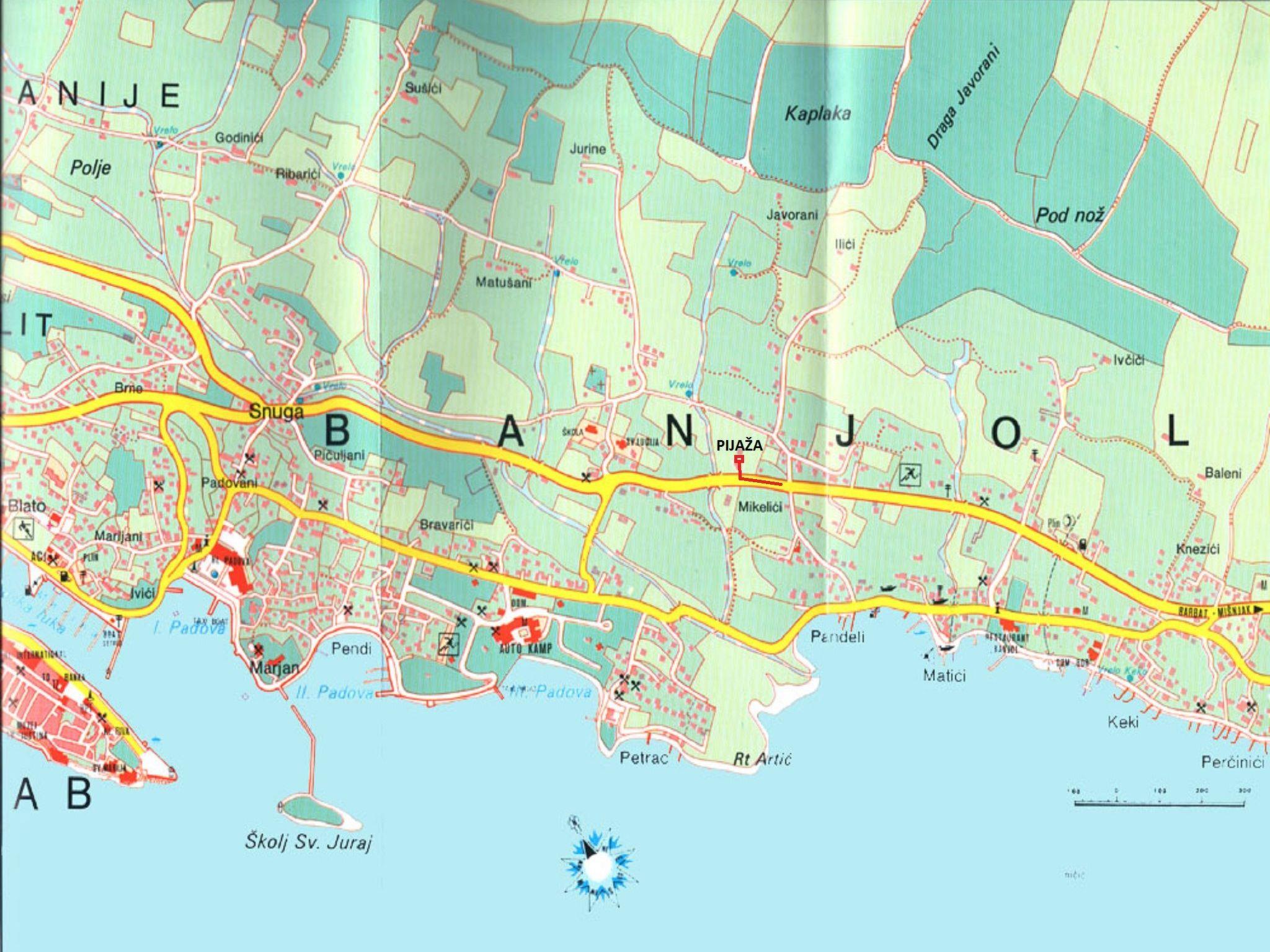 The location of our flats in Banjol offers the perfect starting point for exploring the island of Rab. A supermarket, bakery, exchange office and restaurants are in the immediate vicinity (750 to 1000 metres). The nearest beach is only 750 metres away. You can also reach the town in 35 minutes on foot along the picturesque coast or in just 5 minutes by car, where you can experience the island's culture, history and gastronomy.