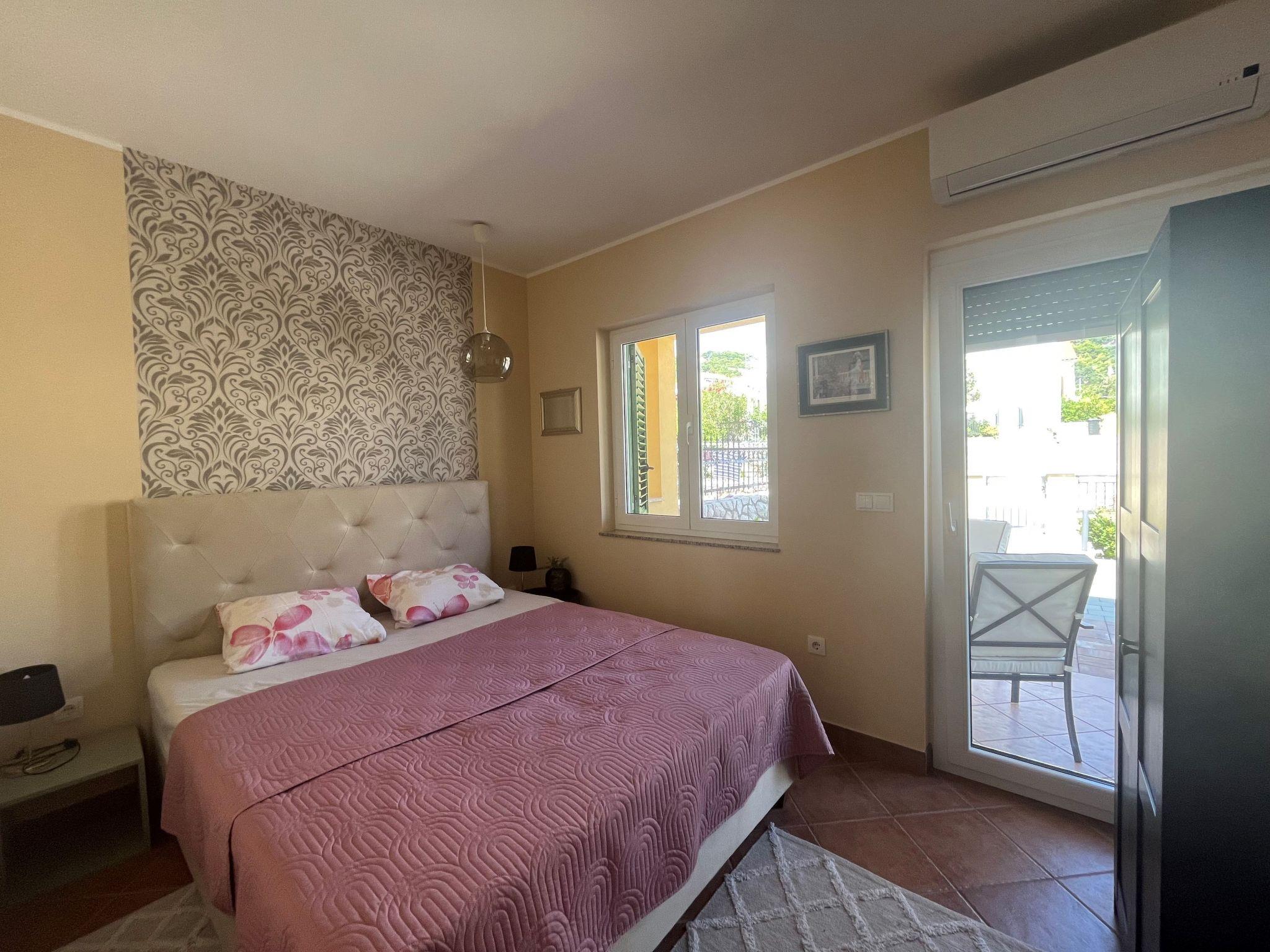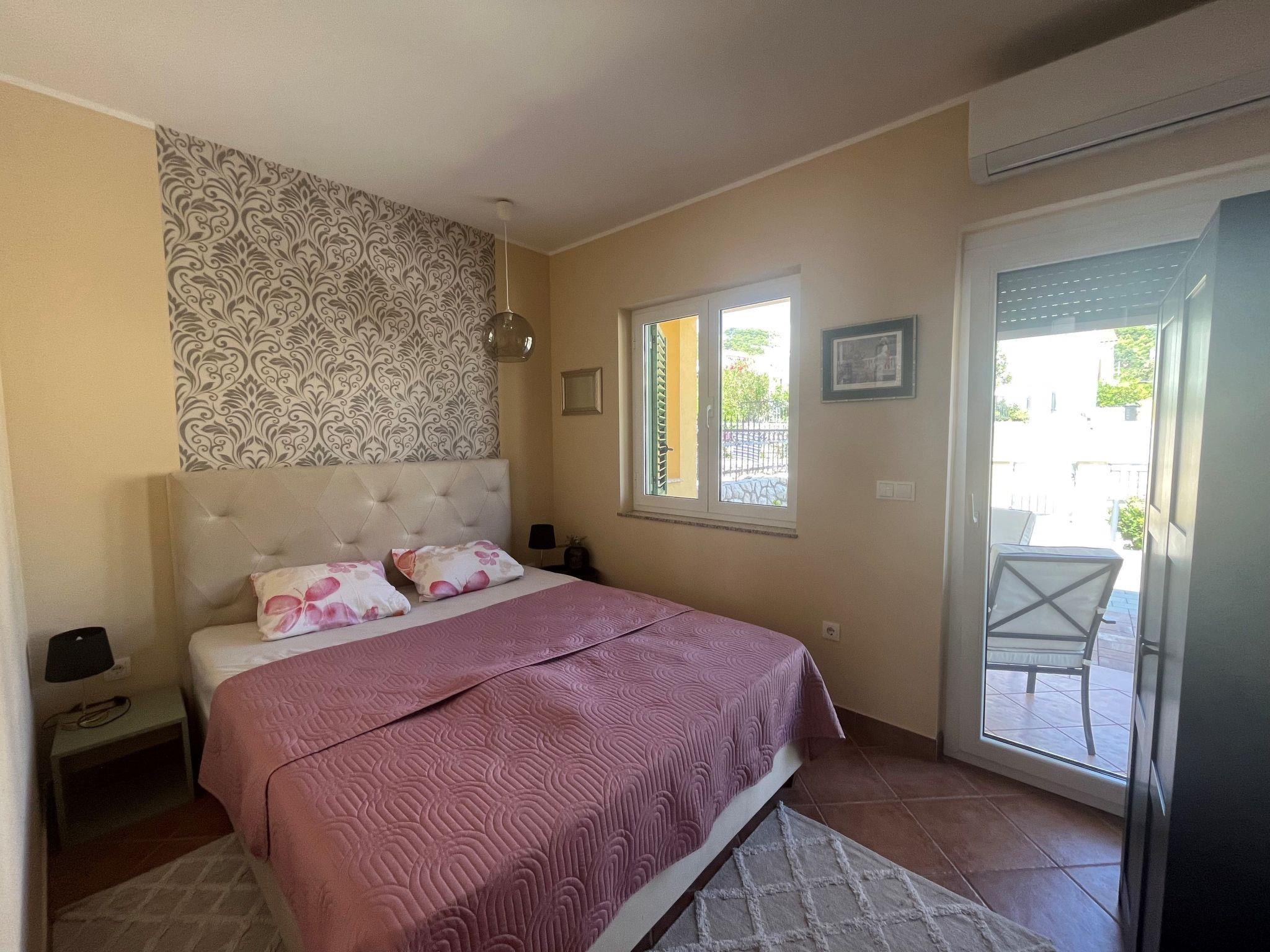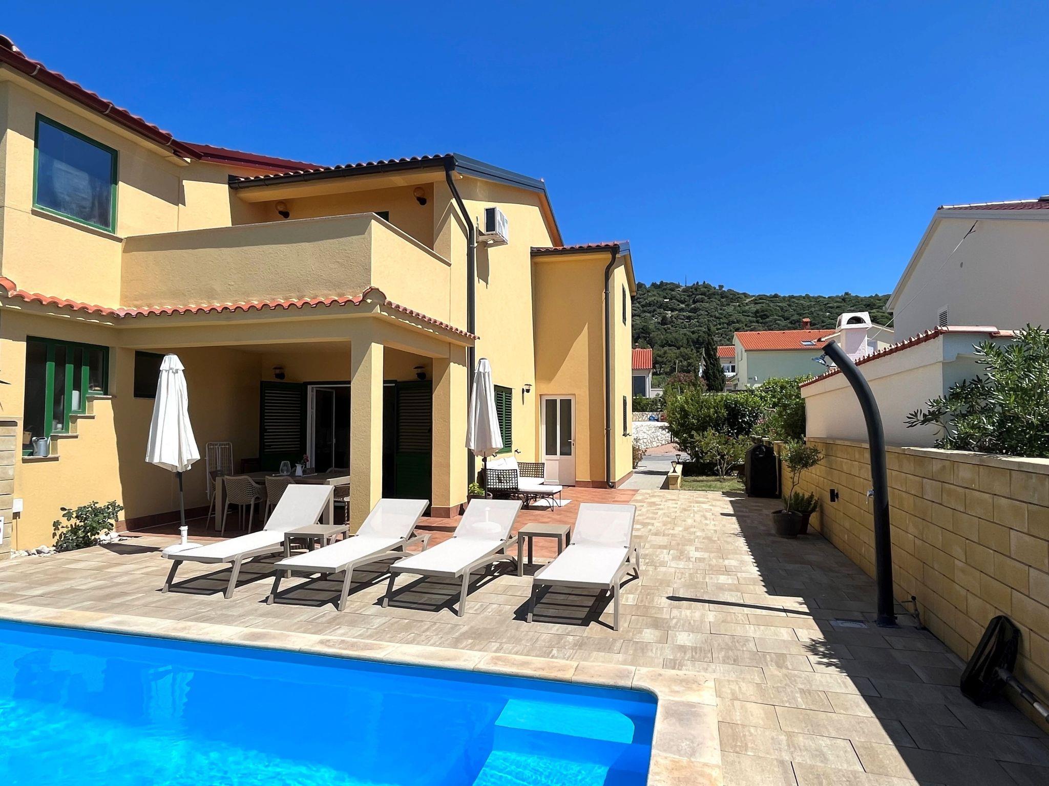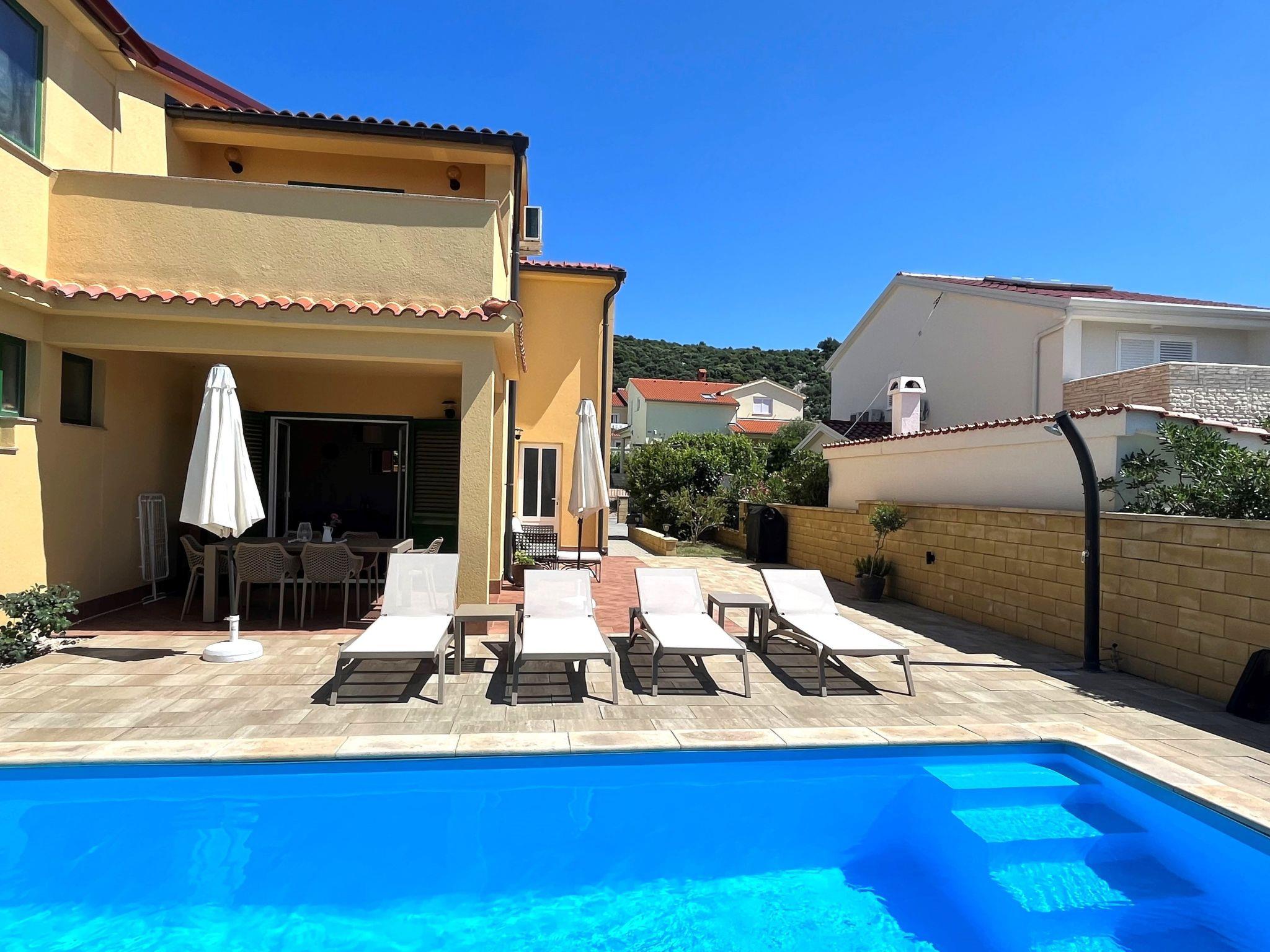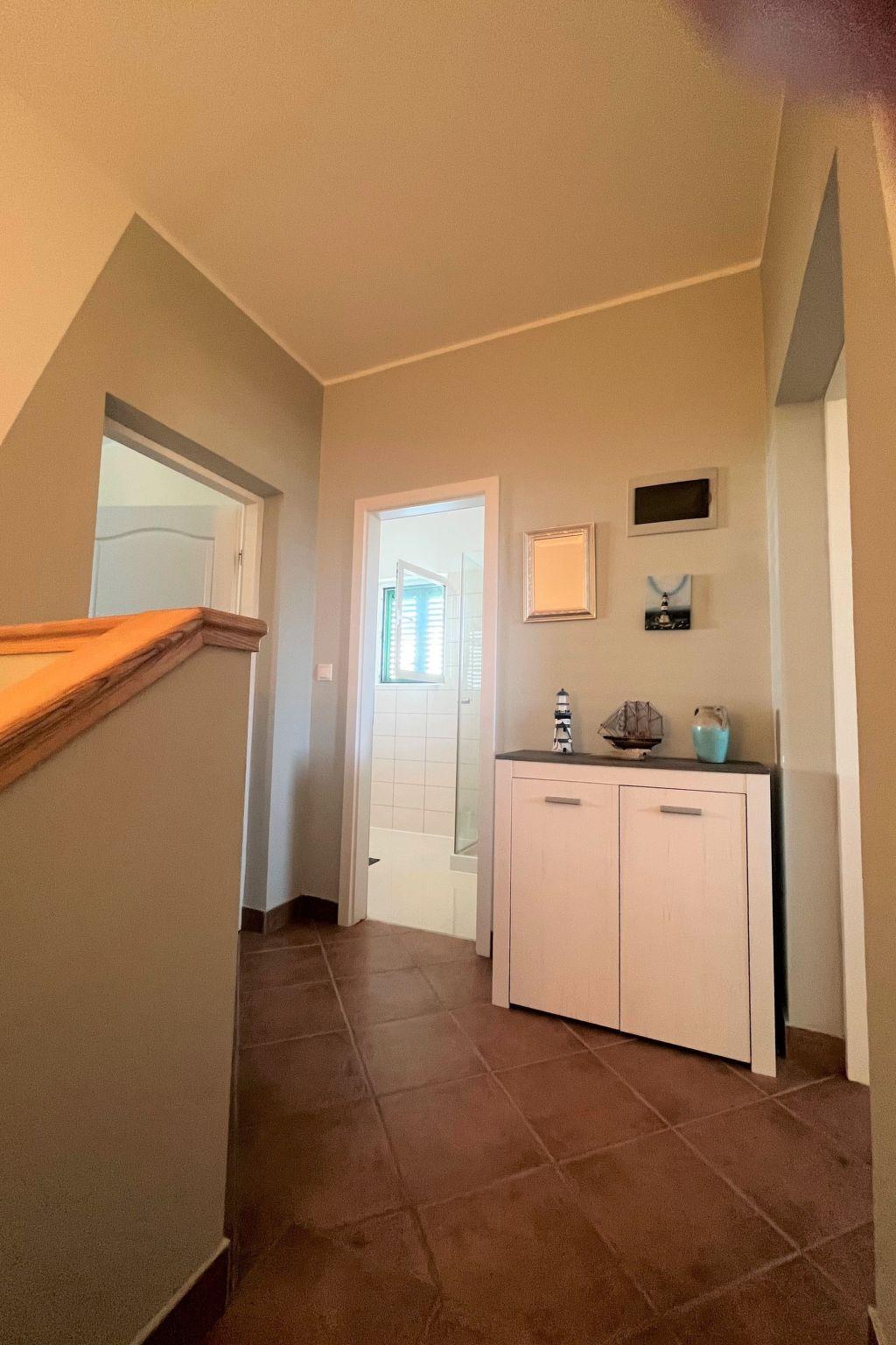 Holiday house " Summer escape 2" is a charming holiday home with pool , located on island Rab, one of the most beautiful island on the Adriatic. This home is in the village Barbat , situated just 70 meters from the beautiful sandy beaches. The highlights of this great villa is a huge , nice private garden with a pool. Also, there is the sea view, which can be enjoyed from the bedroom on the first floor, or the hill view from the second bedroom. This home is ideal for 6 persons. The open ground floor offers a living room with the kitchen, from where you have direct access to the pool and the covered terrace. A bedroom with double bed and own bathroom is also situated on the ground floor and has direct access to the private terrace. In the morning, you can use direct access to the pool from the ground floor , and enjoy in the swimming directly from the bed. On the first floor there are 2 bedrooms and one bathroom . All bedrooms have air conditioner. All bedrooms on the first floor have terraces from where a beautiful view extends over the surroundings .
