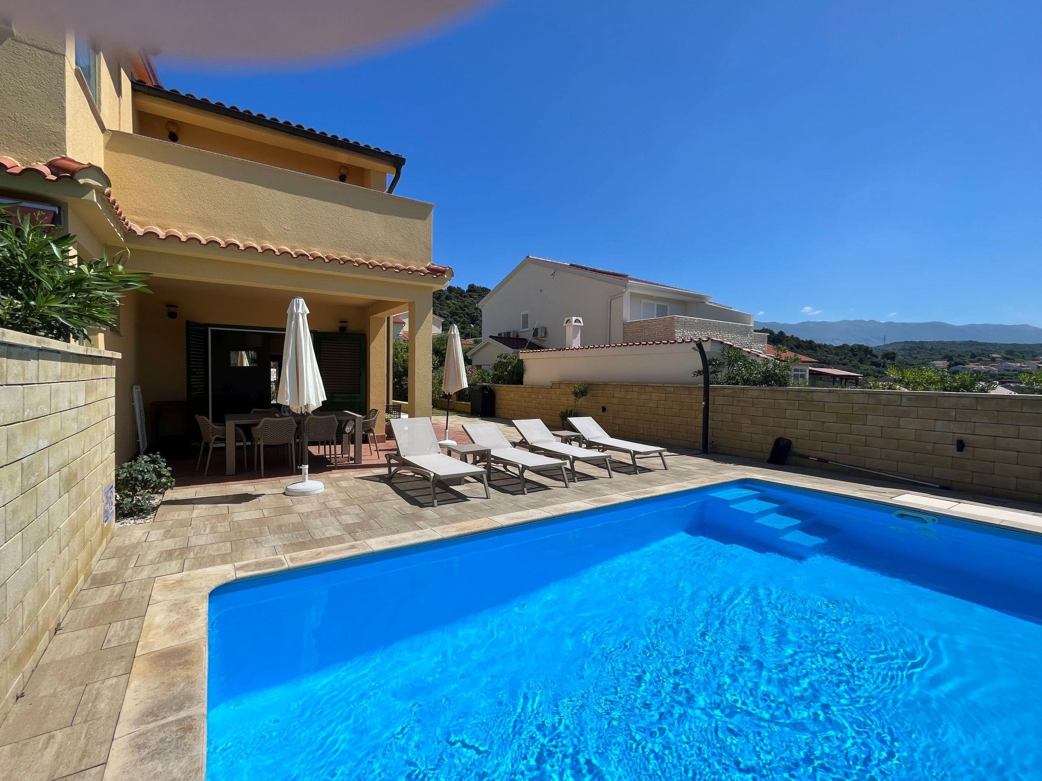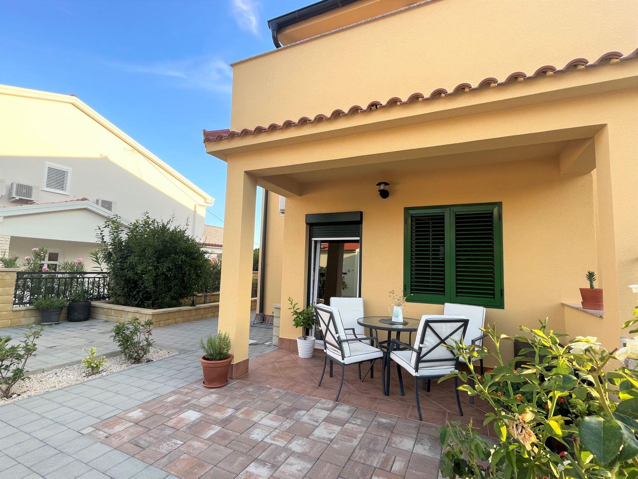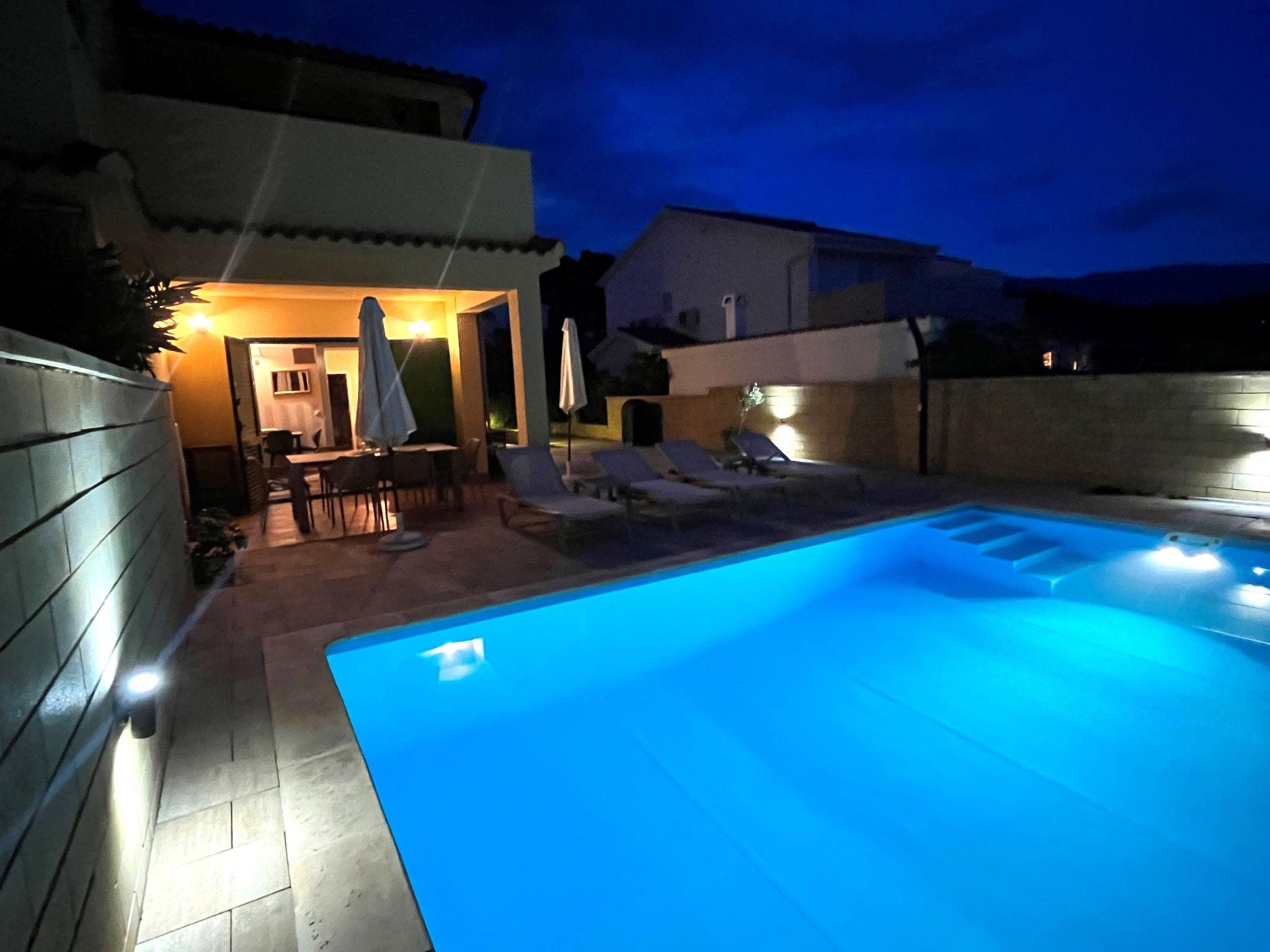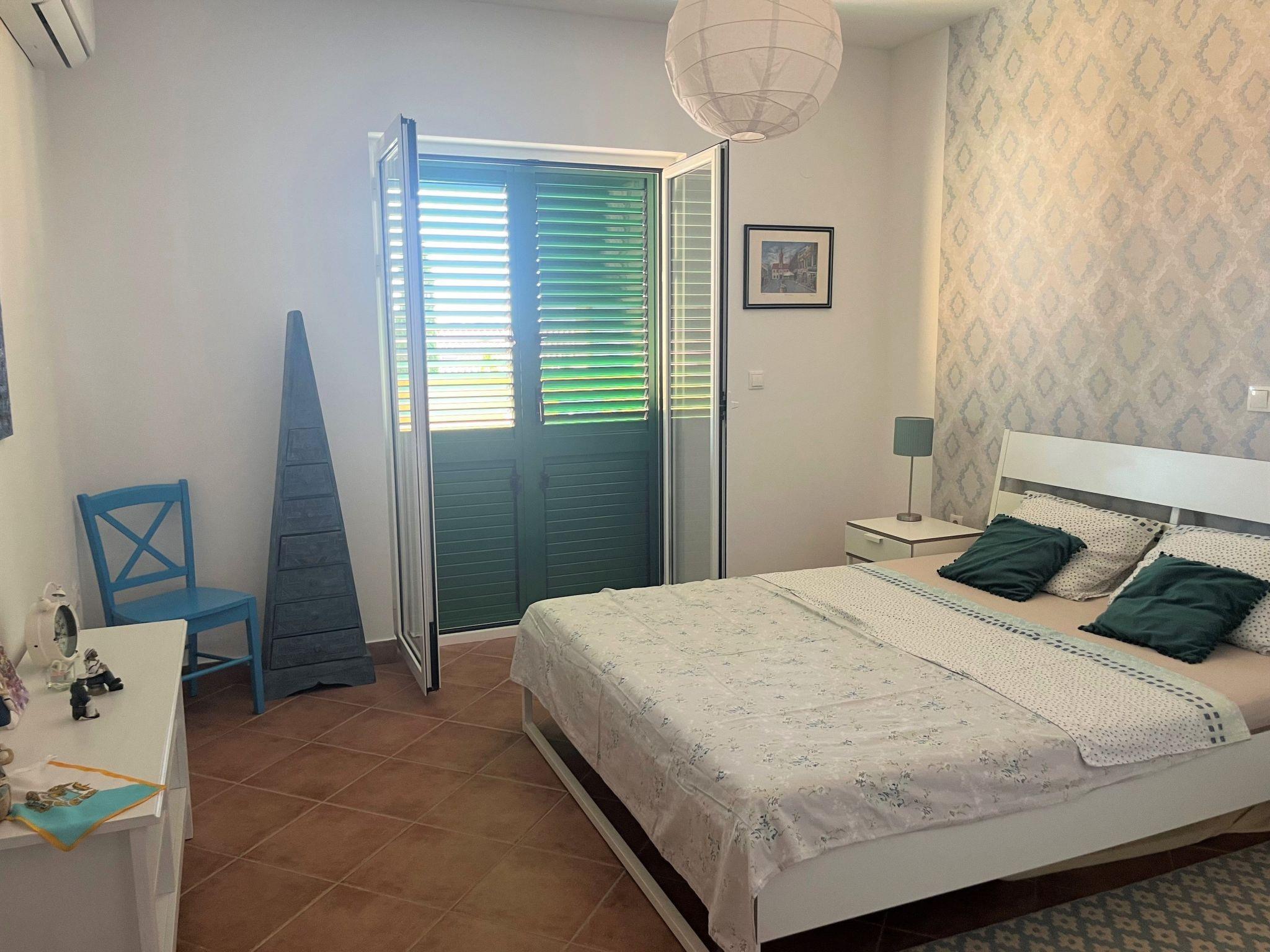 Holiday house " Summer escape 2" is a charming holiday home with pool , located on island Rab, one of the most beautiful island on the Adriatic. This home is in the village Barbat , situated just 70 meters from the beautiful sandy beaches. The highlights of this great villa is a huge , nice private garden with a pool. Also, there is the sea view, which can be enjoyed from the bedroom on the first floor, or the hill view from the second bedroom. This home is ideal for 6 persons. The open ground floor offers a living room with the kitchen, from where you have direct access to the pool and the covered terrace. A bedroom with double bed and own bathroom is also situated on the ground floor and has direct access to the private terrace. In the morning, you can use direct access to the pool from the ground floor , and enjoy in the swimming directly from the bed. On the first floor there are 2 bedrooms and one bathroom . All bedrooms have air conditioner. All bedrooms on the first floor have terraces from where a beautiful view extends over the surroundings .