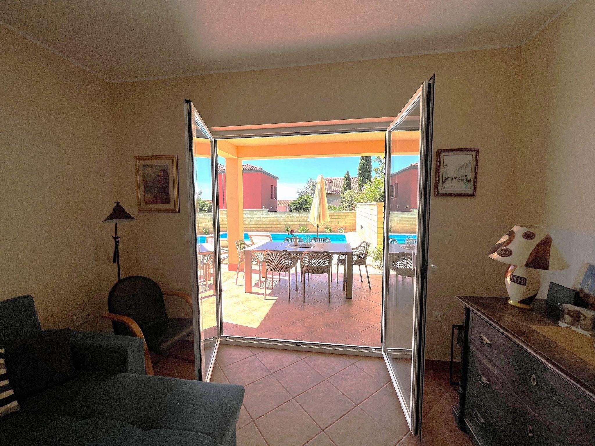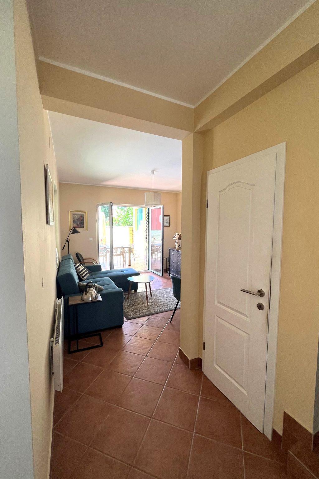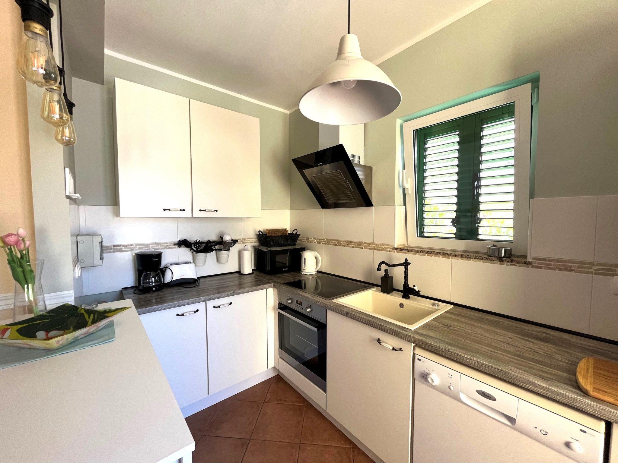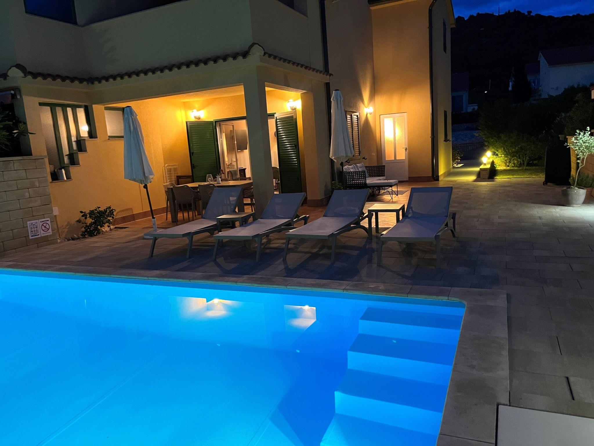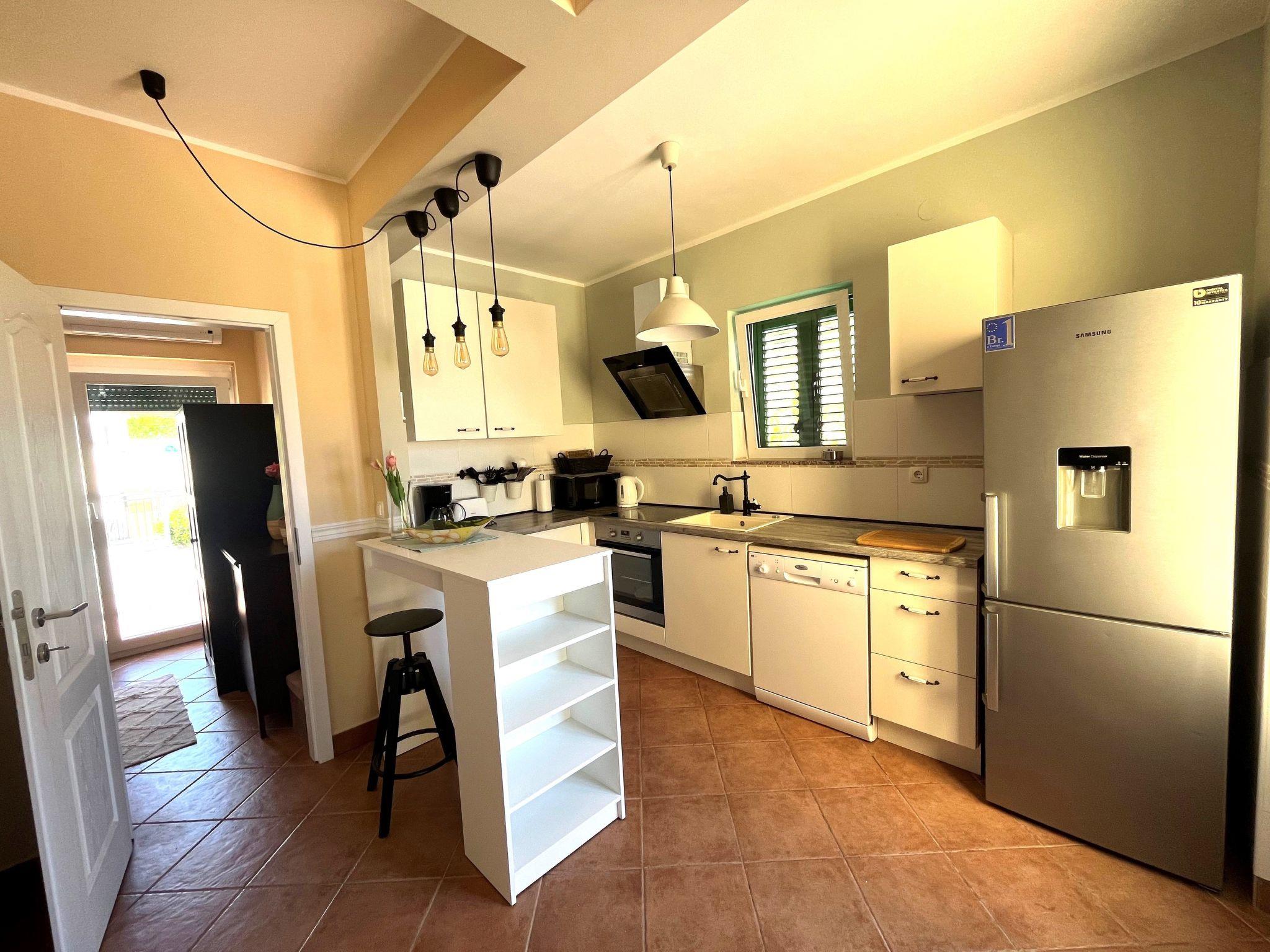 Holiday house " Summer escape 2" is a charming holiday home with pool , located on island Rab, one of the most beautiful island on the Adriatic. This home is in the village Barbat , situated just 70 meters from the beautiful sandy beaches. The highlights of this great villa is a huge , nice private garden with a pool. Also, there is the sea view, which can be enjoyed from the bedroom on the first floor, or the hill view from the second bedroom. This home is ideal for 6 persons. The open ground floor offers a living room with the kitchen, from where you have direct access to the pool and the covered terrace. A bedroom with double bed and own bathroom is also situated on the ground floor and has direct access to the private terrace. In the morning, you can use direct access to the pool from the ground floor , and enjoy in the swimming directly from the bed. On the first floor there are 2 bedrooms and one bathroom . All bedrooms have air conditioner. All bedrooms on the first floor have terraces from where a beautiful view extends over the surroundings .