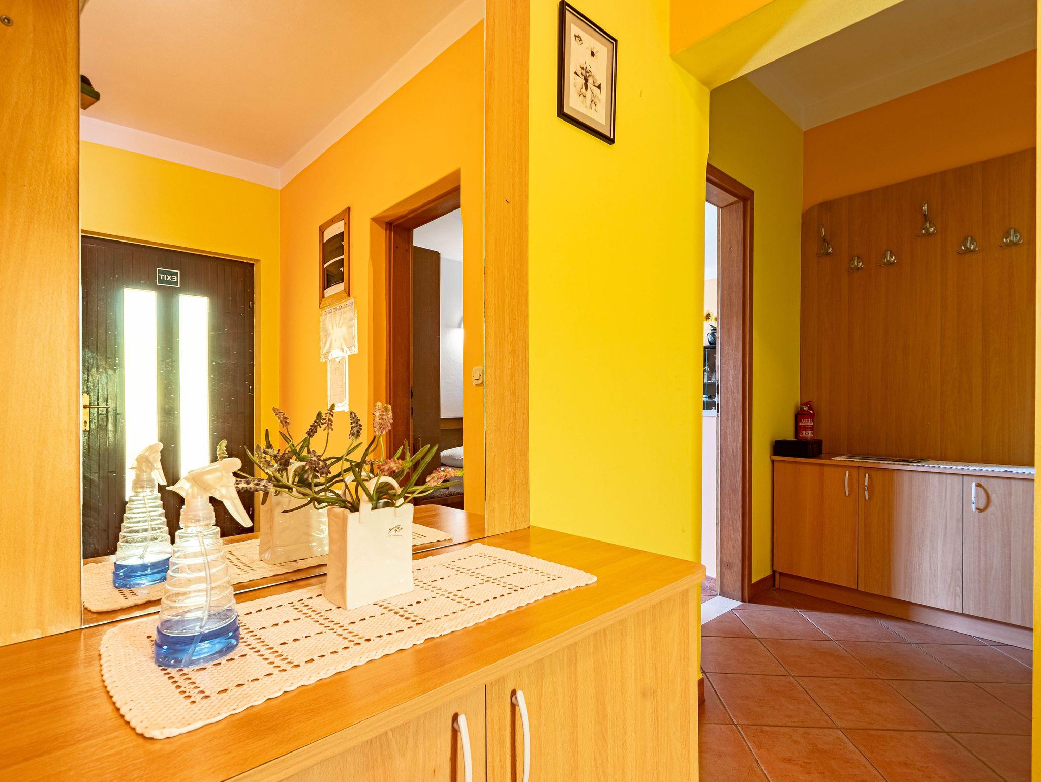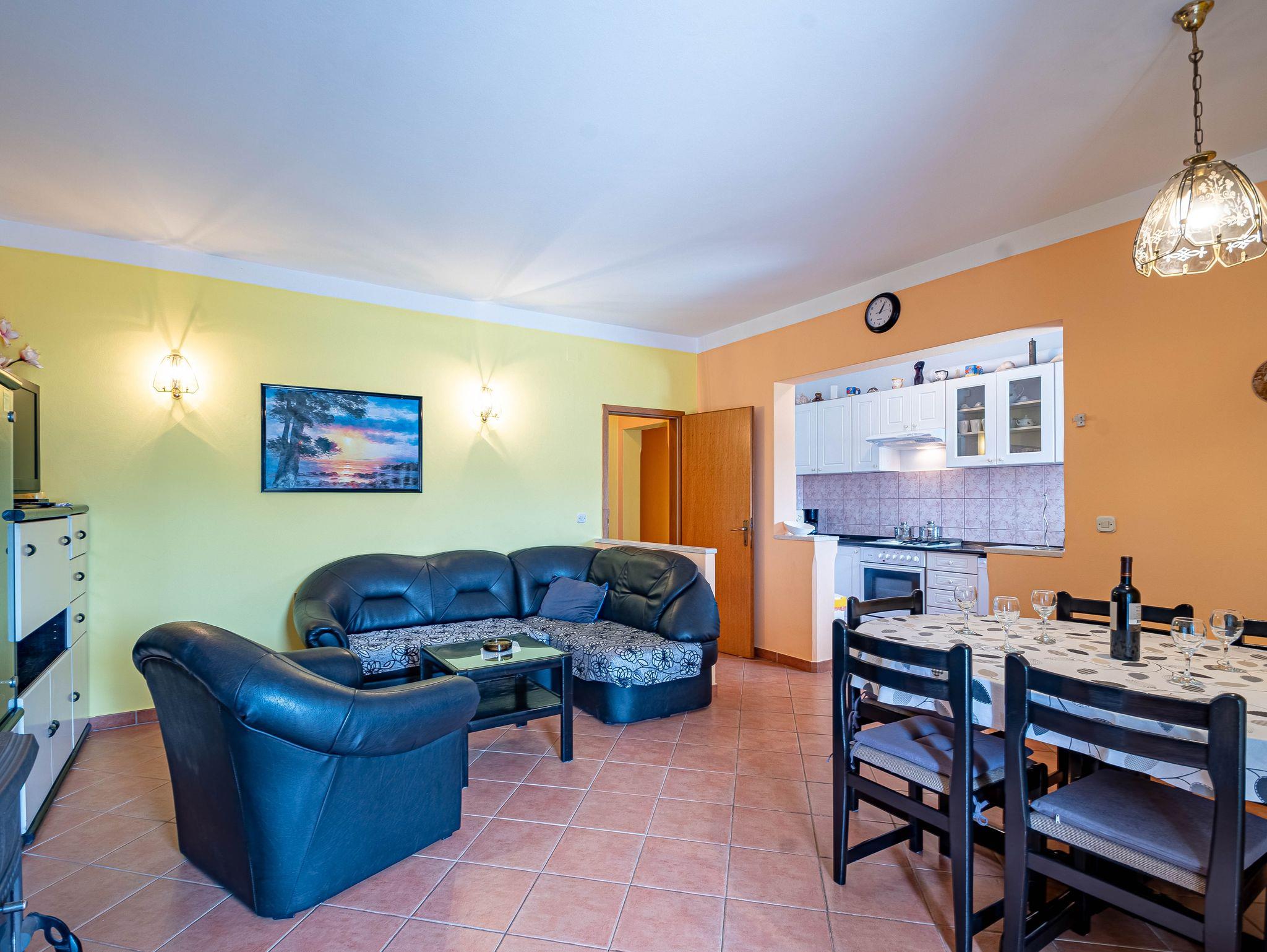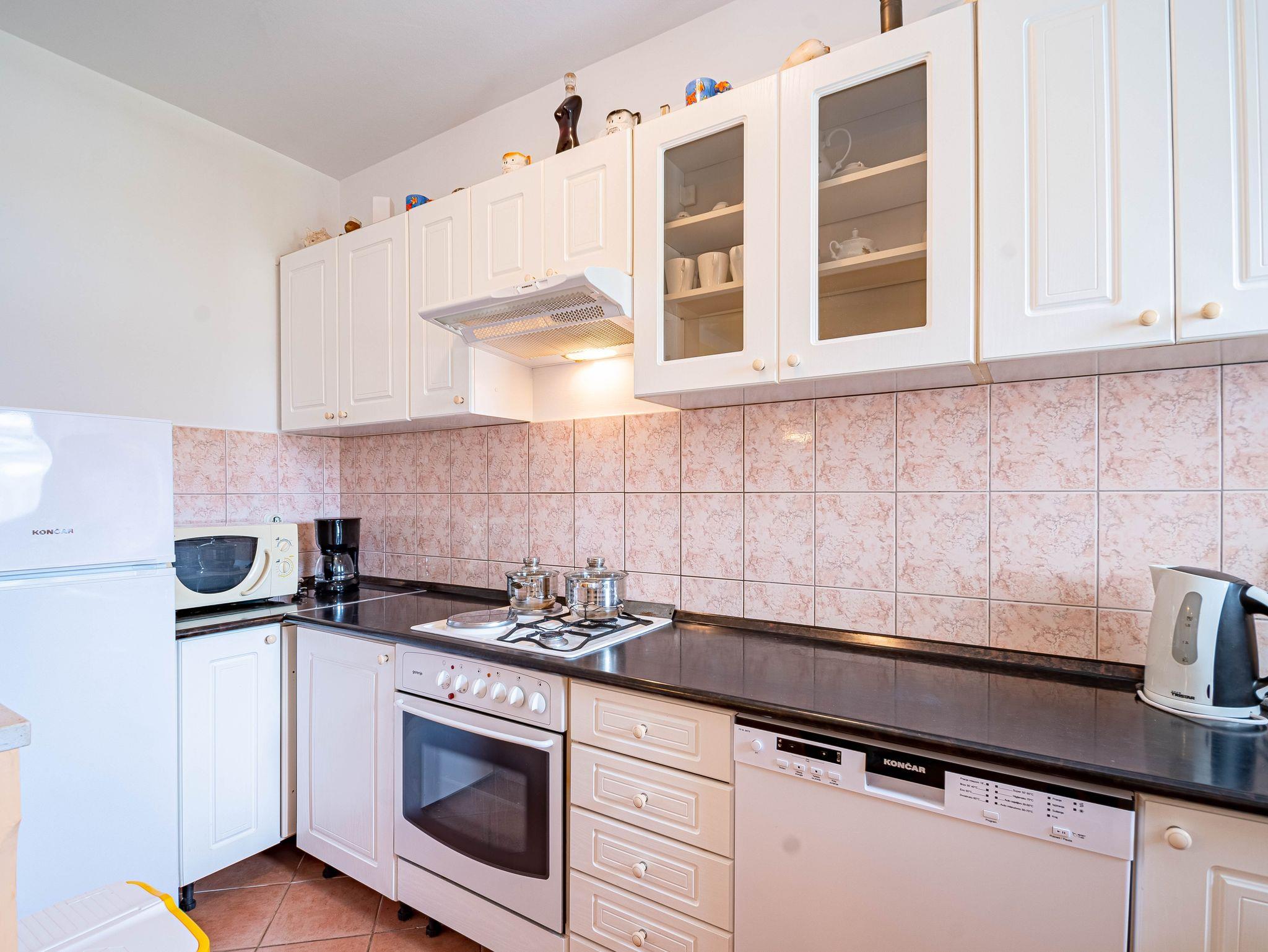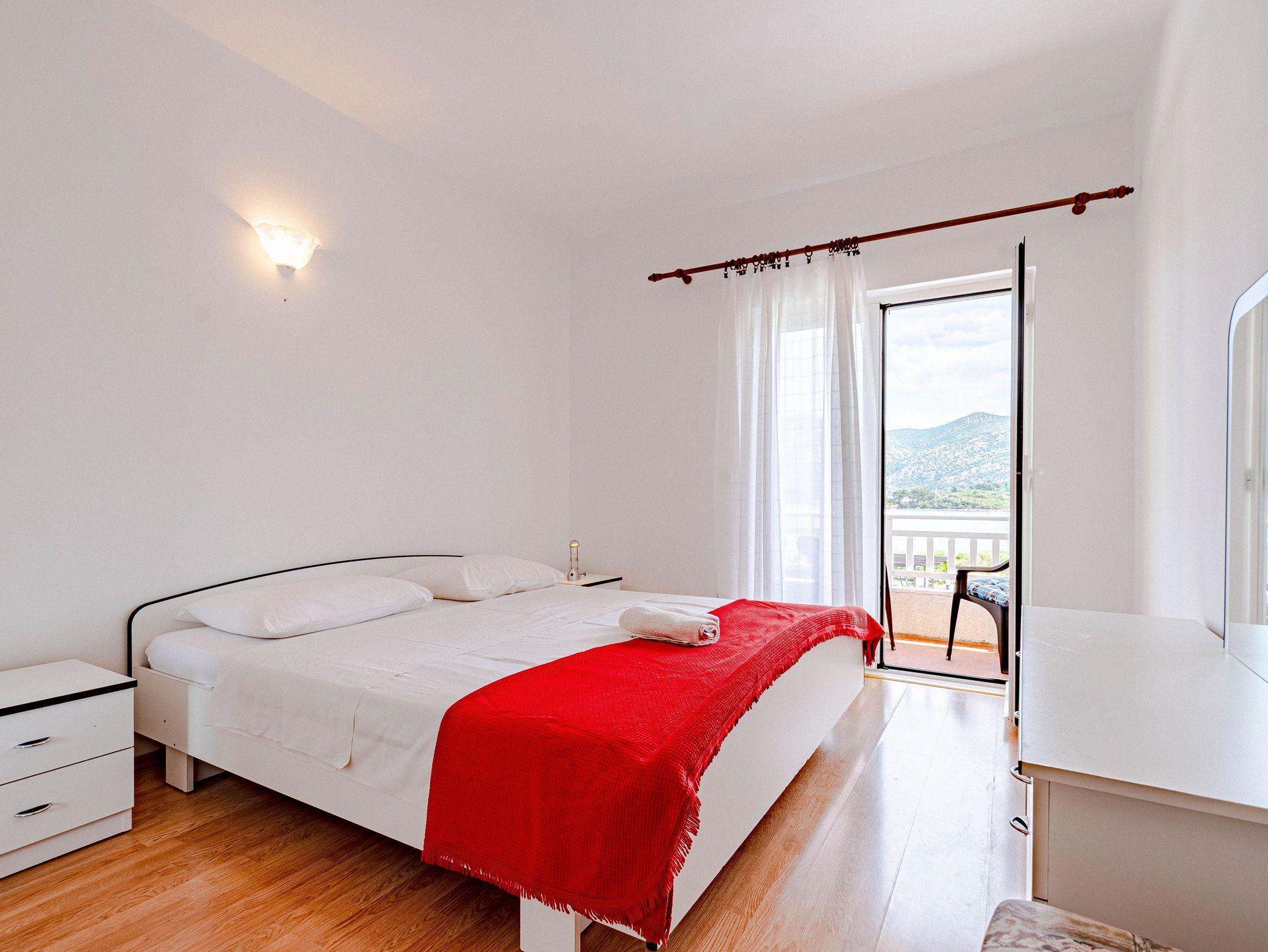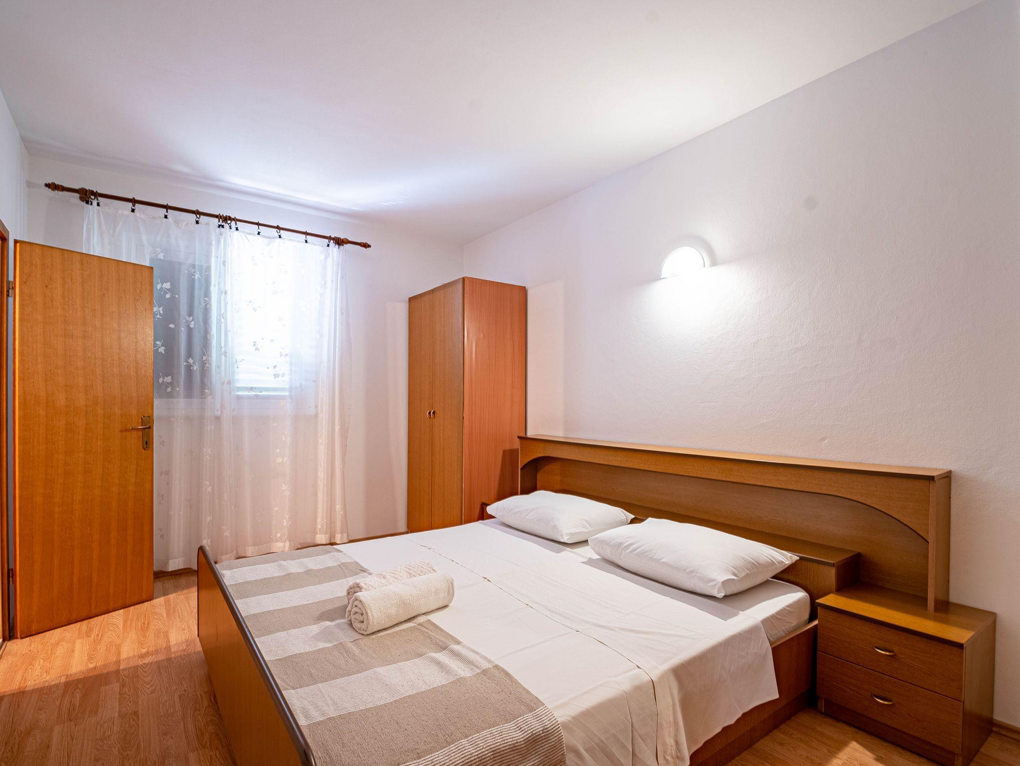 Ferienwohnung bietet Platz für 6 Gäste. Die Betten sind in Schlafzimmern, die es 3 gibt, innerhalb einer Gesamtfläche von 79m2, angeordnet. Die Gäste haben eine eigene Terrasse zur Verfügung, auf der sie in warmen Sommernächten genießen können. Das Apartment bietet Meerblick. Es ist erlaubt, Speisen auf dem Gemeinschafts-Grill vorzubereiten. IM PREIS INBEGRIFFEN: Kurtaxe, Endreinigung, Klimatisierung, Parkplatz, Internet, Wäschewaschen, Kinderbett, Bügeleisen, Bügelbrett, Föhn, Liegestühle. VERBINDLICHE ZUSÄTZLICHE KOSTEN: Aufzahlung für Kurzaufenthalte (prozentualer Zuschlag pro Nächtigungsanzahl: 30% - 1, 20% - 2, 10% - 3). Die Verfügbarkeit zusätzlicher Dienstleistungen in Ihrem reservierten Termin und die Preise derselben (falls nicht aufgeführt) müssen im Voraus überprüft werden. Zusätzliche Dienstleistungen die in der Zahlungsaufforderung nicht aufgeführt sind werden direkt beim Vermieter bezahlt, angenommen der Gast nutzt auch diese. Ermäßigung auf den Grundpreis: Gratistag 14=13 (bei einem Aufenthalt von 14 Tagen oder mehr erhalten Sie einen Gratistag für den Aufenthalt bis 31.12.26).