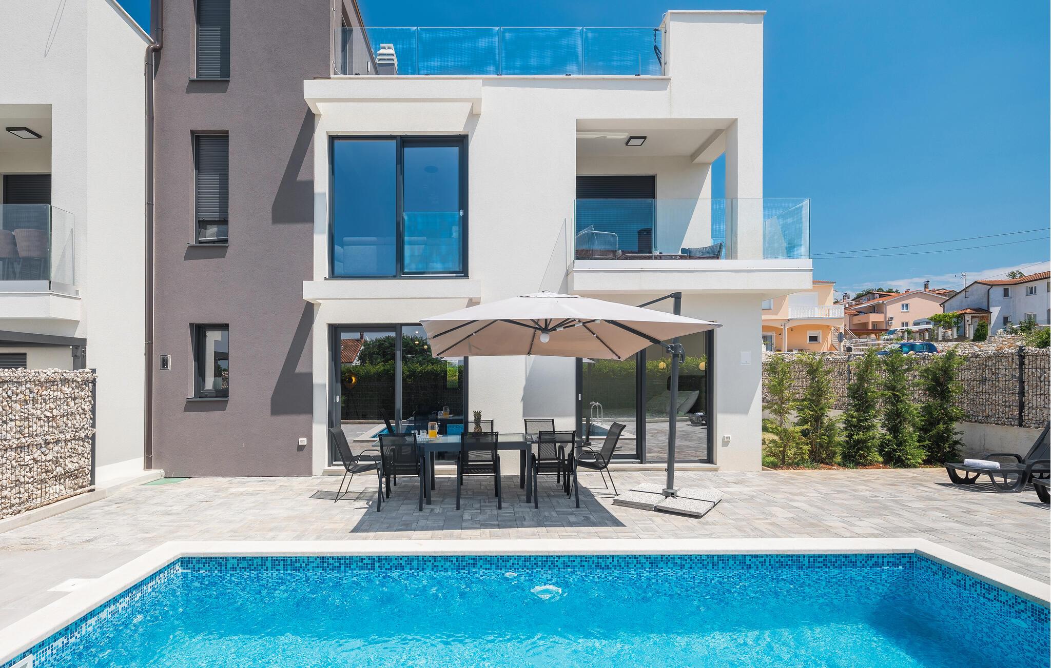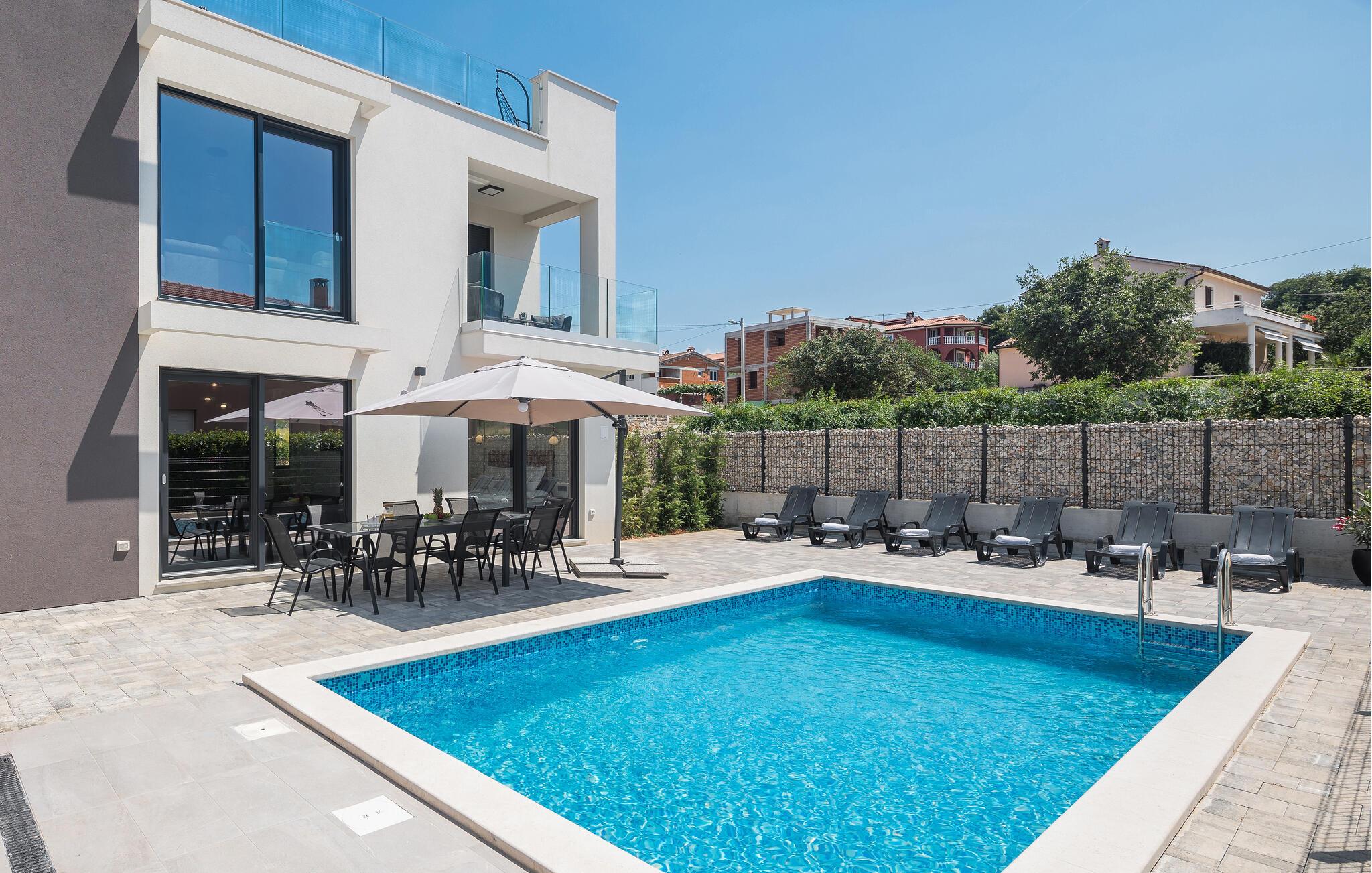 I kan tilbringe en skøn ferie med jeres kære i dette stilfulde og komfortabelt indrettede feriehus. Så snart I ankommer, kan I føle jer godt tilpas i de rummelige værelser, der er velindrettede og indbydende. På terrassen og balkonen finder I både solrige og skyggefulde steder at slappe af på ethvert tidspunkt af dagen, og poolen står til jeres rådighed til en forfriskende svømmetur ind imellem. Børnene vil også have det sjovt med at plaske rundt her. Fordi ejendommen er indhegnet, kan I uden bekymring lade de små lege udenfor.