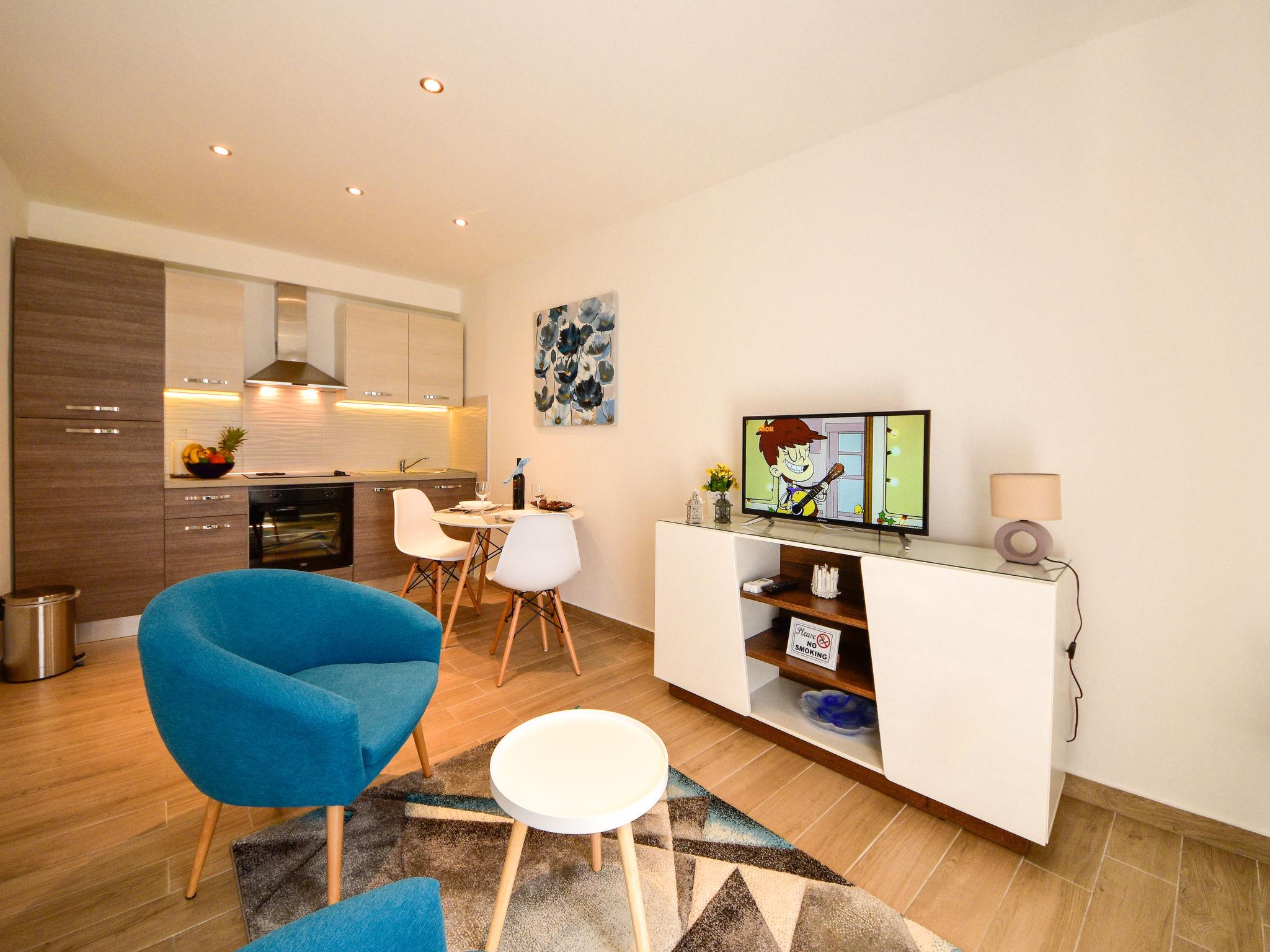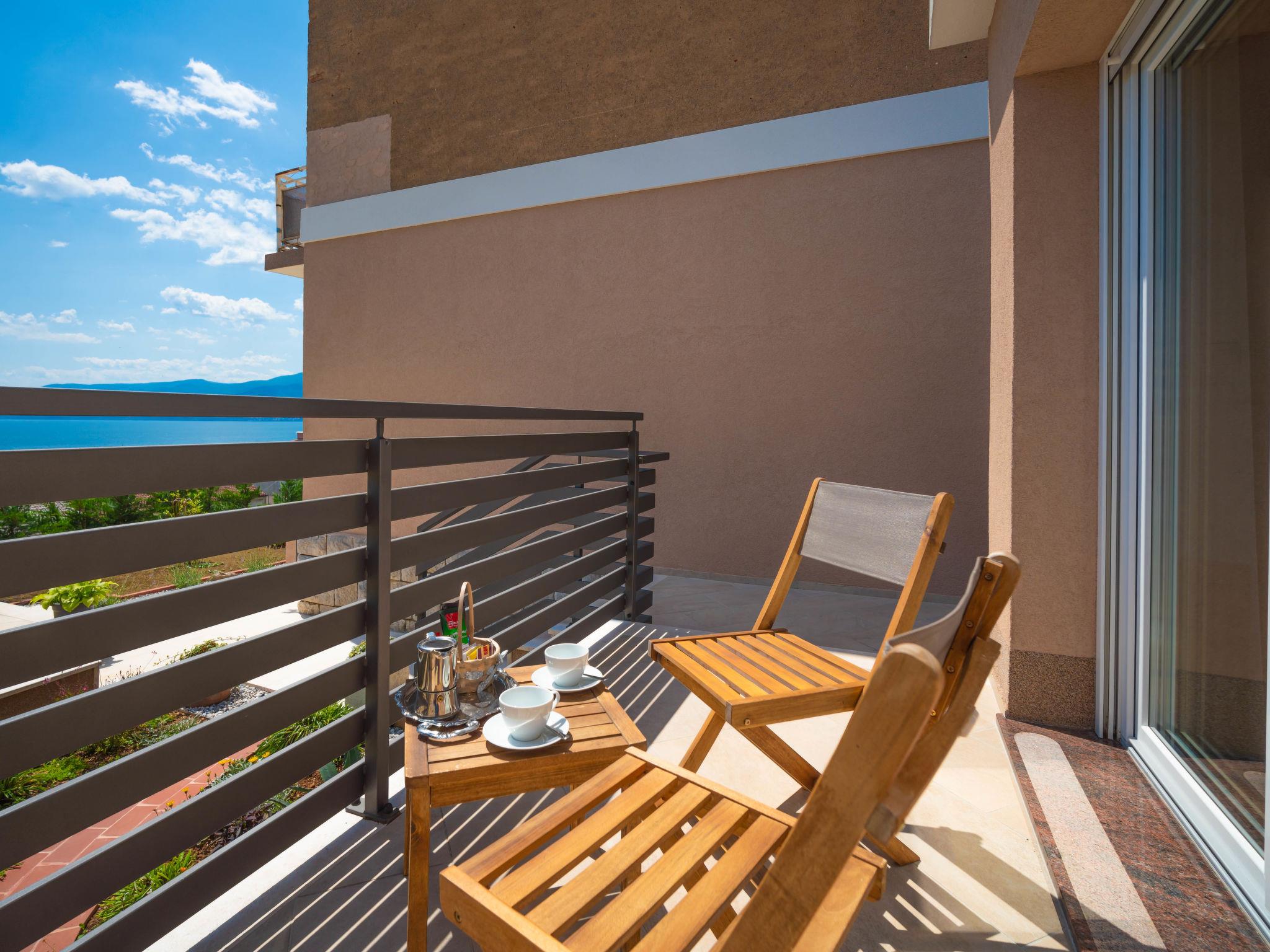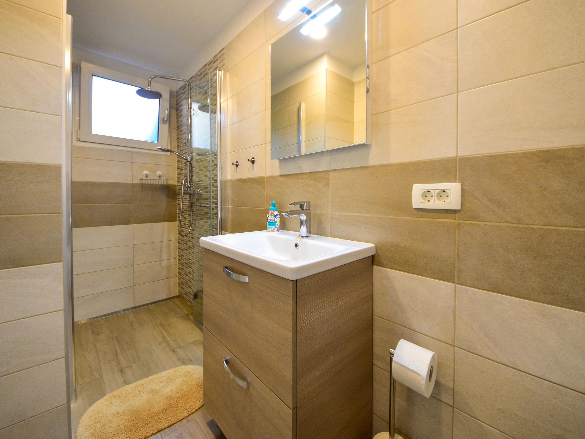 1-room house 22 m2, south facing position. Beautiful and modern furnishings: living/sleeping room with 1 double wall-trunk bed (140 cm, length 200 cm), satellite TV (flat screen), air conditioning. Exit to the terrace. Open kitchen (oven, 4 ceramic glass hob hotplates, microwave, freezer) with dining table. Shower/WC. Forced-air heating. Heating available only from 01.10. to 01.05. Terrace 5 m2. Terrace furniture. Marvellous panoramic view of the sea. Facilities: hair dryer. Internet (WiFi, free).