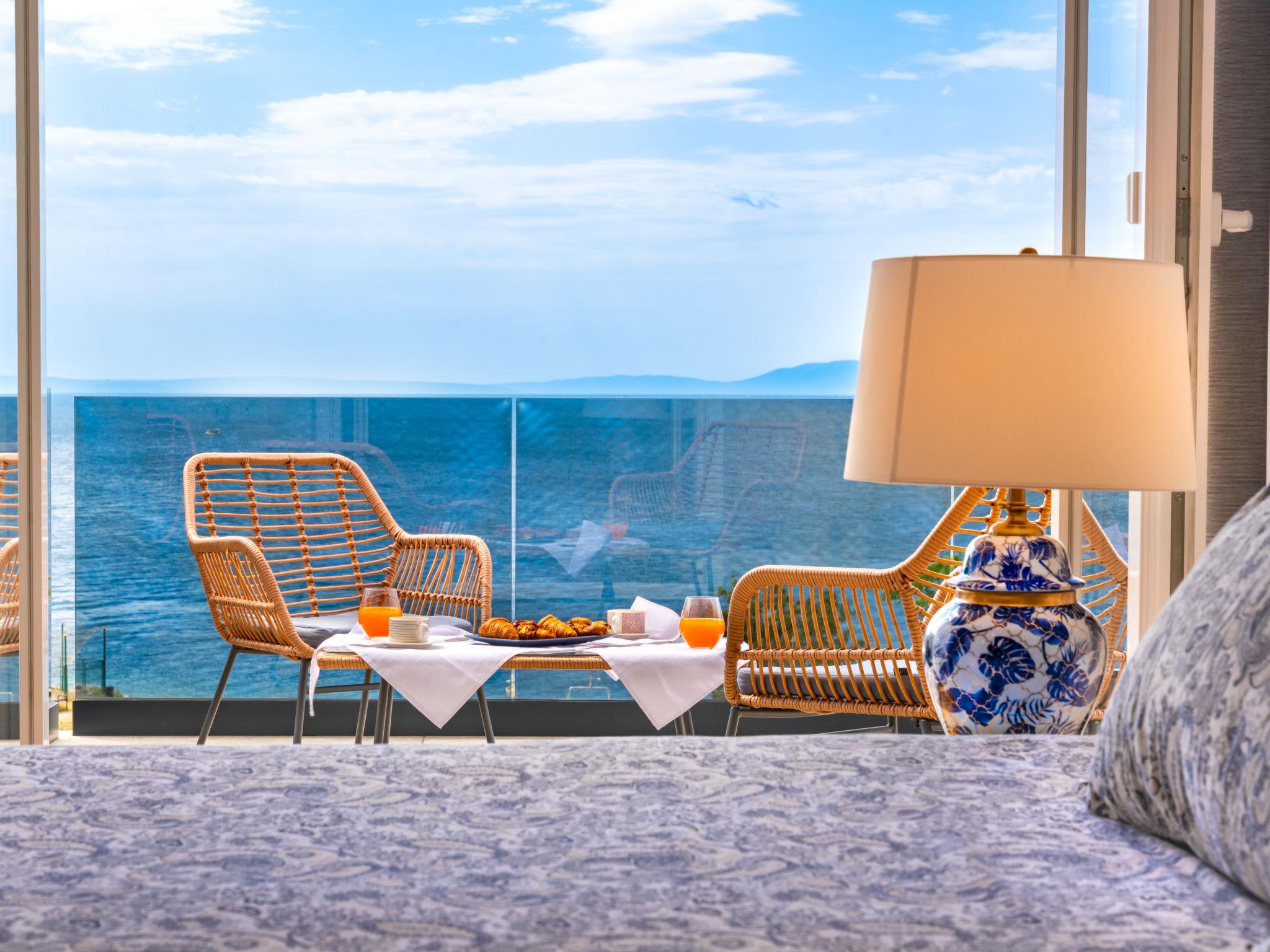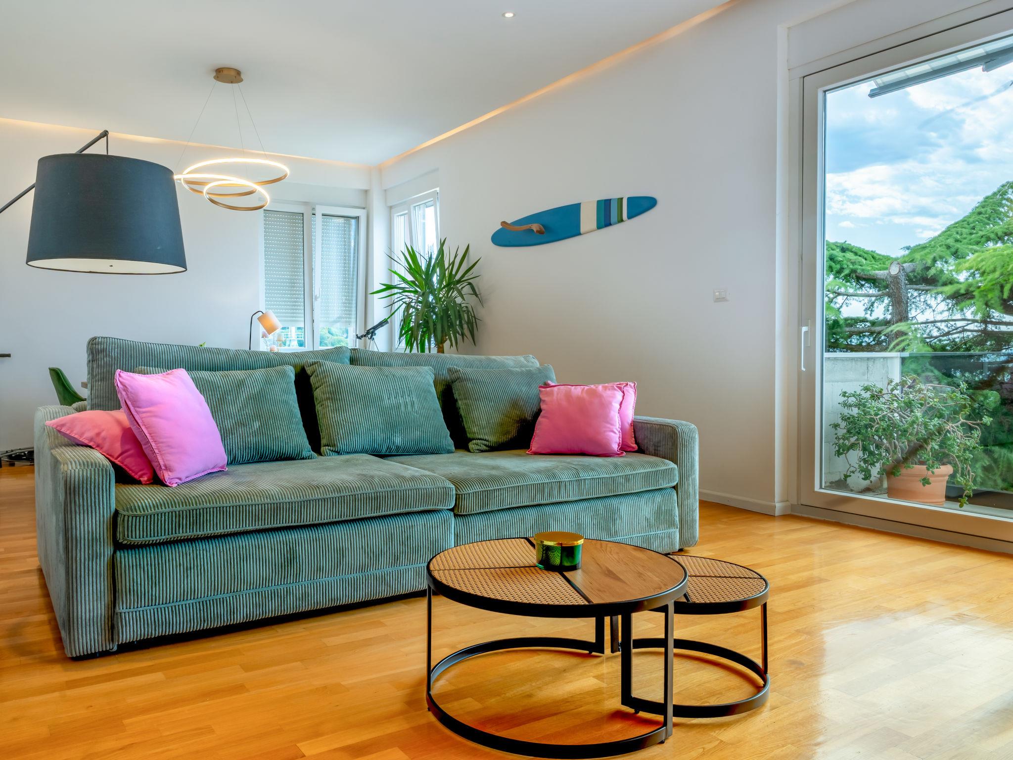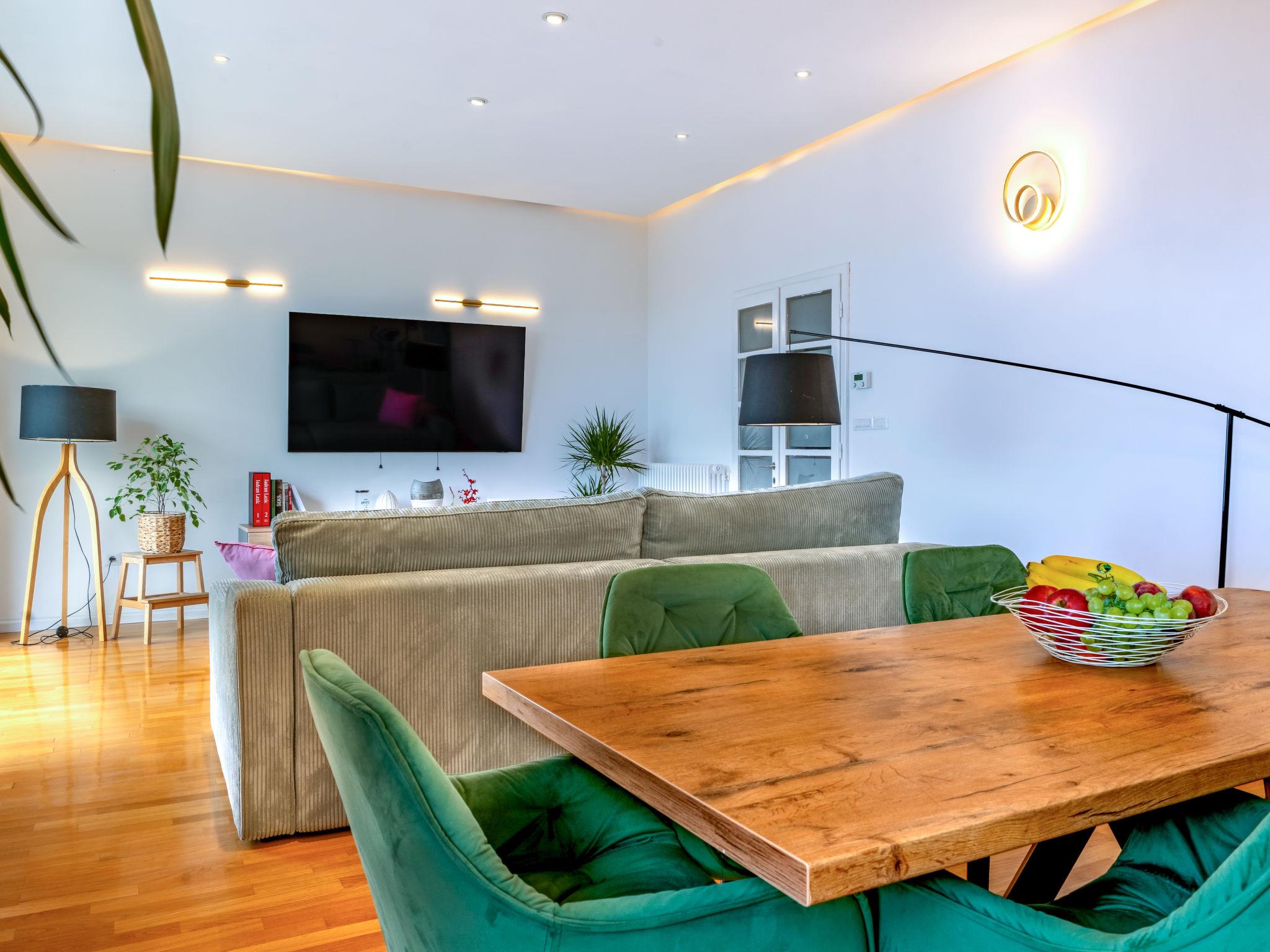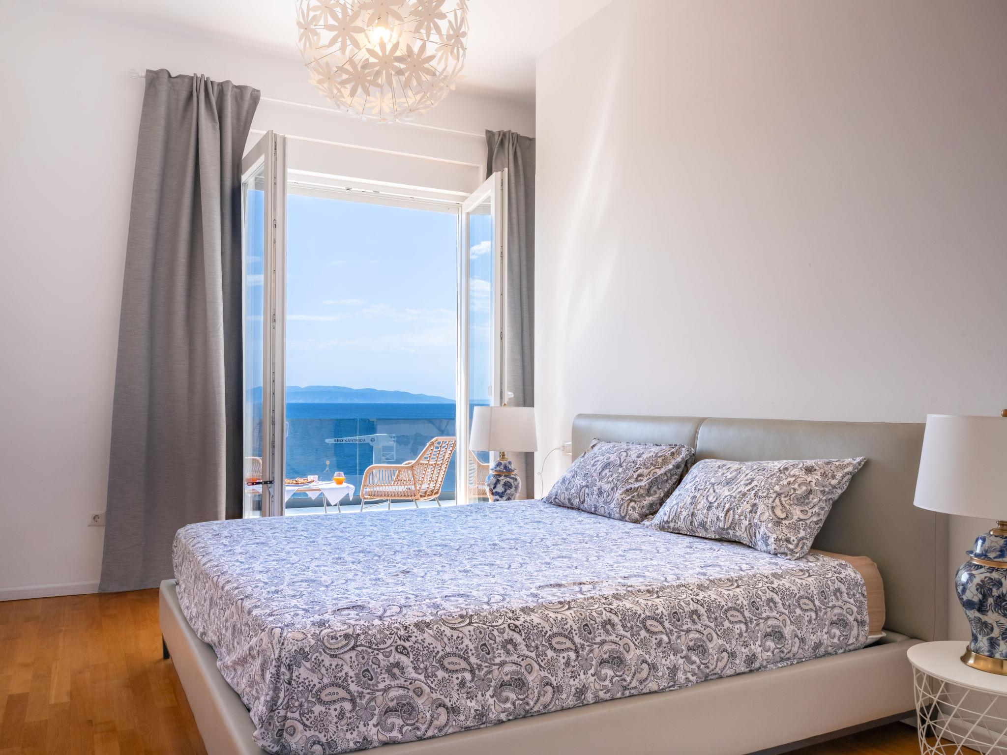 3-room apartment 110 m2, on the ground floor. Fully renovated in 2024, modern furnishings: living/dining room with 1 sofabed (120 cm, length 240 cm), satellite TV (flat screen). Exit to the balcony. Entrance hall with air conditioning. 1 room with 2 beds (80 cm, length 200 cm). 1 room with 1 french bed (180 cm, length 200 cm). Exit to the balcony. Open kitchen (oven, dishwasher, 4 induction hot plates, toaster, freezer). Exit to the terrace. Shower/WC, sep. WC. Gas heating. Balcony 19 m2. Balcony furniture. Beautiful panoramic view of the sea and the bay. Facilities: washing machine, safe, iron, baby cot. Internet (WiFi, free). Please note: non-smoking house.