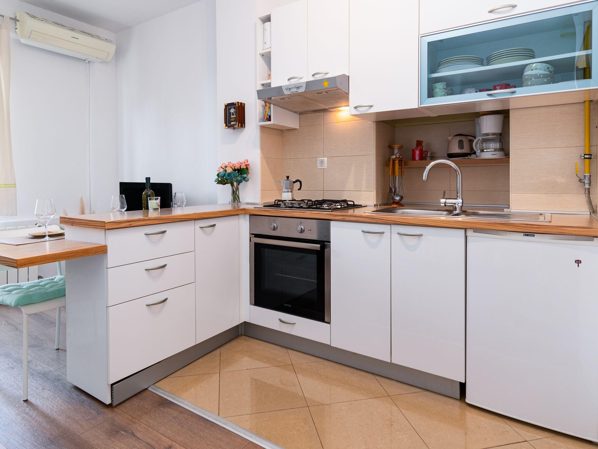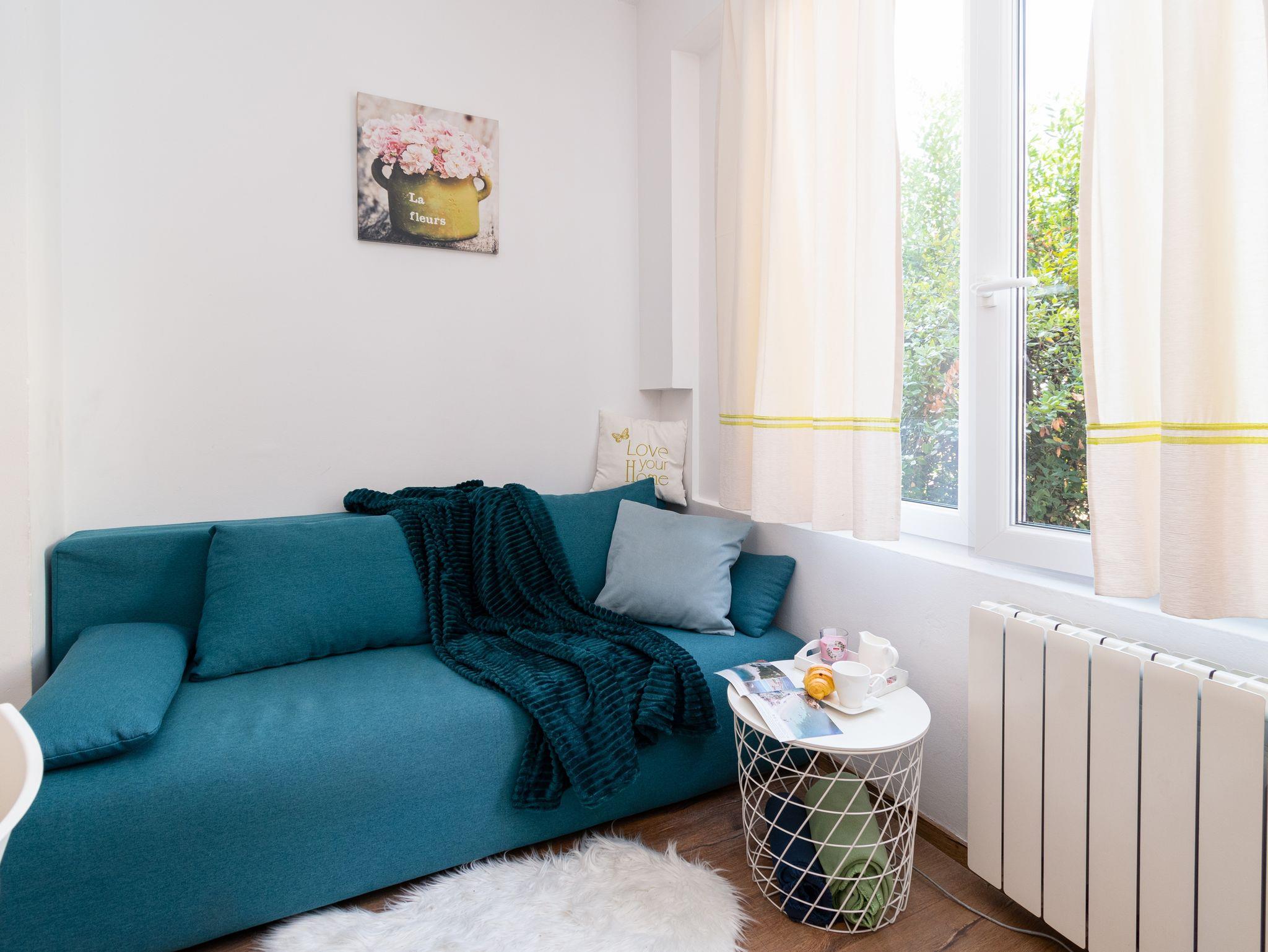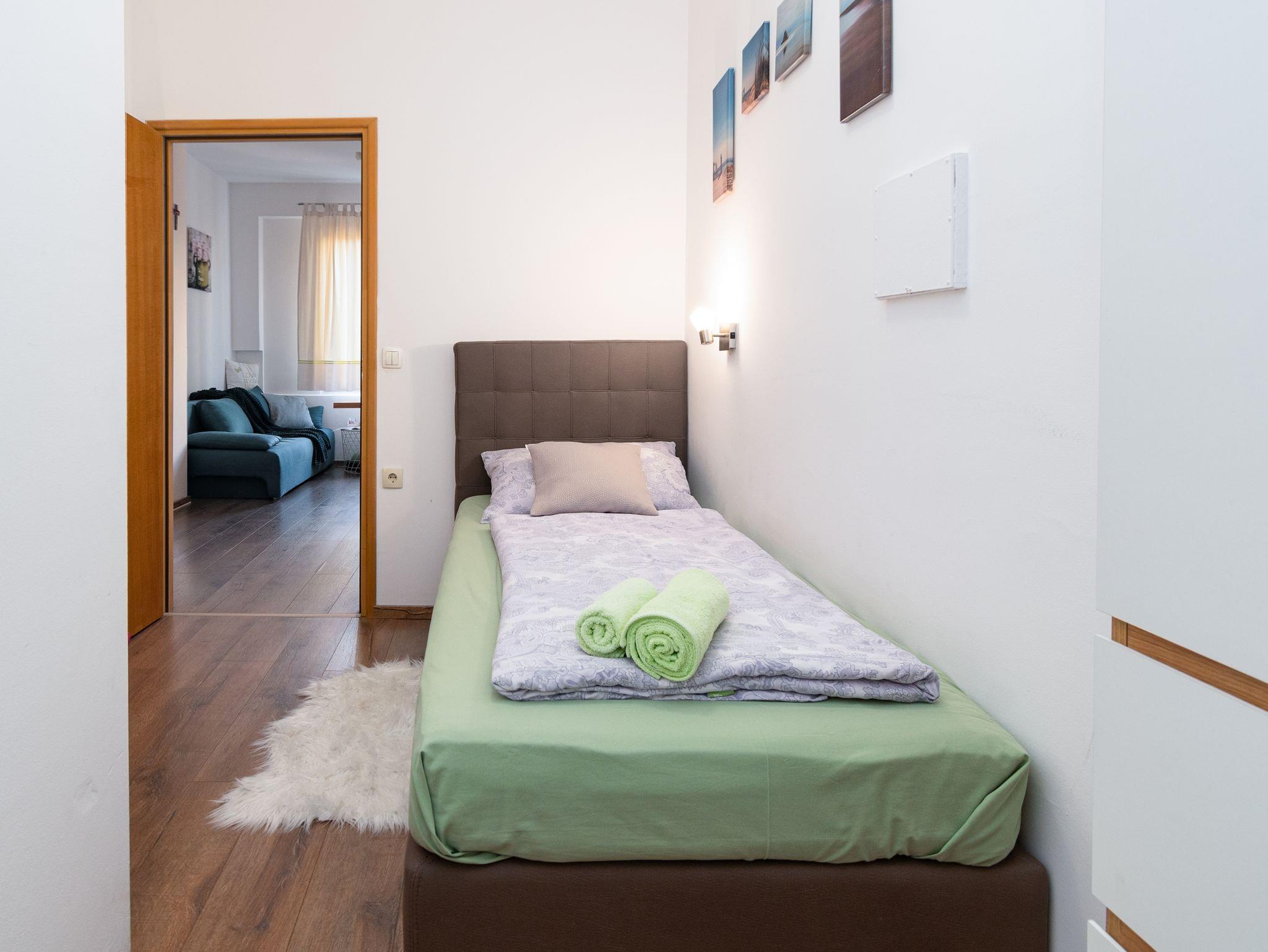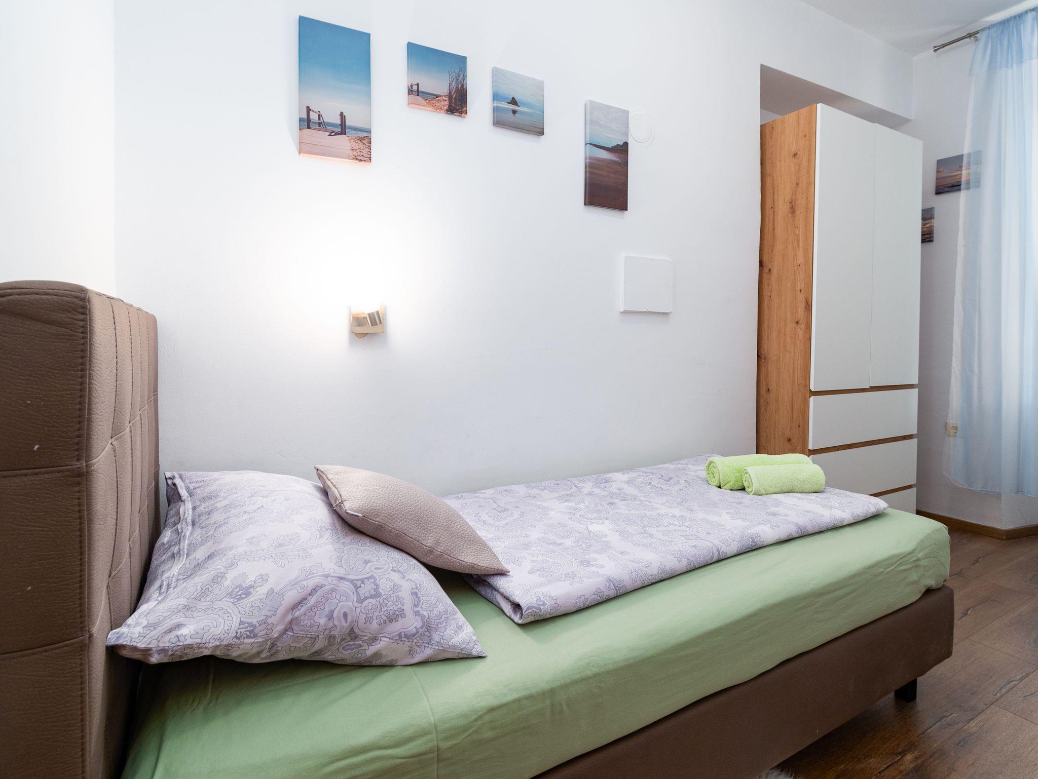 Ferienwohnung bietet Platz für 3 Gäste. Die Betten sind in Schlafzimmern, die es 2 gibt, innerhalb einer Gesamtfläche von 42m2, angeordnet. In der Unterkunftseinheit besteht die Möglichkeit des Mitbringens von Haustieren gegen Aufpreis. Die reservierte Unterkunftseinheit hat keinen Balkon und keine Terrasse. IM PREIS INBEGRIFFEN: Kurtaxe, Endreinigung, Klimatisierung, Zentralheizung, Internet, Bügeleisen, Föhn. VERBINDLICHE ZUSÄTZLICHE KOSTEN: Aufzahlung für Kurzaufenthalte (prozentualer Zuschlag pro Nächtigungsanzahl: 30% - 1, 20% - 2, 10% - 3). UNVERBINDLICHE ZUSÄTZLICHE KOSTEN: Haustiere (7,00 € pro Nacht). Die Verfügbarkeit zusätzlicher Dienstleistungen in Ihrem reservierten Termin und die Preise derselben (falls nicht aufgeführt) müssen im Voraus überprüft werden. Zusätzliche Dienstleistungen die in der Zahlungsaufforderung nicht aufgeführt sind werden direkt beim Vermieter bezahlt, angenommen der Gast nutzt auch diese. Ermäßigung auf den Grundpreis: Gratistag 14=13 (bei einem Aufenthalt von 14 Tagen oder mehr erhalten Sie einen Gratistag für den Aufenthalt bis 31.12.26).