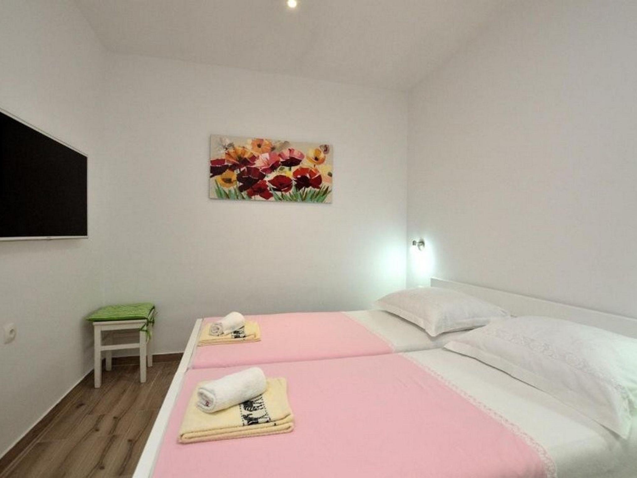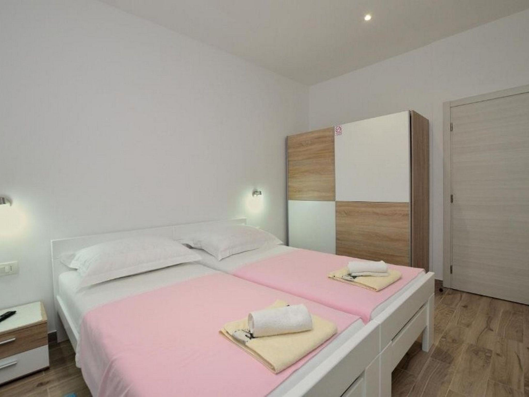 Ferienwohnung bietet Platz für 4 Gäste. Die Betten sind in Schlafzimmern, die es 1 gibt, und in Wohnzimmer, innerhalb einer Gesamtfläche von 38m2, angeordnet. Das Apartment bietet Meerblick. Es ist erlaubt, Speisen auf dem Gemeinschafts-Grill vorzubereiten. Während ihres Aufenthalts können Gäste das gemeinsam zur Nutzung stehende Schwimmbad benutzen. Die reservierte Unterkunftseinheit hat keinen Balkon und keine Terrasse. IM PREIS INBEGRIFFEN: Kurtaxe, Endreinigung, Klimatisierung, Pool, Parkplatz, Internet, Bügeleisen, Bügelbrett, Föhn, tragbarer Grill. Die Verfügbarkeit zusätzlicher Dienstleistungen in Ihrem reservierten Termin und die Preise derselben (falls nicht aufgeführt) müssen im Voraus überprüft werden. Zusätzliche Dienstleistungen die in der Zahlungsaufforderung nicht aufgeführt sind werden direkt beim Vermieter bezahlt, angenommen der Gast nutzt auch diese. Ermäßigung auf den Grundpreis: Gratistag 14=13 (bei einem Aufenthalt von 14 Tagen oder mehr erhalten Sie einen Gratistag für den Aufenthalt bis 31.12.26).