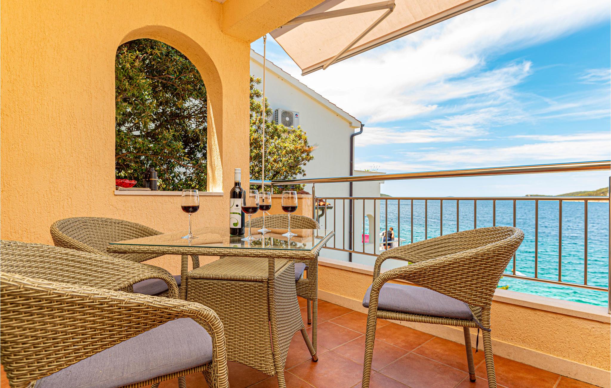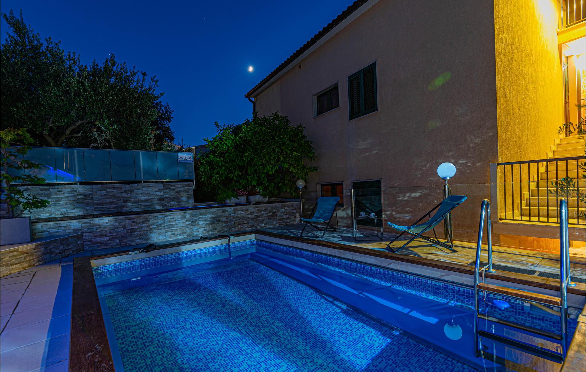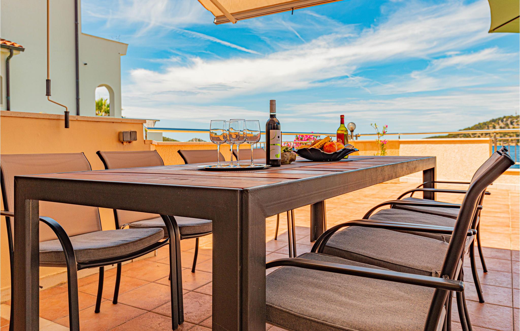 Dette enkle og praktiske feriehus ligger i byen Razanj, ca 10 km fra byen Rogoznica. Huset er i to etager, forbundet med udendørs trapper. På hver etage er der to soveværelser, et badeværelse og en stor stue, med udgang til en skøn terrasse med en endnu flottere udsigt over havet. Huset har en hel del ekstra: udendørs pool, fitnessapparater og bordfodbold. Tag på udflugt og oplev egnens skønne strande og bugter, tag en afslappet badedag og nyd de glasklare Adriaterhav. Besøg også byerne Sibenik og Split, begge med en rig kulturhistorie, mange butikker, restauranter og andre bekvemmeligheder.