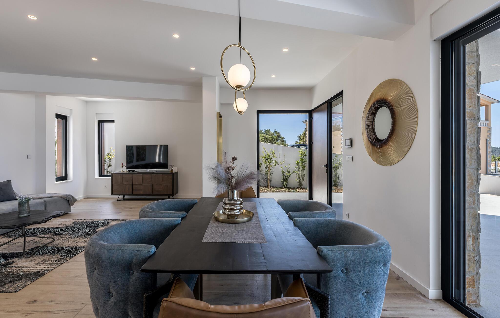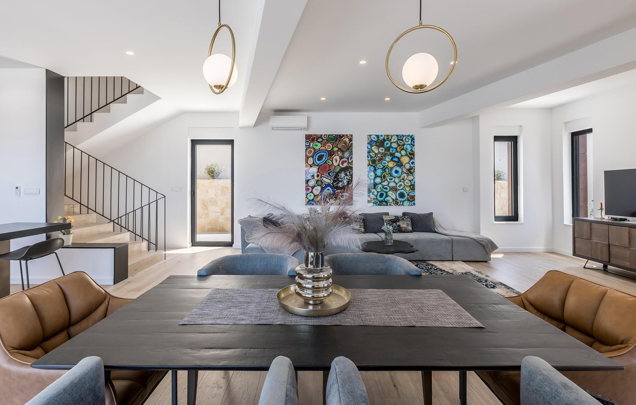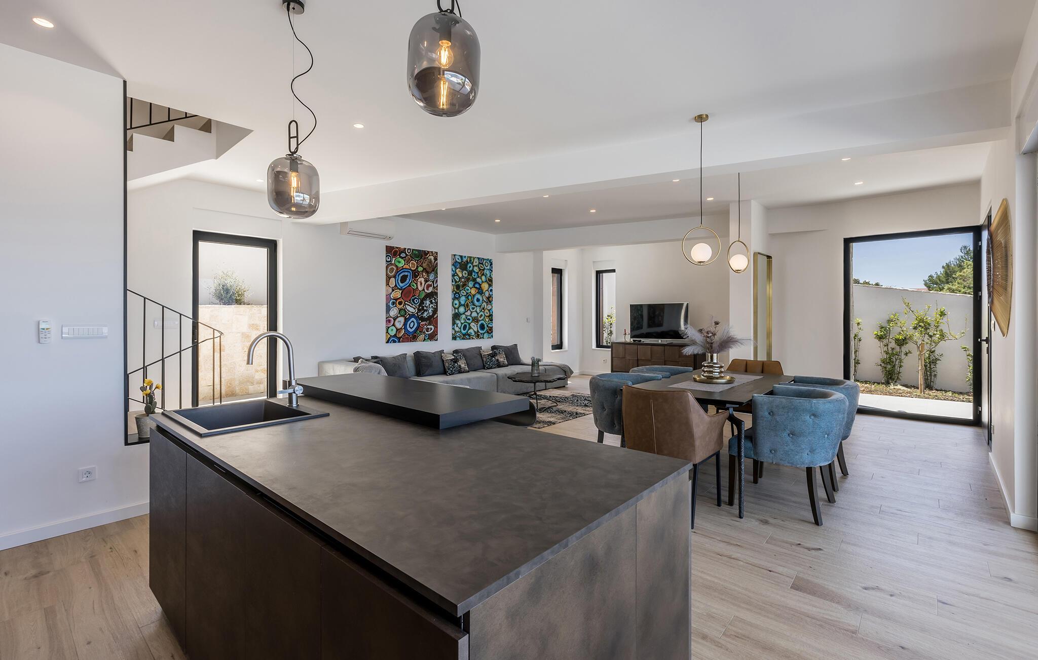 Dette moderne og stilfuldt indrettede hus forkæler jer med lyse, rummelige værelser og store vinduespartier, der igen og igen åbner op for den spektakulære udsigt over havet. Det bliver en fornøjelse at tilberede lækre måltider i det åbne kvalitetskøkken. Nyd maden ved det elegante spisebord, og slap af om aftenen med en god film på sofaen.
