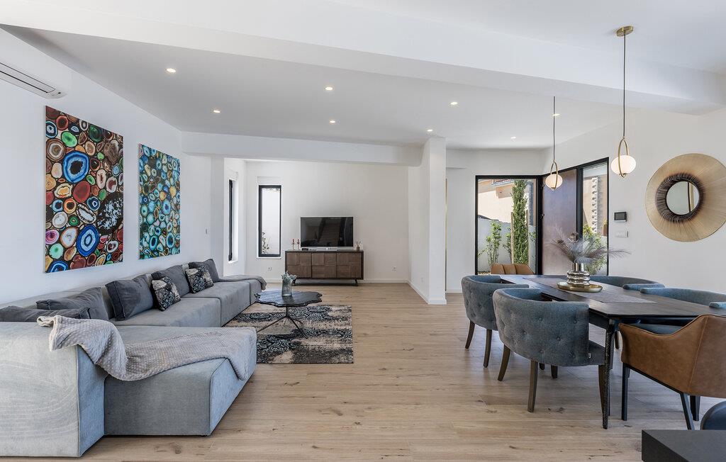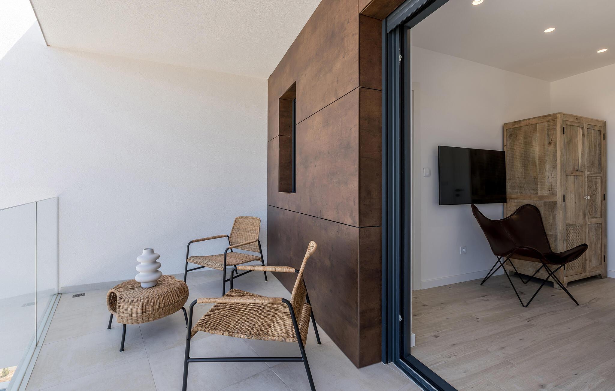 Det rummelige udendørsområde er som skabt til lange timer under middelhavshimlen. Nyd solen på en liggestol, forfrisk jer i infinity-poolen, og lad blikket glide ud over panoramaudsigten med en kold drink i den skyggefulde lounge.