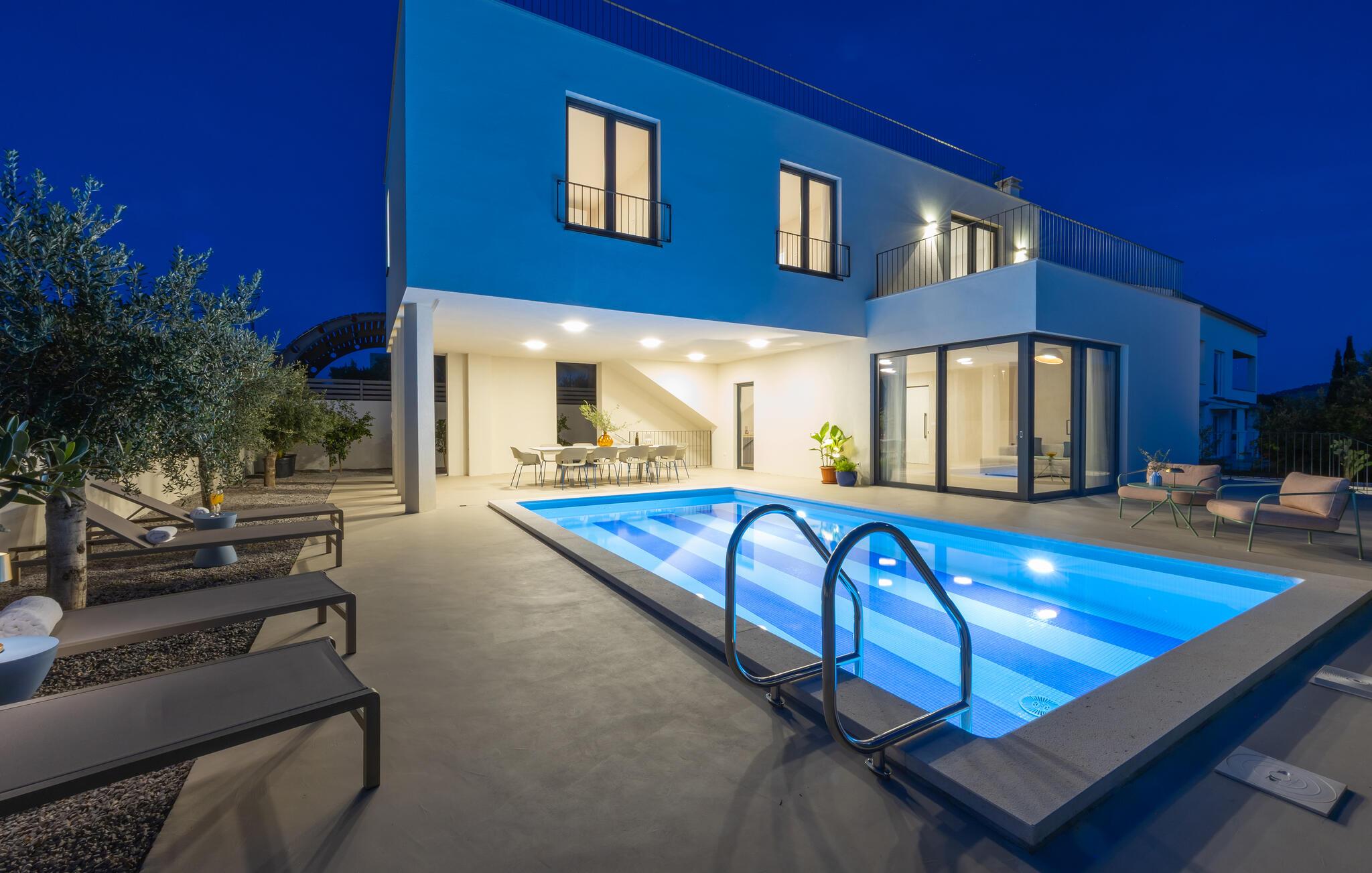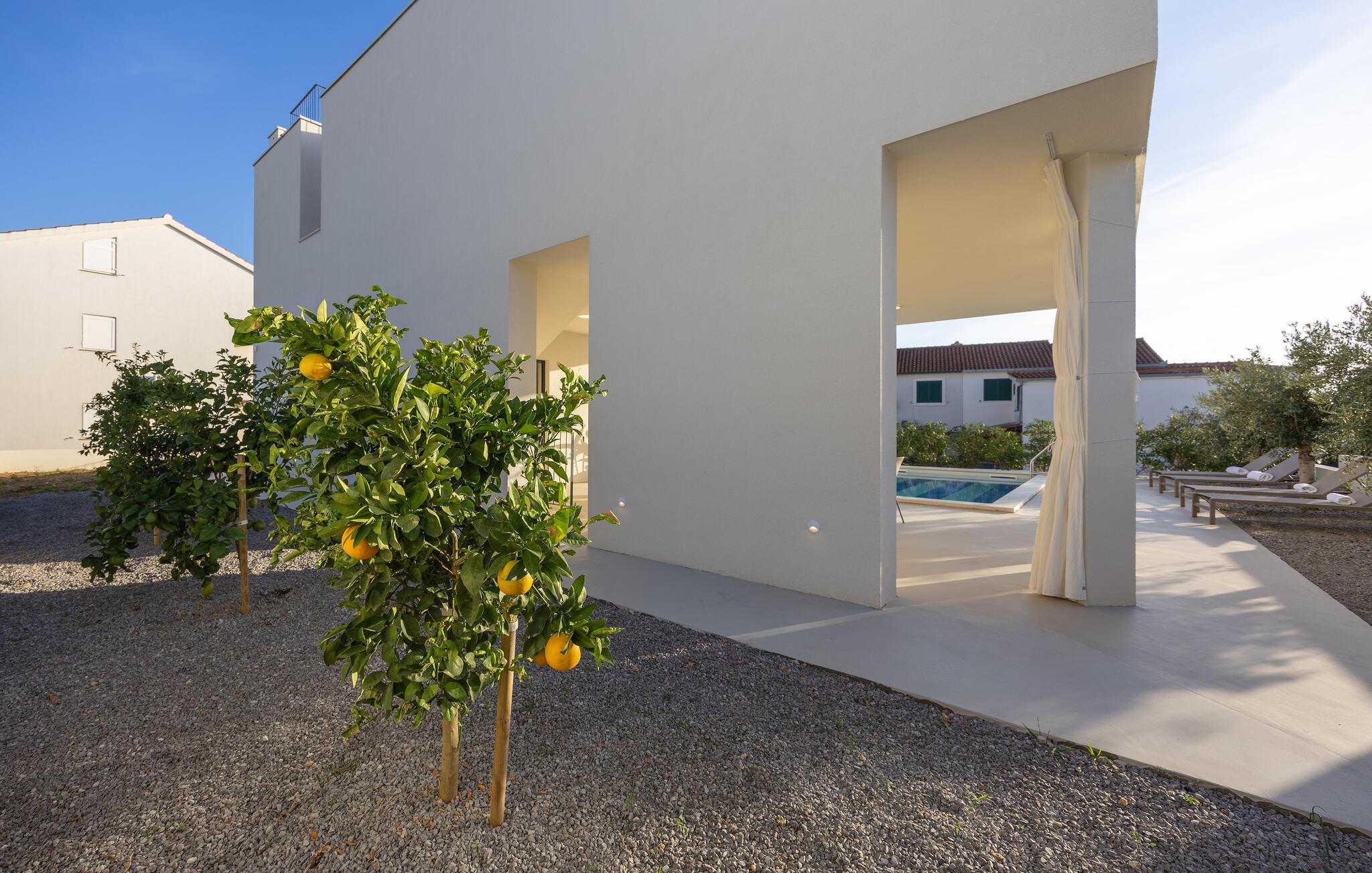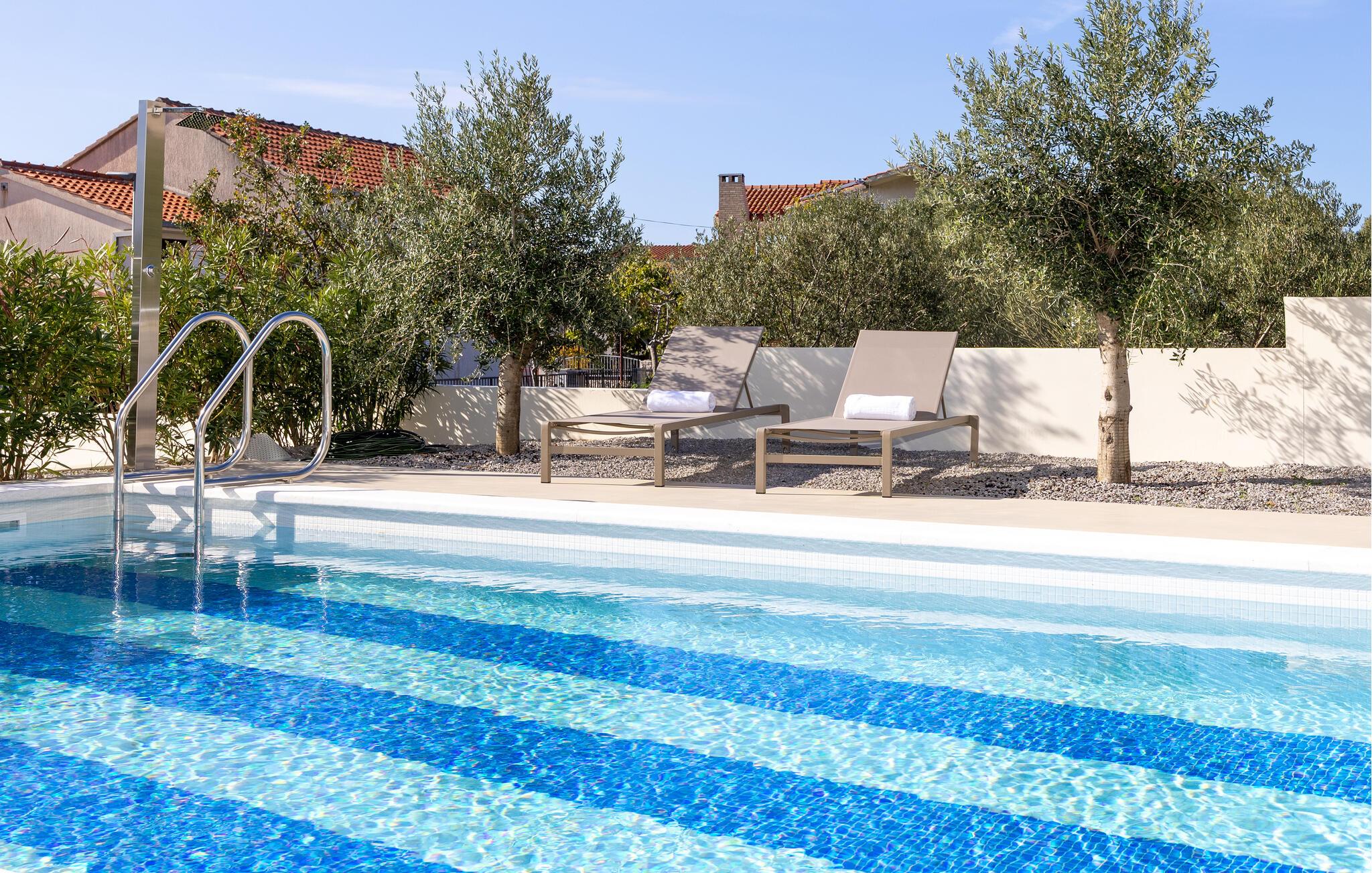 Tilbring en drømmeferie sammen i dette luksuriøse feriehus med pool og havudsigt. Træd indenfor og lad jer betage af den lyse og indbydende atmosfære i denne moderne villa, hvor I vil føle jer fuldstændig veltilpas på alle tider af året. Skab kulinariske lækkerier, saml jer til stilfulde måltider, og glæd jer til hyggelige aftener i den behagelige sofa. Stream en spændende film, eller brug jeres tid sammen til sjove spilleaftener eller en god samtale over et glas vin. En pragtfuld pool venter jer i det elegante udendørsområde, hvor I kan forfriske jer, når I har lyst. Server jeres morgenmad på terrassen, og lad op på de behagelige liggestole. Udforsk den maleriske havn og strandene i Rogoznica, hvor I kan glide hen over det krystalklare vand på et stand-up paddleboard. Tag en dagstur til øen Prvic for at opdage historiske fyrtårne og charmerende landsbyer, eller udforsk den nærliggende by Šibenik med dens imponerende katedral og snoede gader. Beundr vandfaldene i Krka Naturpark, og smag kroatiske specialiteter i traditionelle taverner.