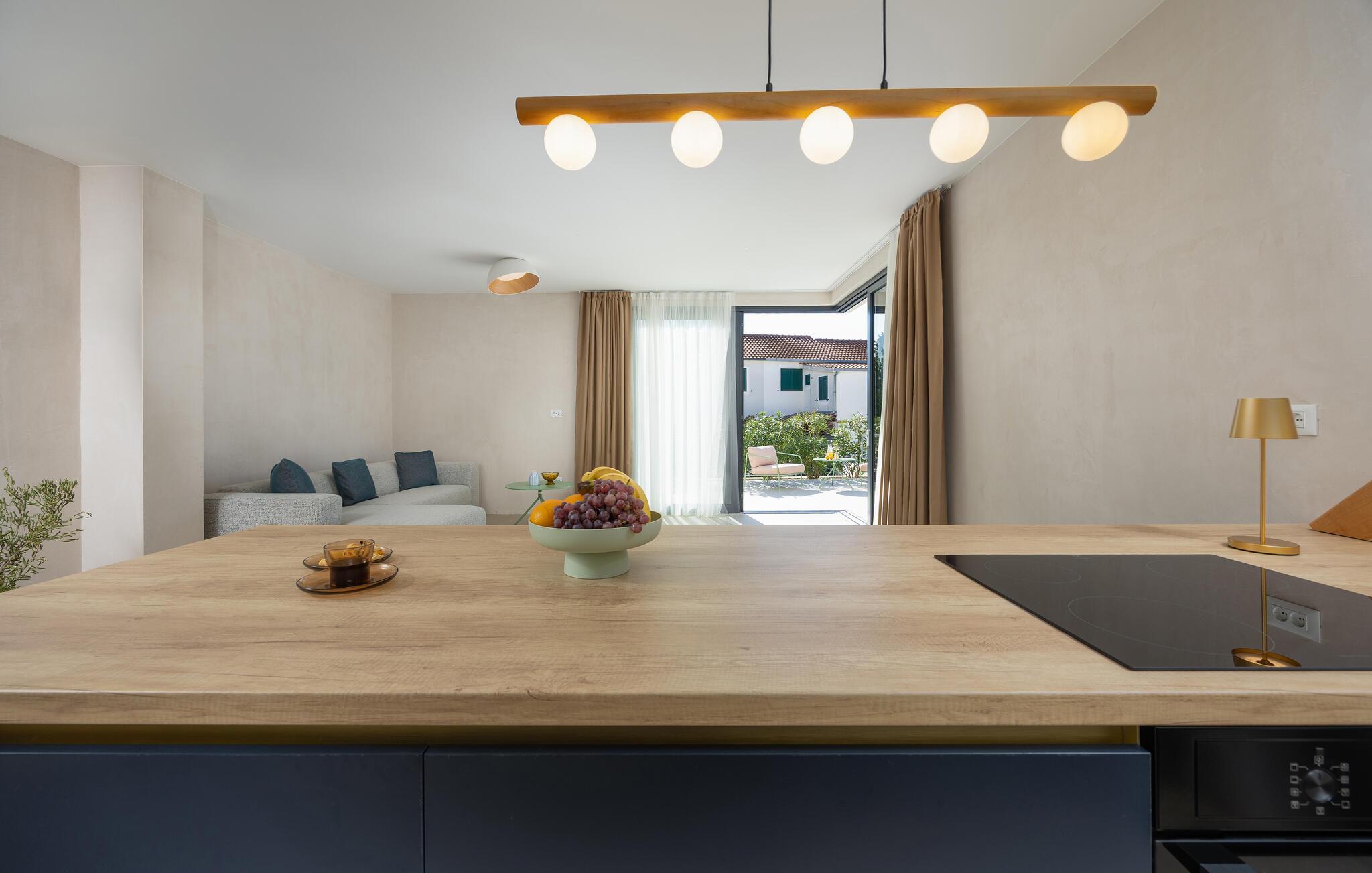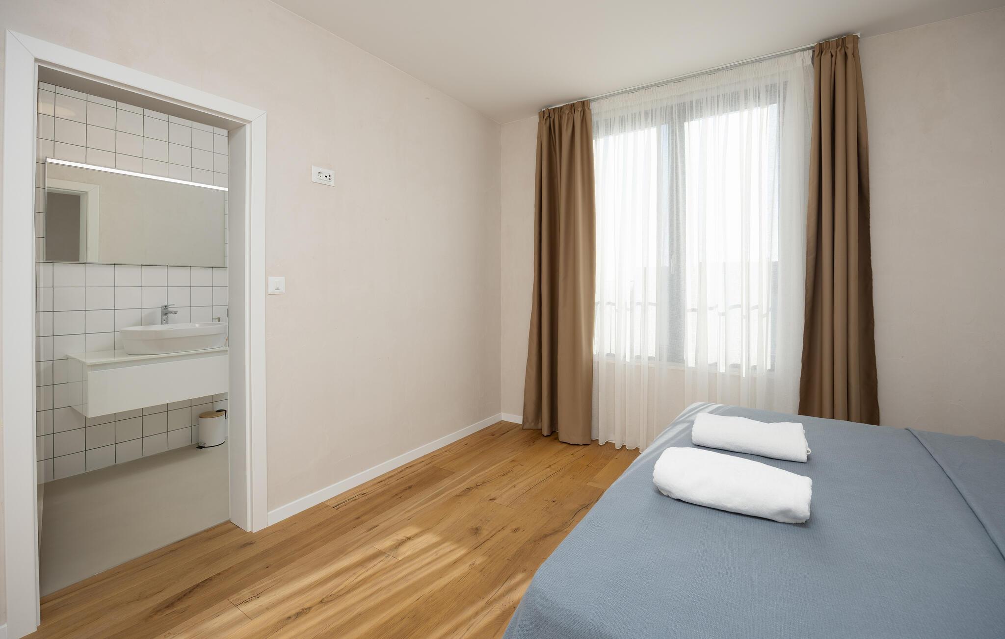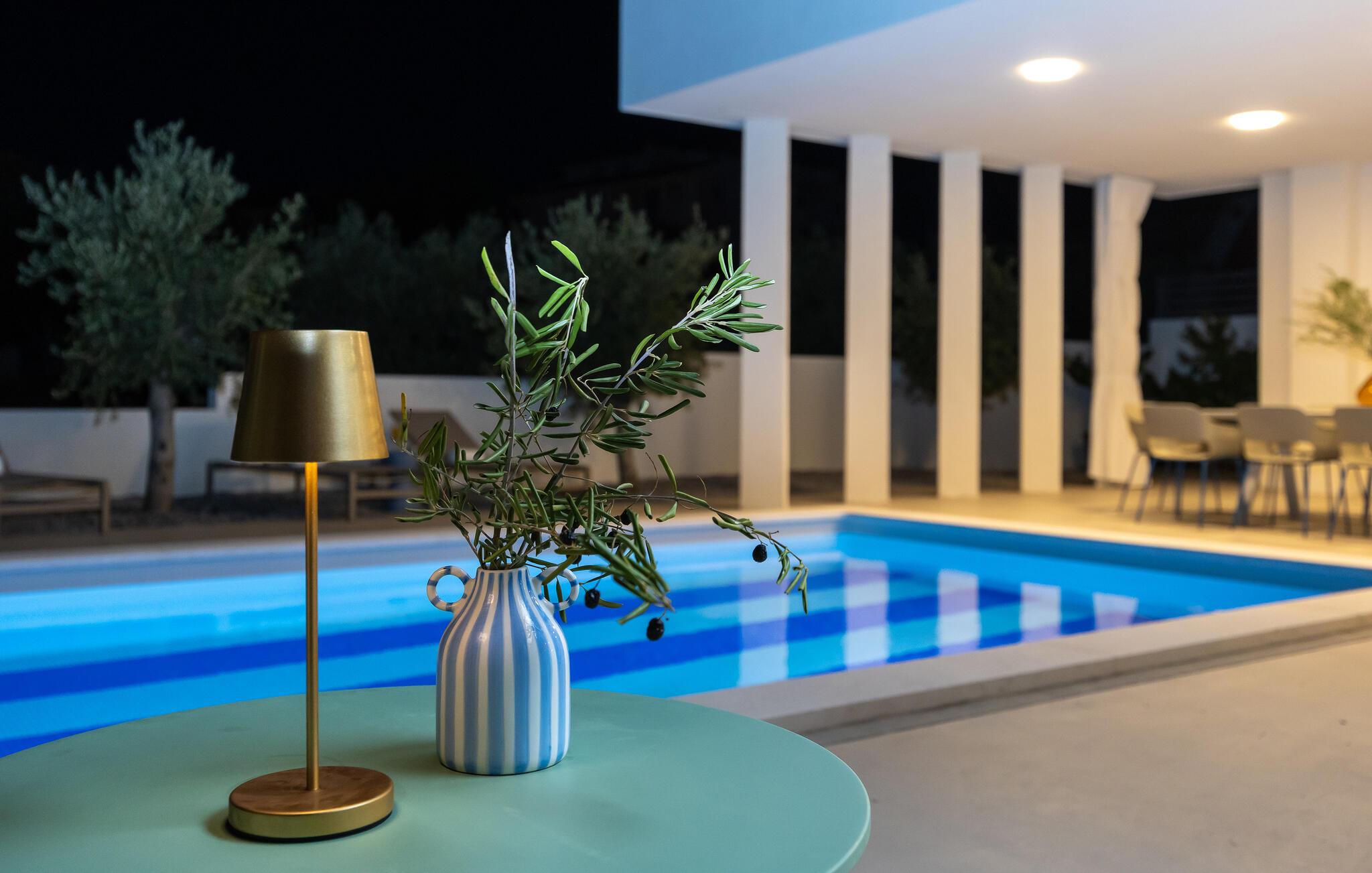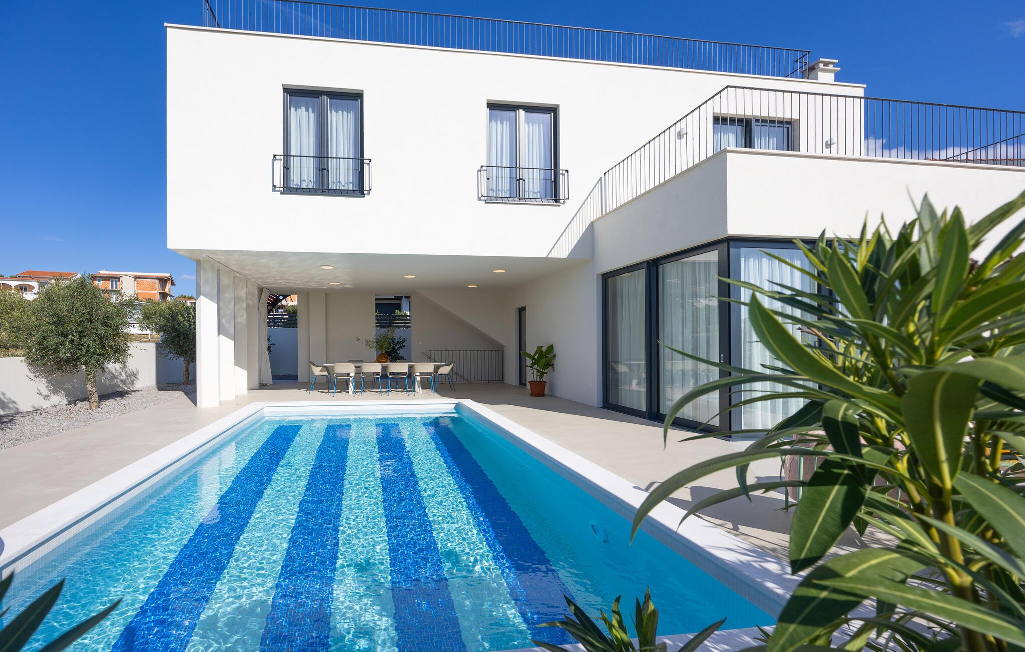 Tilbring en drømmeferie sammen i dette luksuriøse feriehus med pool og havudsigt. Træd indenfor og lad jer betage af den lyse og indbydende atmosfære i denne moderne villa, hvor I vil føle jer fuldstændig veltilpas på alle tider af året. Skab kulinariske lækkerier, saml jer til stilfulde måltider, og glæd jer til hyggelige aftener i den behagelige sofa. Stream en spændende film, eller brug jeres tid sammen til sjove spilleaftener eller en god samtale over et glas vin. En pragtfuld pool venter jer i det elegante udendørsområde, hvor I kan forfriske jer, når I har lyst. Server jeres morgenmad på terrassen, og lad op på de behagelige liggestole. Udforsk den maleriske havn og strandene i Rogoznica, hvor I kan glide hen over det krystalklare vand på et stand-up paddleboard. Tag en dagstur til øen Prvic for at opdage historiske fyrtårne og charmerende landsbyer, eller udforsk den nærliggende by Šibenik med dens imponerende katedral og snoede gader. Beundr vandfaldene i Krka Naturpark, og smag kroatiske specialiteter i traditionelle taverner.