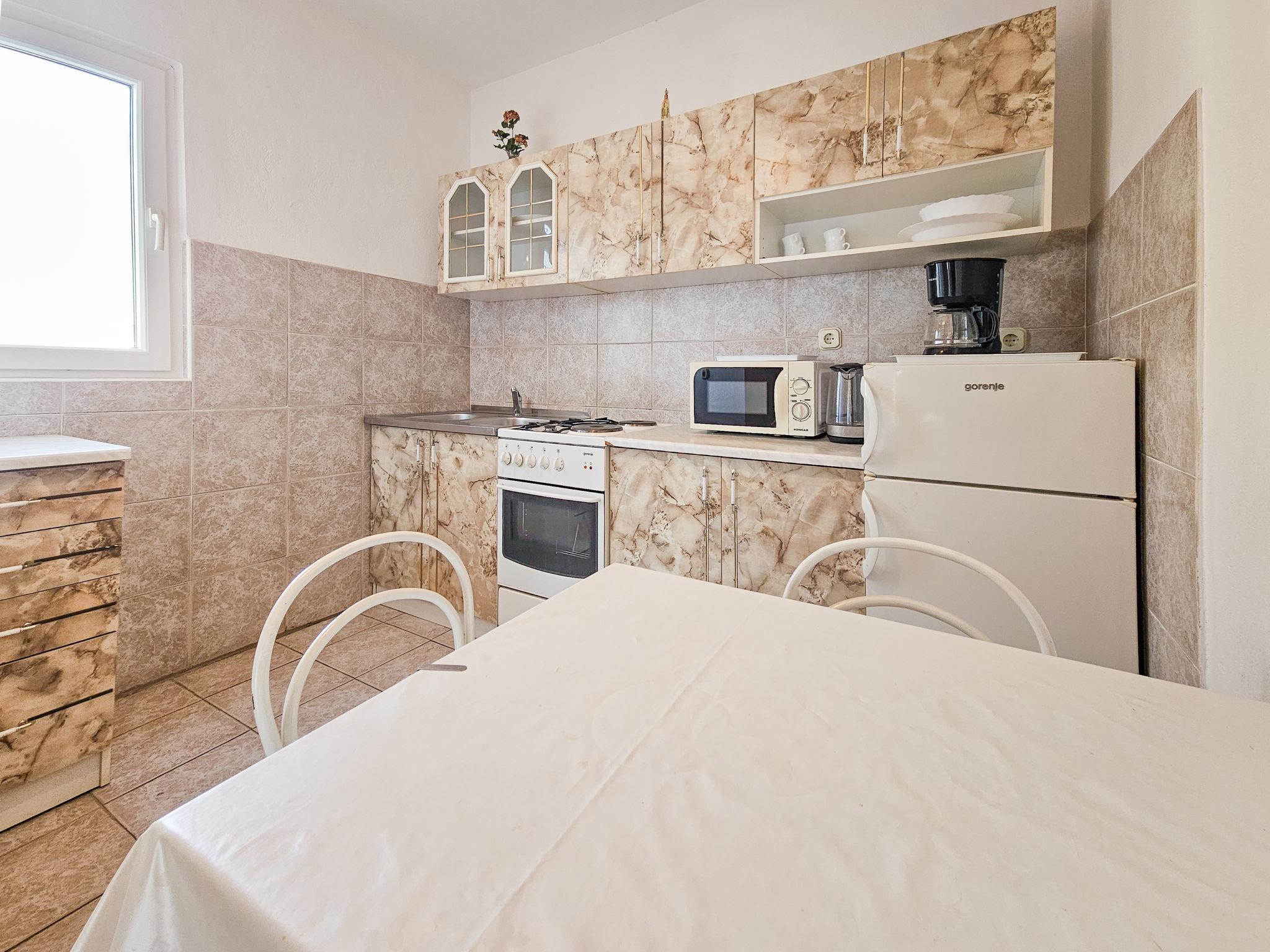 "A3", 2-room apartment 40 m2 on 2nd floor, south facing position. 1 room with 1 bed (90 cm, length 200 cm), 1 double bed (2 x 80 cm, length 200 cm), shower/WC and satellite TV (flat screen), air conditioning. Exit to the terrace. Kitchen (4 hot plates, oven, microwave, freezer, electric coffee machine). Exit to the terrace. Terrace 5 m2, roofed. Balcony furniture. Very beautiful view of the sea. Facilities: hair dryer. Internet (WiFi, free).