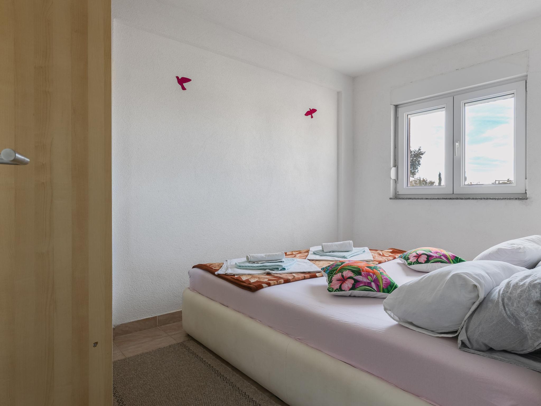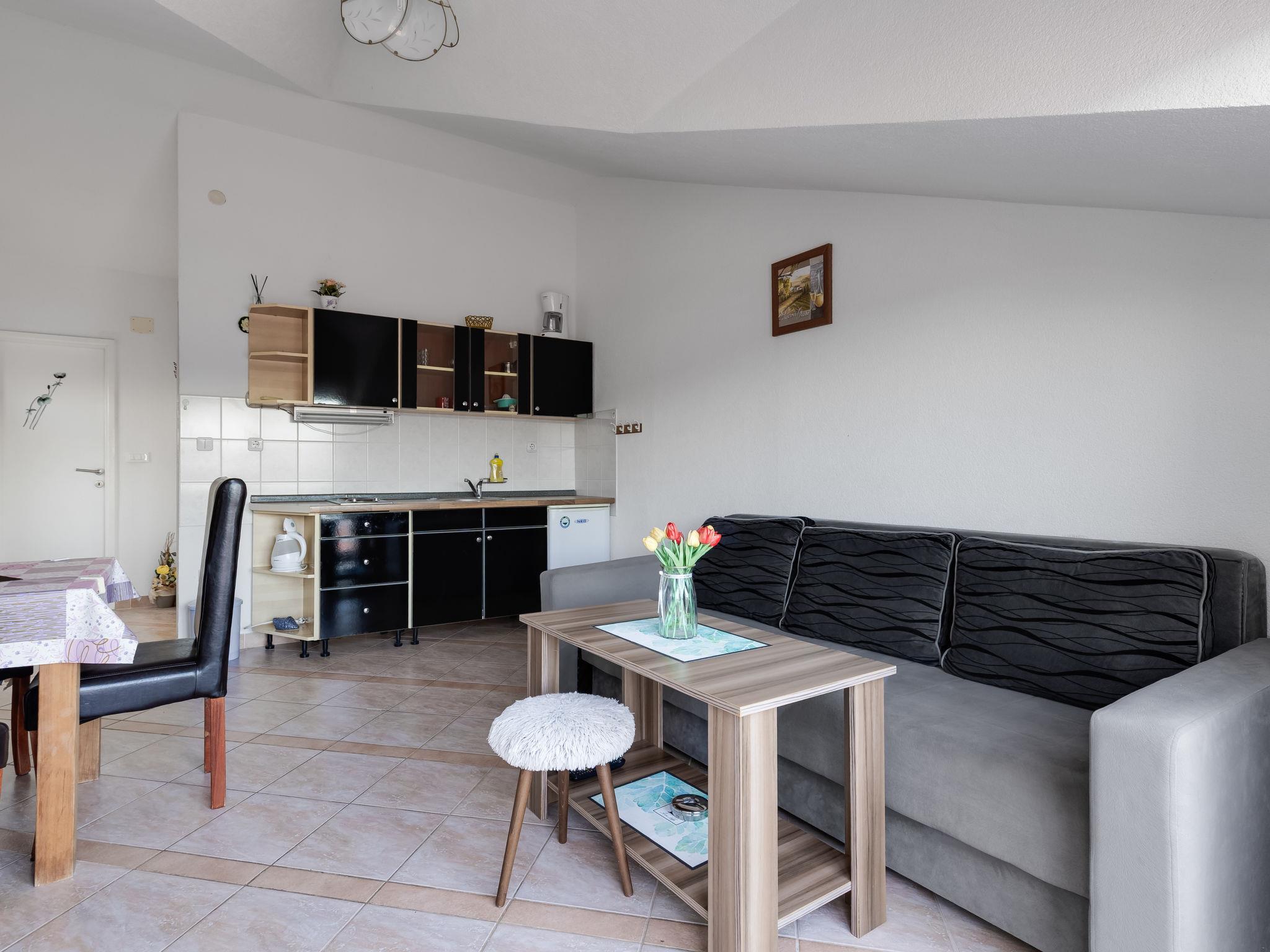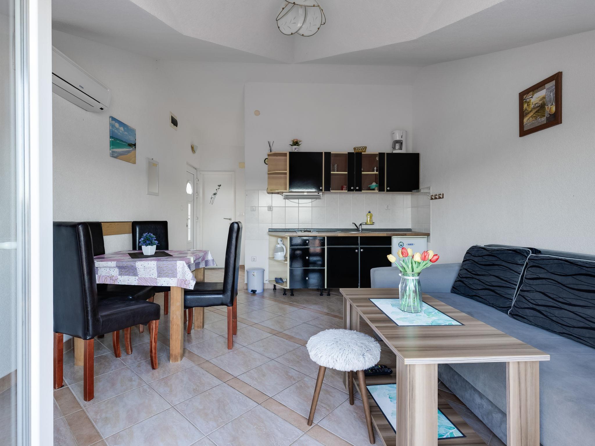 2-room apartment 42 m2, on the top floor, south-east facing position. Living/dining room with 1 double sofabed (160 cm, length 200 cm), satellite TV (flat screen), air conditioning. Exit to the balcony. 1 room with 1 french bed (160 cm, length 200 cm). Open kitchen (2 hot plates, kettle, electric coffee machine). Shower/WC. No heating option. Balcony 5 m2. Balcony furniture. Beautiful, of the sea. Facilities: hair dryer. Internet (WiFi).