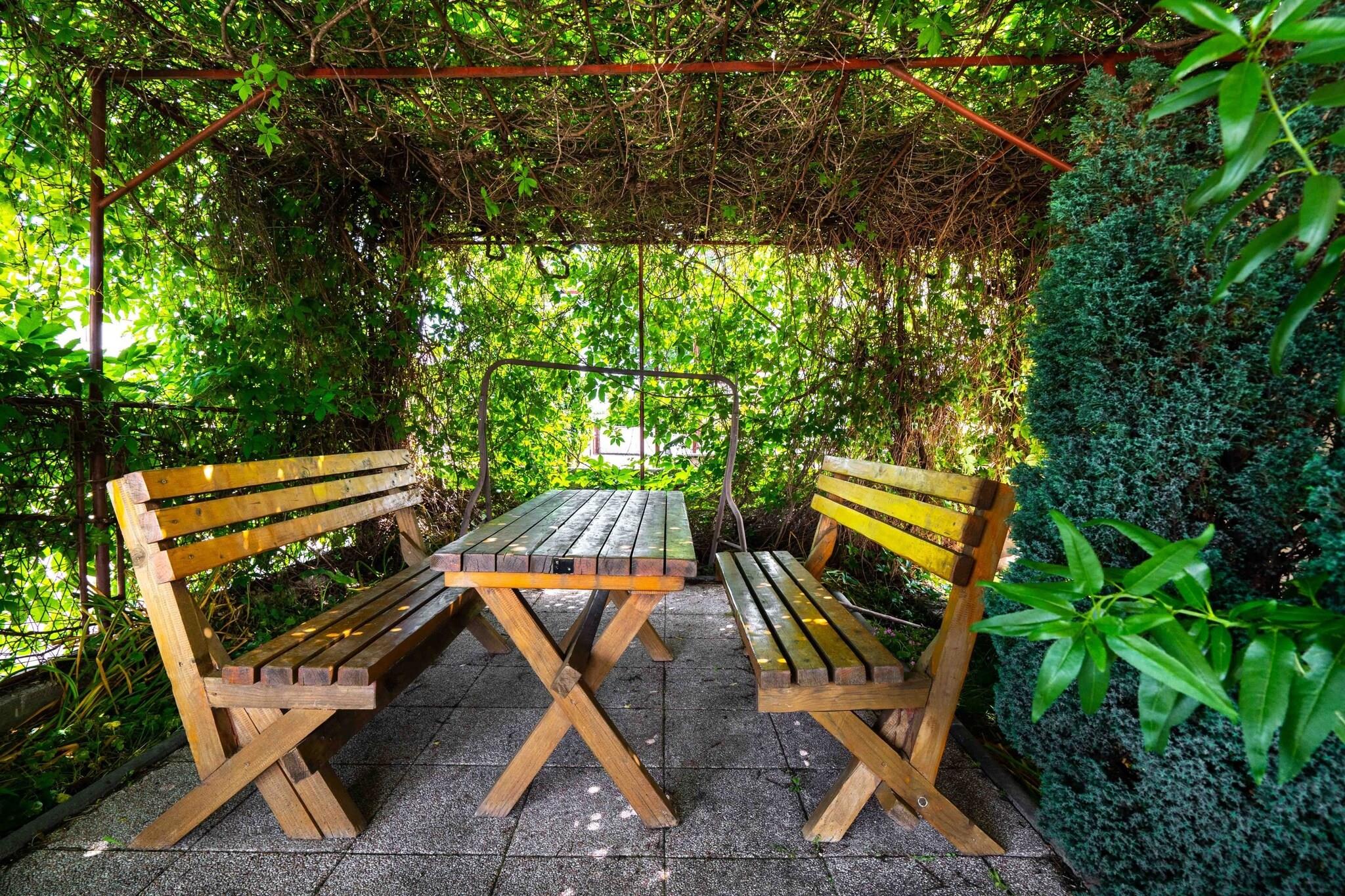On the 1st floor: (Kitchen(dining table, stove, electric kettle, toaster, oven, fridge-freezer), bedroom(double bed), bedroom(double bed, balcony), bathroom(shower, washbasin, toilet), air conditioning) seating area, grill, BBQ, parking, play equipment