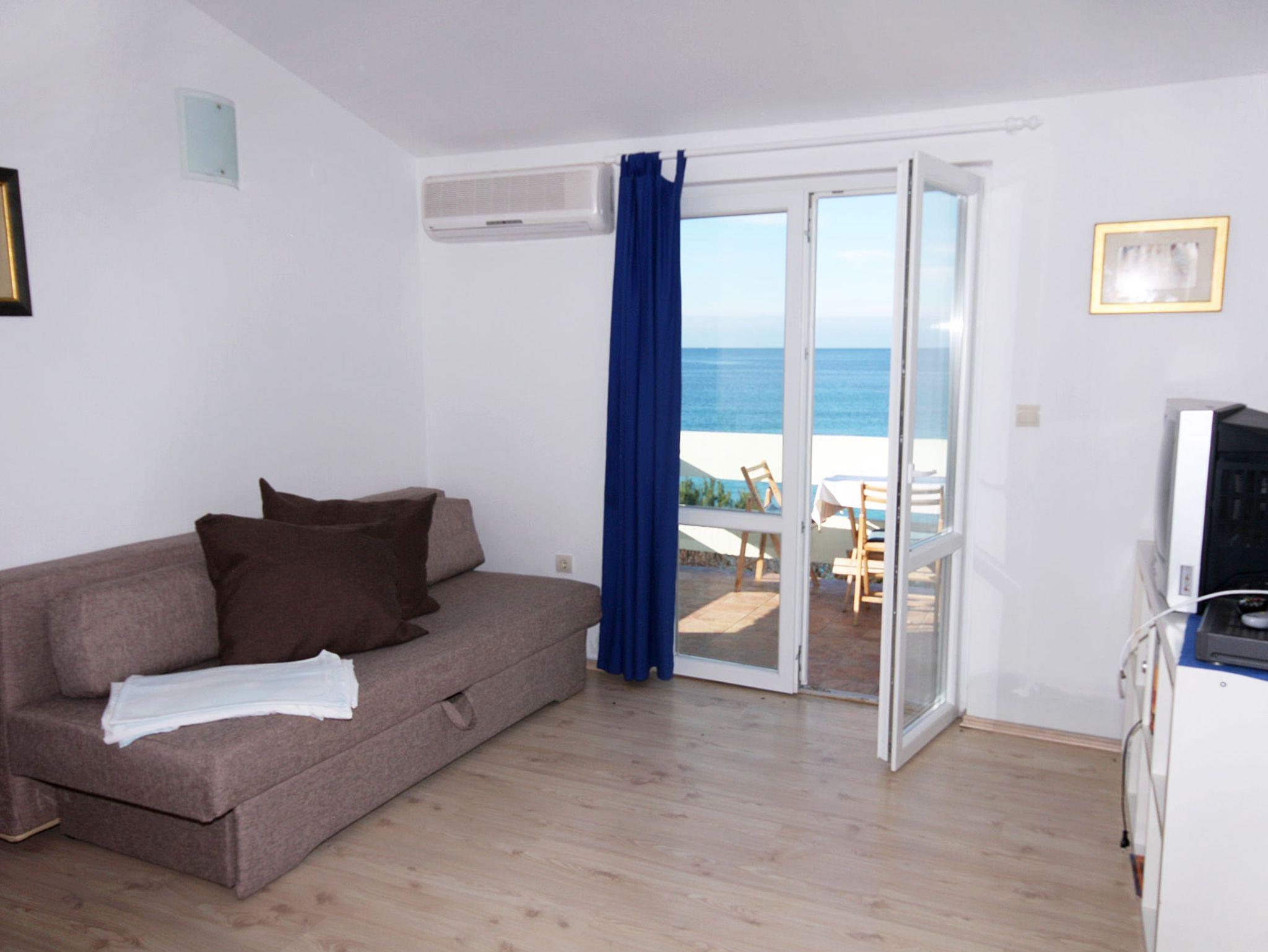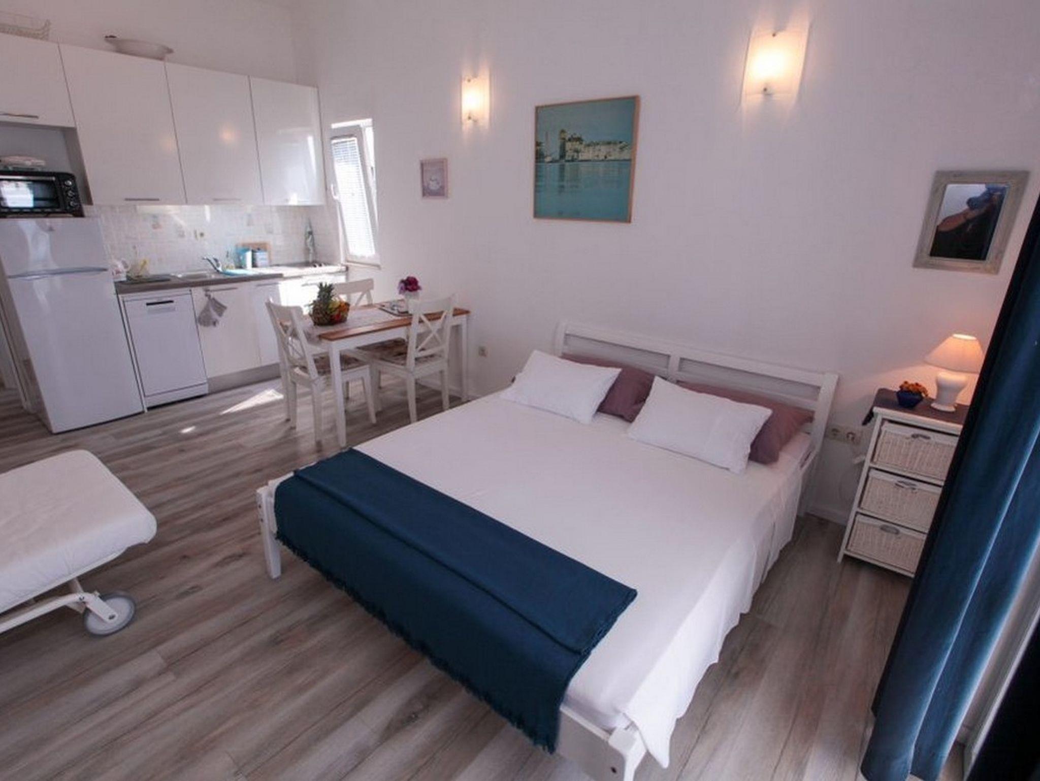 Studio bietet Platz für 3 Gäste. Die Betten sind in Schlafzimmern, die es 1 gibt, innerhalb einer Gesamtfläche von 24m2, angeordnet. Die Gäste haben eine eigene Terrasse zur Verfügung, auf der sie in warmen Sommernächten genießen können. Das Studio-Apartment bietet Meerblick. Es ist erlaubt, Speisen auf dem Gemeinschafts-Grill vorzubereiten. IM PREIS INBEGRIFFEN: Kurtaxe, Endreinigung, Klimatisierung, Parkplatz, Internet, Wäschewaschen, Bootsanlegeplatz, Kinderbett, Bügeleisen, Bügelbrett, Föhn, Sonnenschirm. VERBINDLICHE ZUSÄTZLICHE KOSTEN: Aufzahlung für Kurzaufenthalte (prozentualer Zuschlag pro Nächtigungsanzahl: 30% - 1, 20% - 2, 10% - 3). UNVERBINDLICHE ZUSÄTZLICHE KOSTEN: Fahrrad (5,00 € täglich (pro Stück)), Zusatzbett (10,00 € pro Nacht). Die Verfügbarkeit zusätzlicher Dienstleistungen in Ihrem reservierten Termin und die Preise derselben (falls nicht aufgeführt) müssen im Voraus überprüft werden. Zusätzliche Dienstleistungen die in der Zahlungsaufforderung nicht aufgeführt sind werden direkt beim Vermieter bezahlt, angenommen der Gast nutzt auch diese.