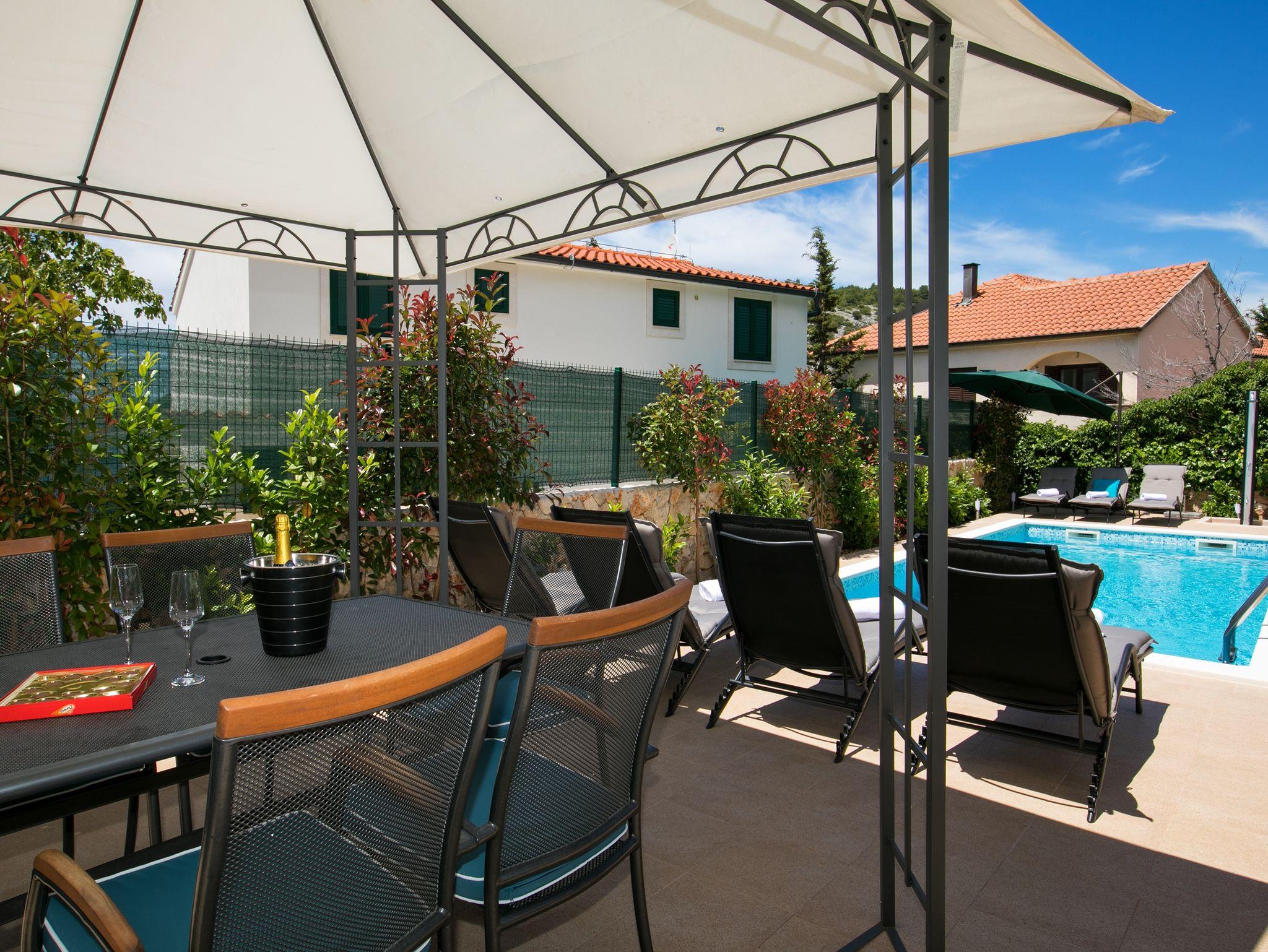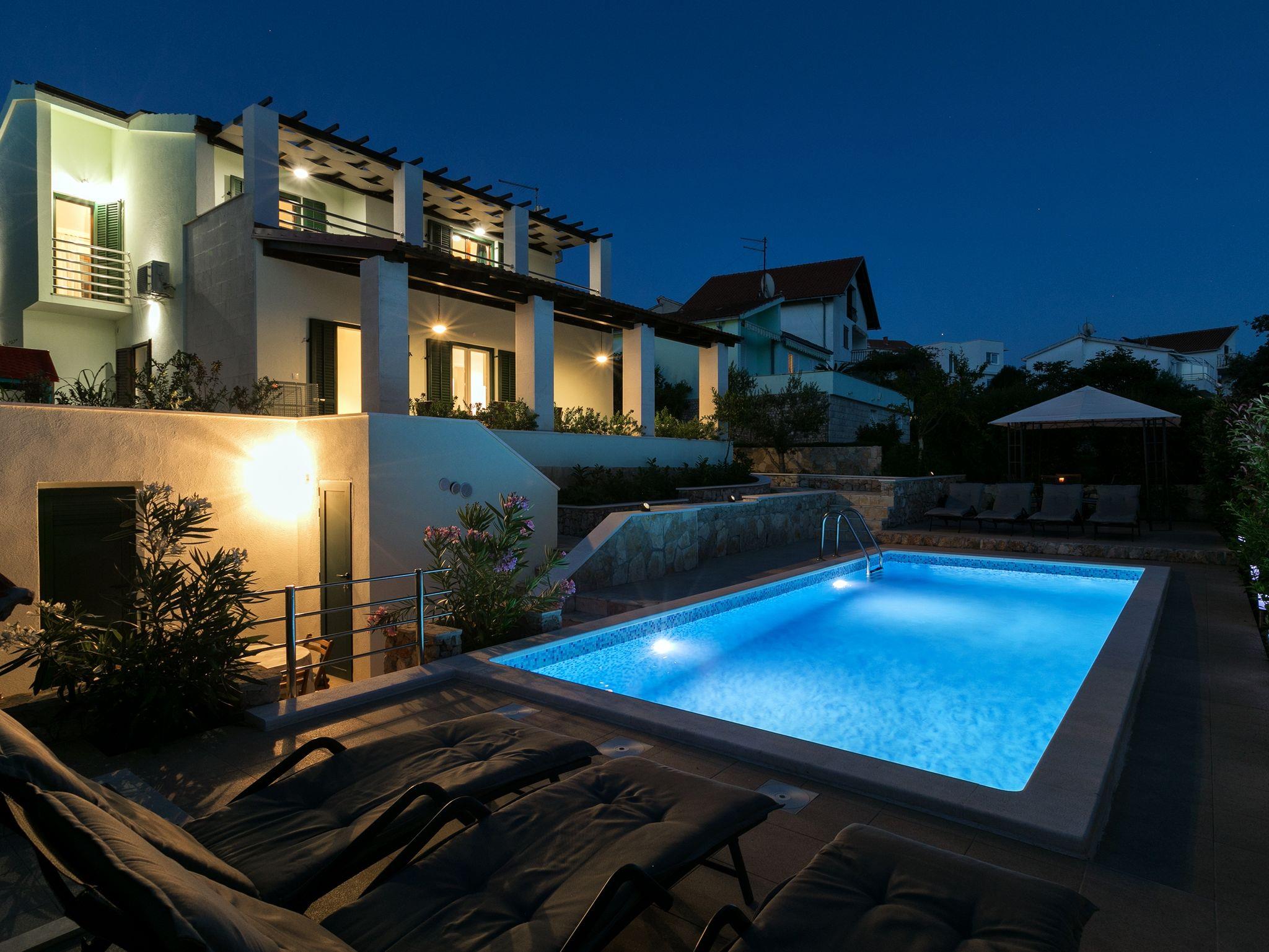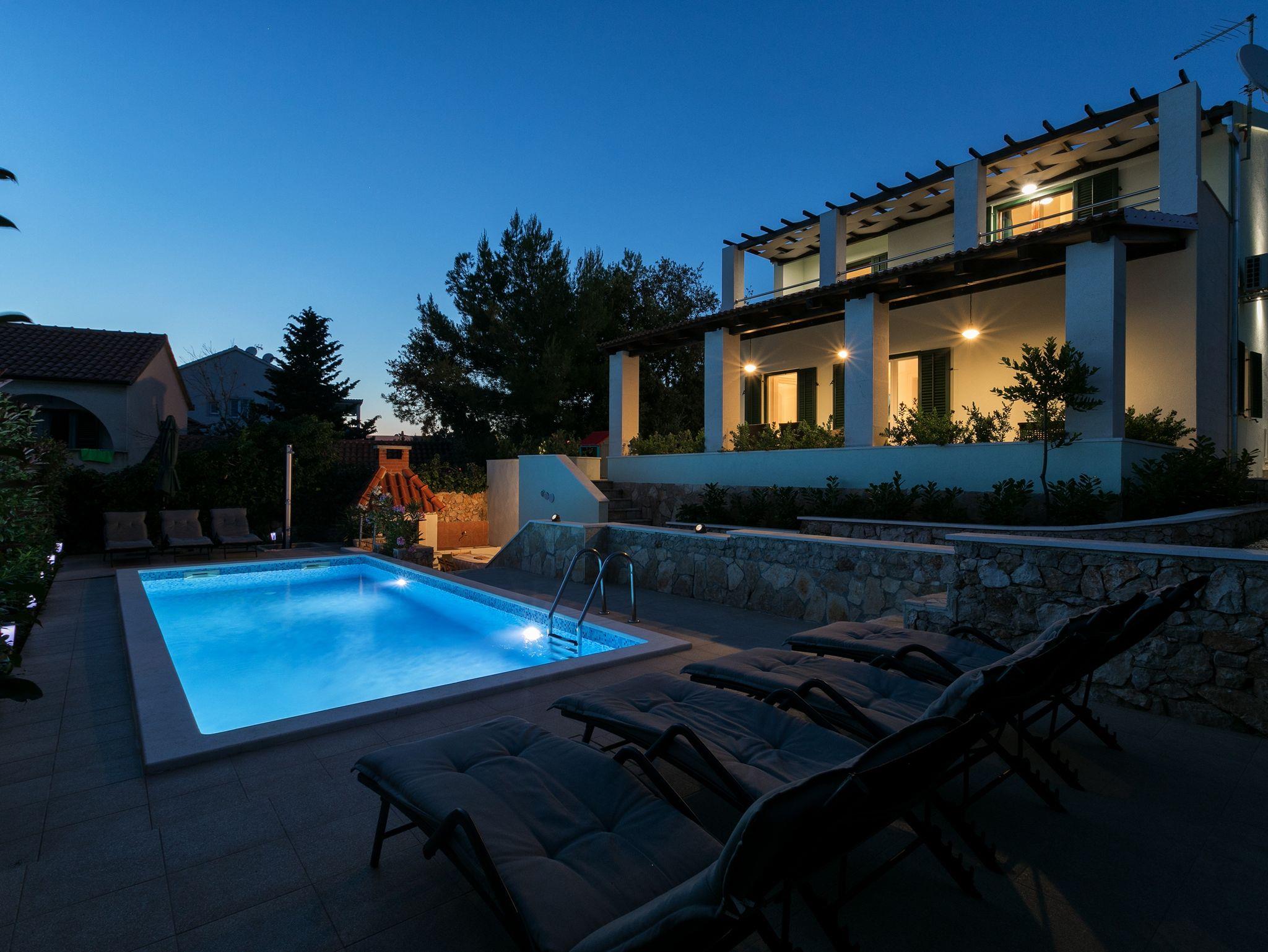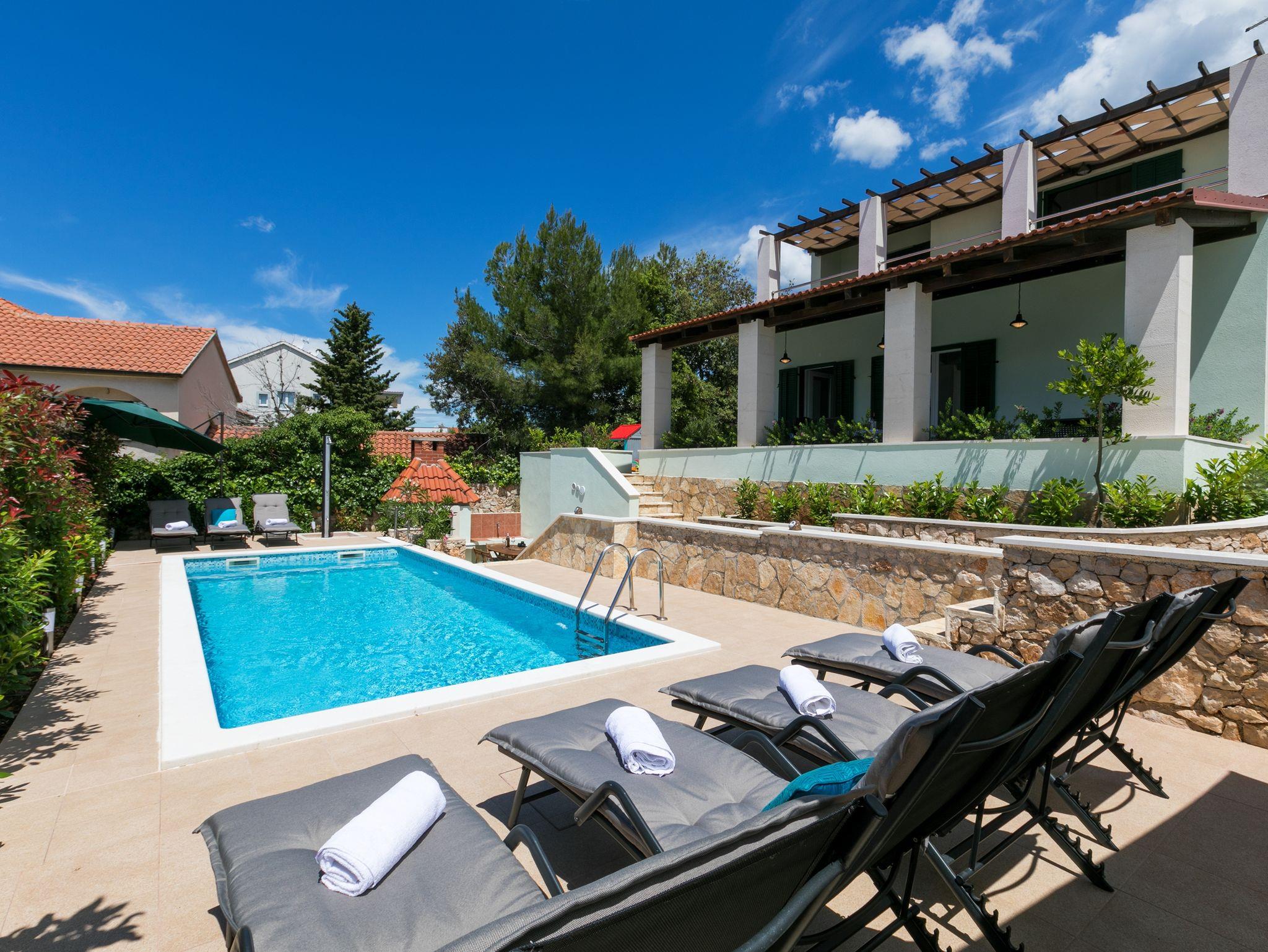 Haus bietet Platz für 10 Gäste. Die Betten sind in Schlafzimmern, die es 4 gibt, und in Wohnzimmer, innerhalb einer Gesamtfläche von 127m2, angeordnet. Die Gäste haben eine eigene Terrasse zur Verfügung, auf der sie in warmen Sommernächten genießen können. Das Haus bietet Meerblick. Für vollen Genuss und Entspannung gibt es einen privaten Grill für Gäste dieser Unterkunft. Während ihres Aufenthalts können sich Gäste im privaten Schwimmbad entspannen. In der Unterkunftseinheit besteht die Möglichkeit des Mitbringens von Haustieren, und die Dienstleistung ist im Preis der Unterkunft enthalten. Räume der gebuchten Unterkunftseinheit werden nicht in eine Ganze verbunden. IM PREIS INBEGRIFFEN: Kurtaxe, Endreinigung, Klimatisierung, Pool, Parkplatz, Internet, Haustiere, Bügeleisen, Bügelbrett, Föhn, tragbarer Grill. Die Verfügbarkeit zusätzlicher Dienstleistungen in Ihrem reservierten Termin und die Preise derselben (falls nicht aufgeführt) müssen im Voraus überprüft werden. Zusätzliche Dienstleistungen die in der Zahlungsaufforderung nicht aufgeführt sind werden direkt beim Vermieter bezahlt, angenommen der Gast nutzt auch diese. Ermäßigung auf den Grundpreis: Gratistag 21=19 (bei einem Aufenthalt von 21 Tagen oder mehr erhalten Sie 2 Gratistage für den Aufenthalt bis 31.12.26).