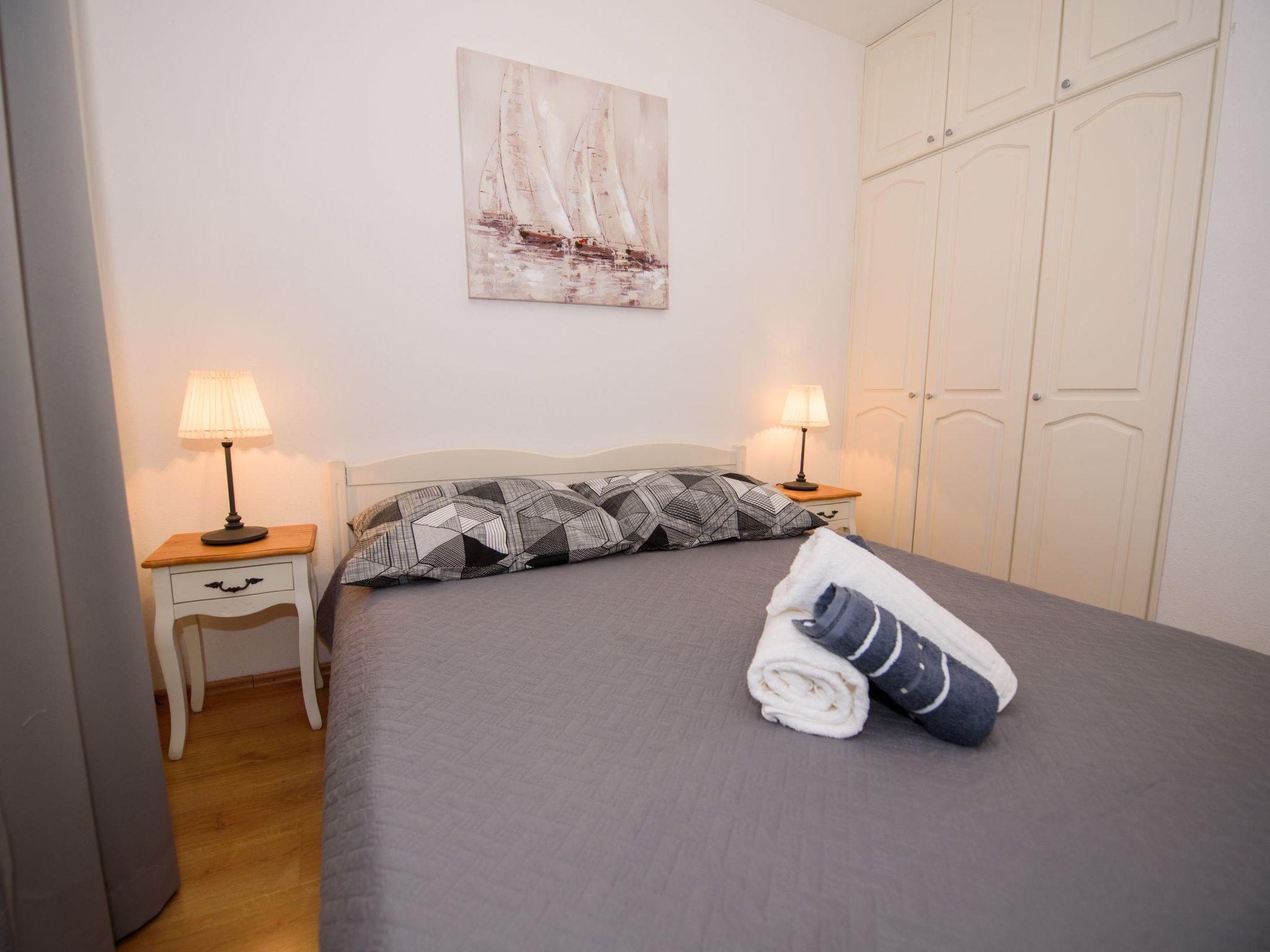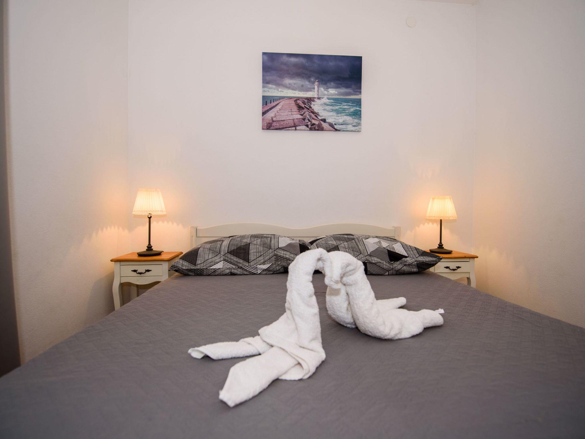 3-room apartment 45 m2 on 1st floor. Beautiful and tasteful furnishings: living/dining room with satellite TV (flat screen), air conditioning. Exit to the terrace. 2 rooms, each room with 1 double bed (2 x 80 cm, length 200 cm). Open kitchen (2 ceramic glass hob hotplates, microwave, freezer, electric coffee machine). Shower/WC. Air-conditioning (extra). No heating option. Large terrace 20 m2, roofed, south facing position. Terrace furniture, deck chairs (2). Marvellous view of the sea. Facilities: Internet (WiFi).