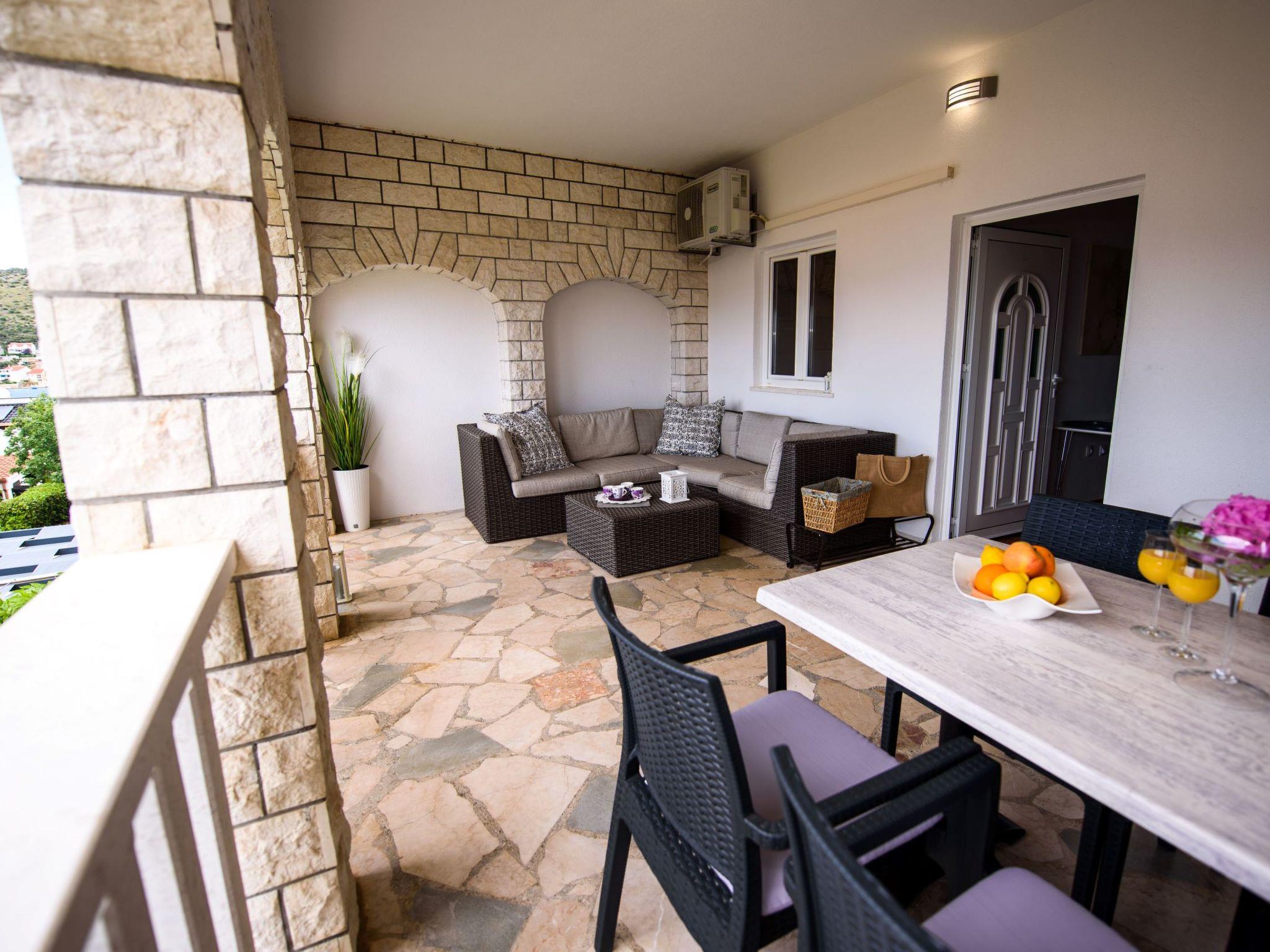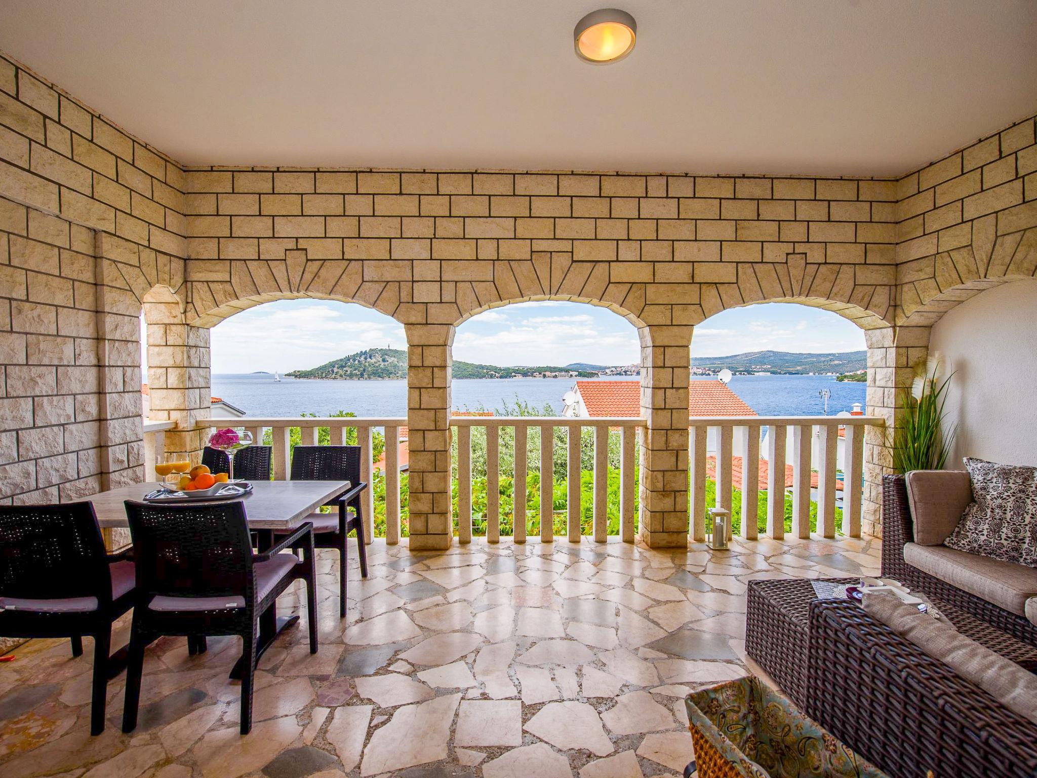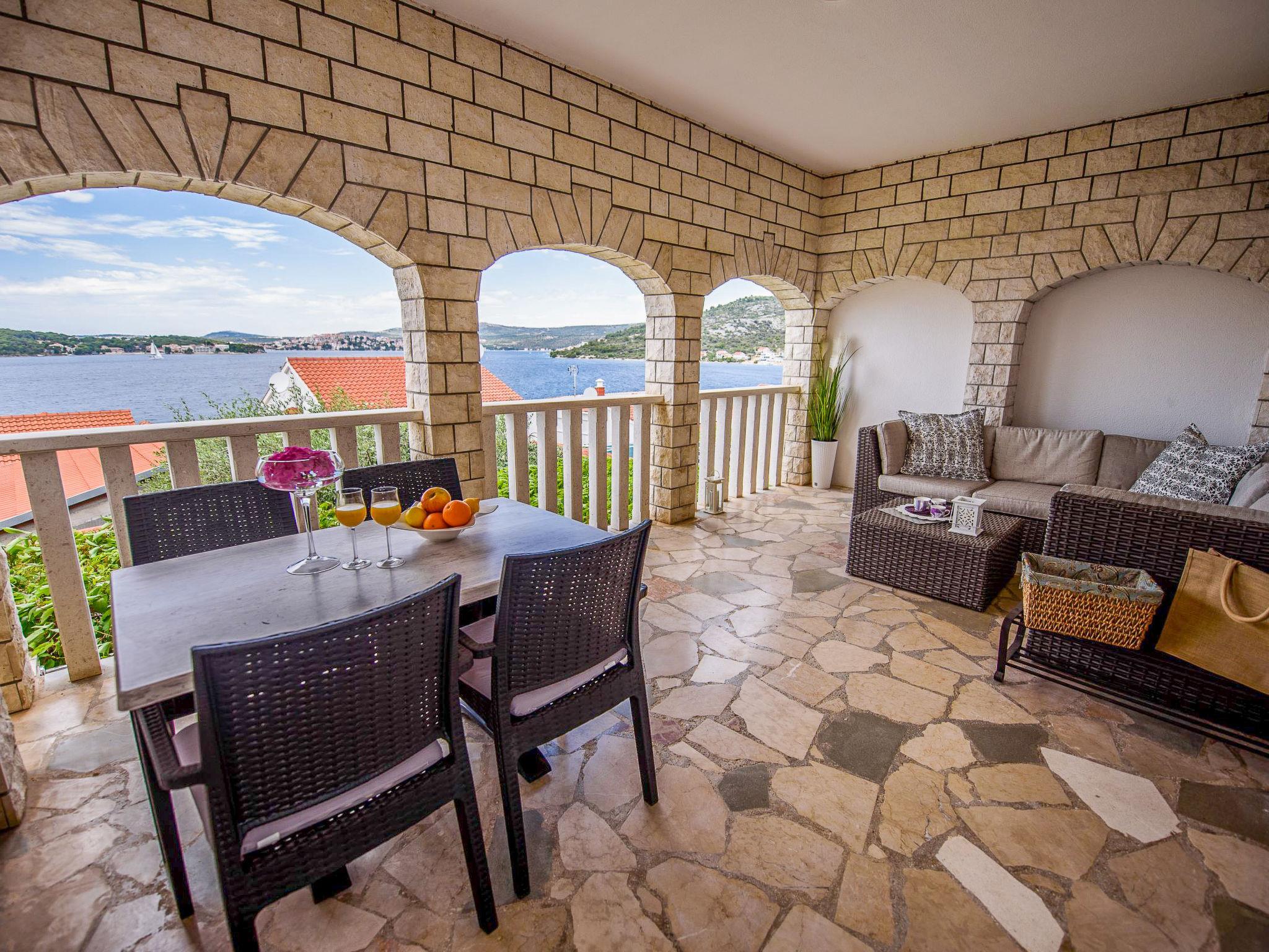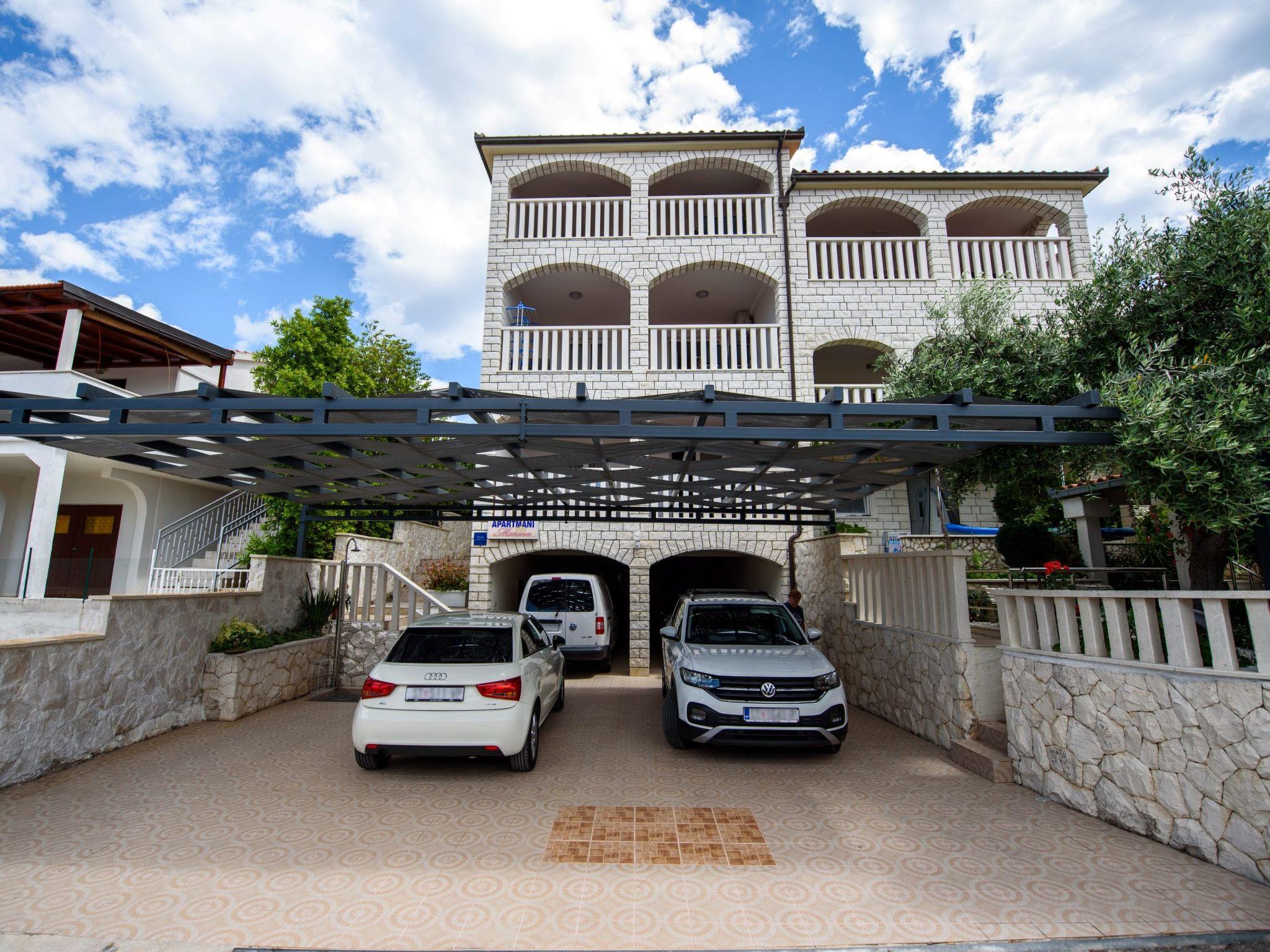 Razanj 10 km from Rogoznica: Beautiful apartment block "Marina". In the district of Ljoljinica, in a quiet, elevated position, 40 m from the sea. For shared use: outdoor shower, terrace, garden furniture, barbecue. In the house: internet access. Roofed, parking at the house on the premises, communal covered parking. Shop, restaurant 200 m, bus stop 5.1 km, rocky beach 40 m. Please note: Additional accommodations can be booked.