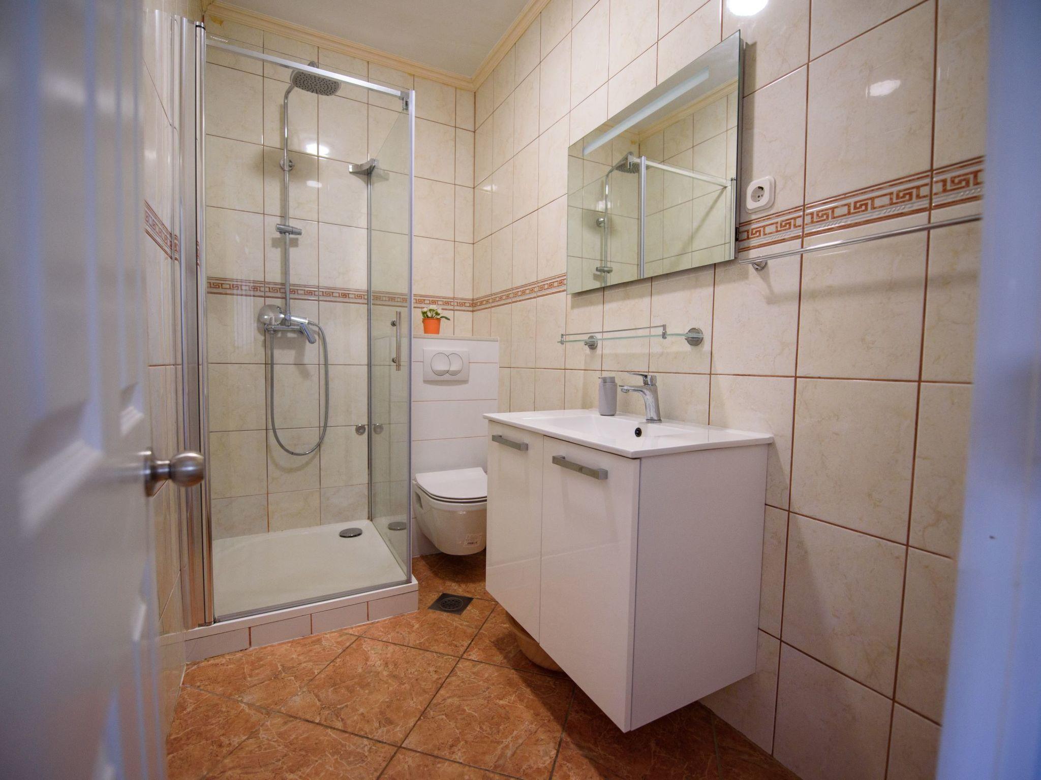3-room apartment 32 m2 on 1st floor. Beautiful and tasteful furnishings: large living/dining room with satellite TV (flat screen), air conditioning. Exit to the terrace. 1 room with 1 french bed (160 cm, length 200 cm). 1 room with 1 bed (90 cm, length 200 cm). Open kitchen (4 hot plates, oven, electric coffee machine). Shower/WC. Air-conditioning (extra). Large terrace 20 m2, roofed, south facing position. Terrace furniture, deck chairs (2). Marvellous view of the sea. Facilities: Internet (WiFi).