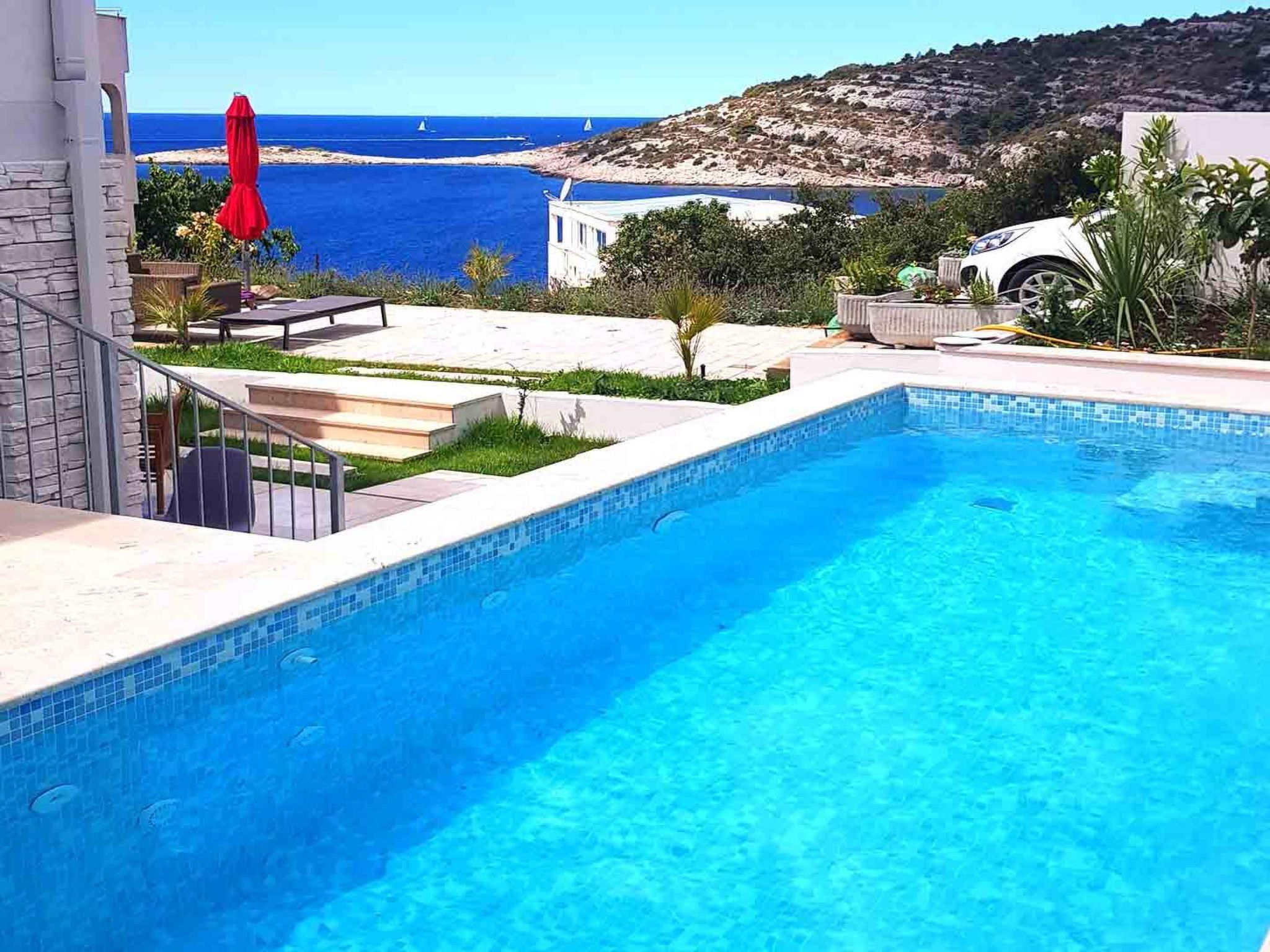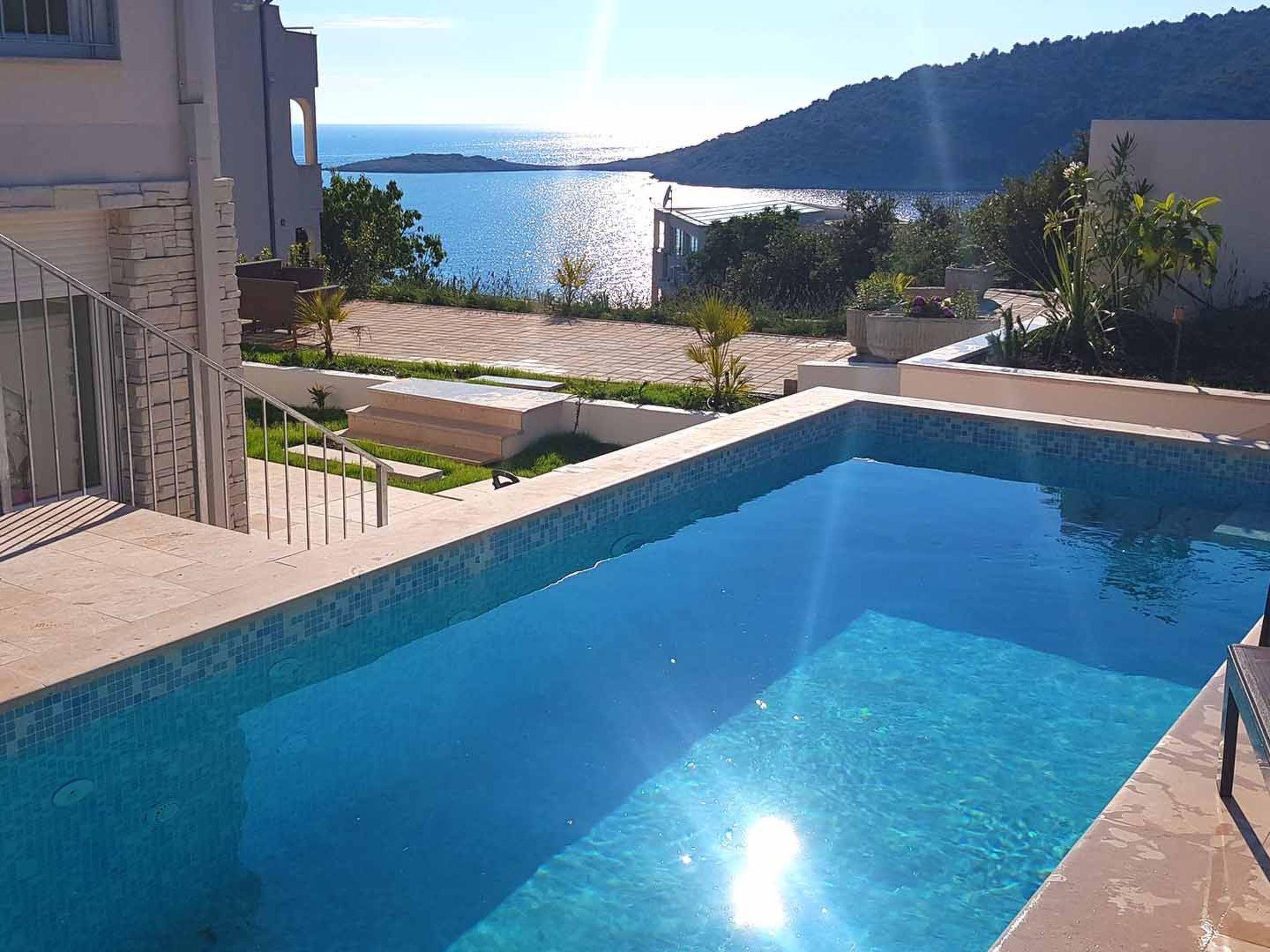 The outdoor area is designed as a comfortable garden equipped with outdoor table and chairs and a lounge area, while the guests can find refreshment in the heated outdoor pool (21 m2) with waterfall feature or soak up the sunshine on sun loungers around the pool, all while admiring the breathtaking seaview. Those who enjoy cooking outdoors will have outdoor barbecue on disposal.