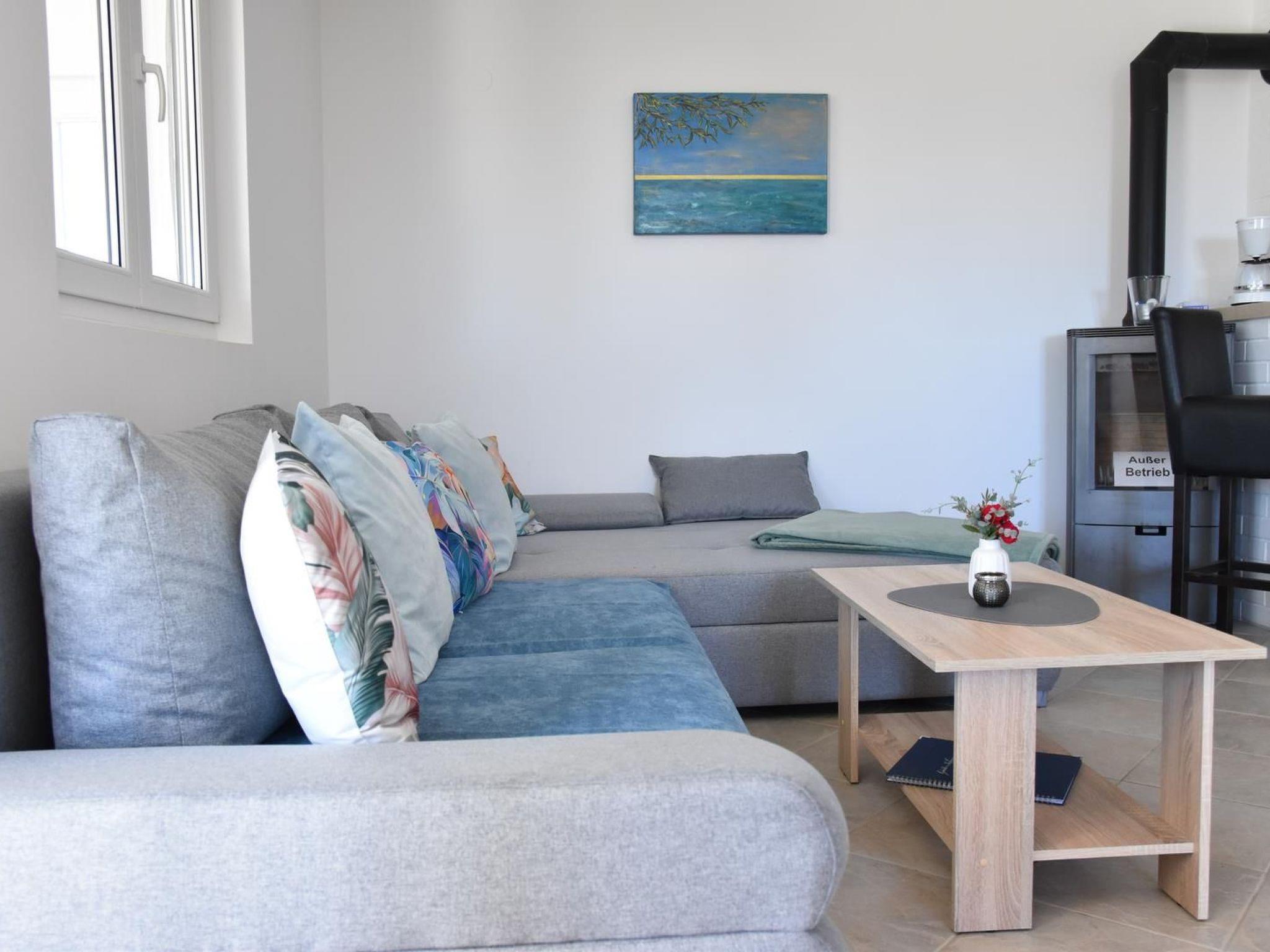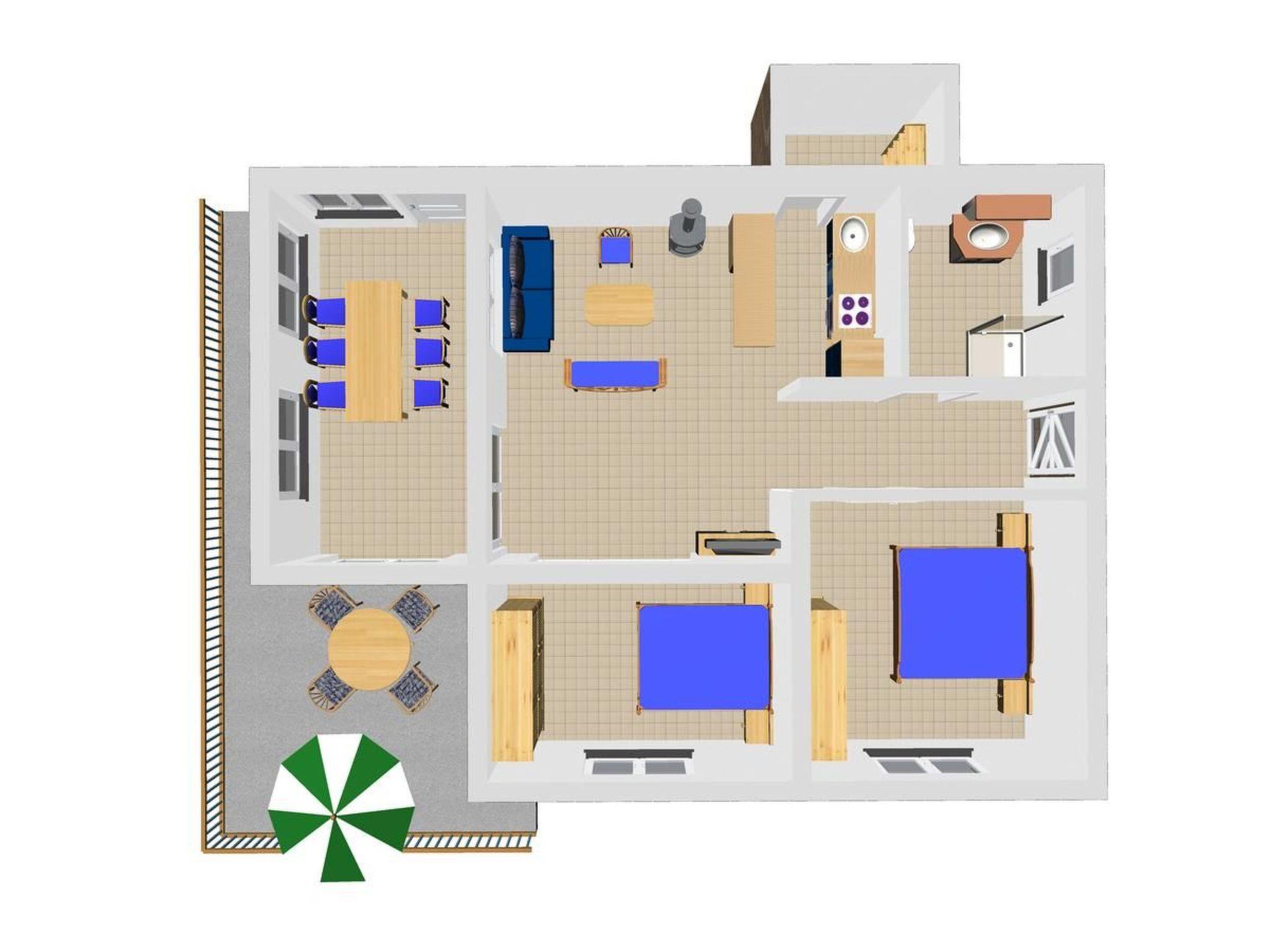 The flat is located on the ground floor of the villa, with direct access to the garden. In the living area there is a sofa bed for one guest or two small children. From the sofa you have a view of the open-plan kitchen with counter. In addition to all the important kitchen utensils, you will find a dishwasher, kettle, toaster and gas hob. The dining table with wood-burning stove and TV in the living area invites you to dine and socialise together after preparing and cooking. Adjacent to the living room is a bedroom with a double bed, which can be separated by a sliding door. The second bedroom, also with a double bed, is located separately. The entire flat can be cooled via the new air conditioning system with remote control (2015). A large, spacious bathroom with an equally spacious shower and WC complete the offer in the holiday flat.