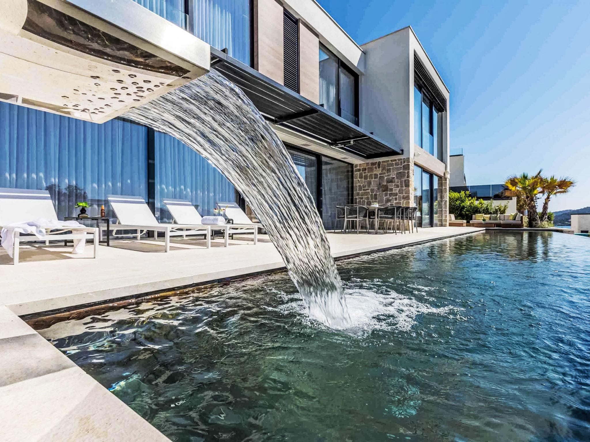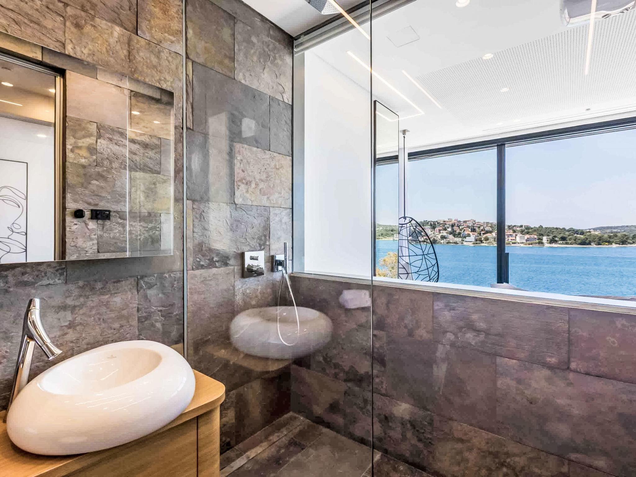 Villa "Vista I", 2 storeys, detached. Zatoglav 5 km from the centre of Rogoznica, in a quiet, sunny, elevated position, 50 m from the sea, 70 m from the beach, west facing position. For shared use: private beach, hot tub, garden furniture. Private: property 500 m2, swimming pool angular (50 m2, depth 150 cm, seasonal availability: 01.May. - 01.Oct.). Outdoor shower, terrace (15 m2), barbecue. In the house: internet access, WiFi, washing machine, tumble dryer. Parking (for 3 cars) at the house on the premises. Shop 4 km, restaurant 5 km, bakery 4 km, bus stop 1.5 km, rocky beach 180 m. Marina 5 km.