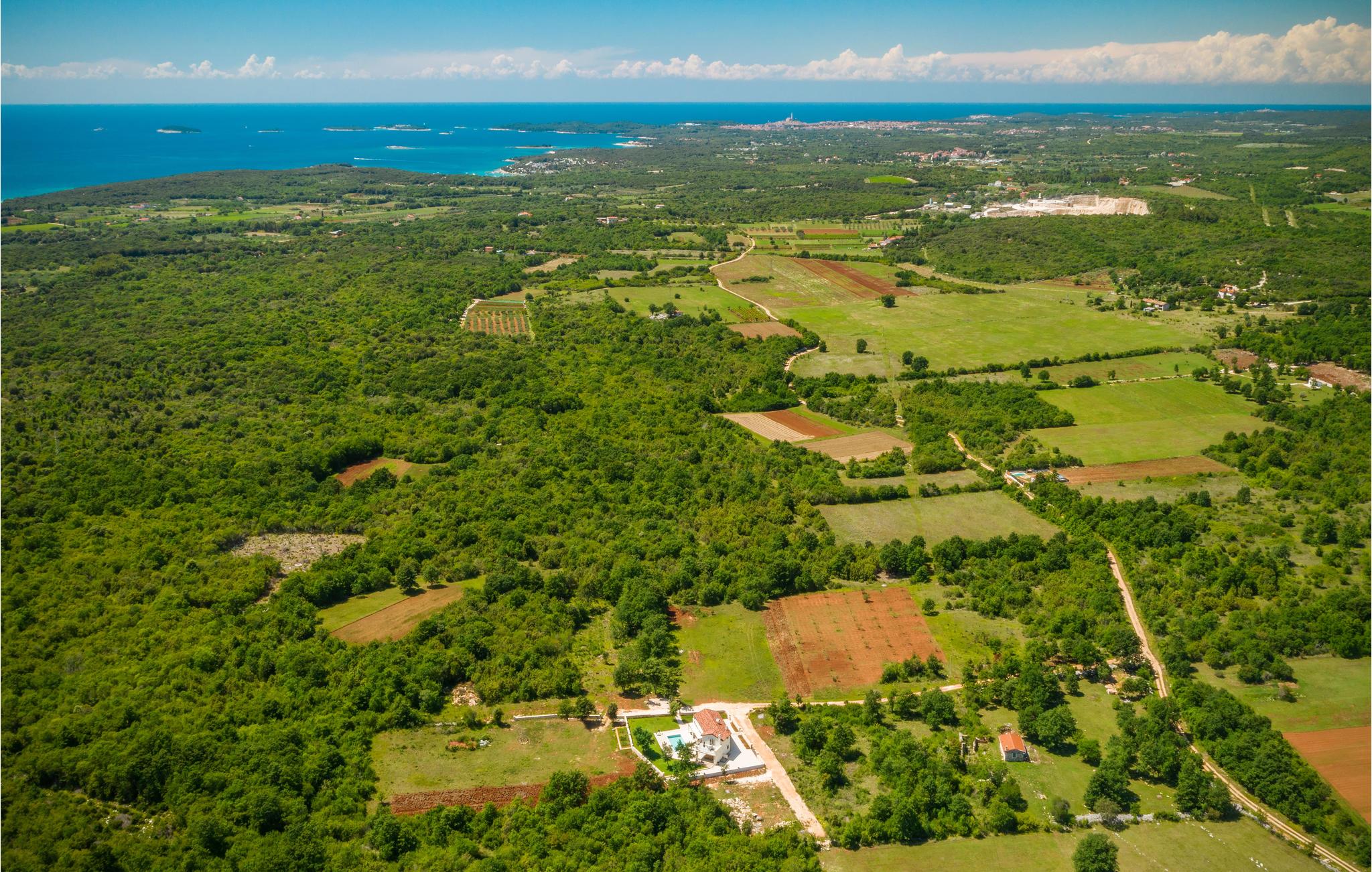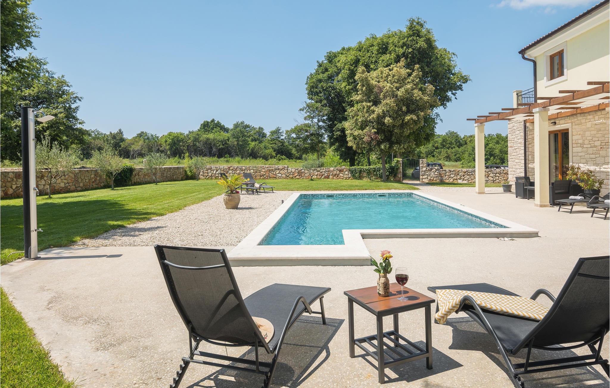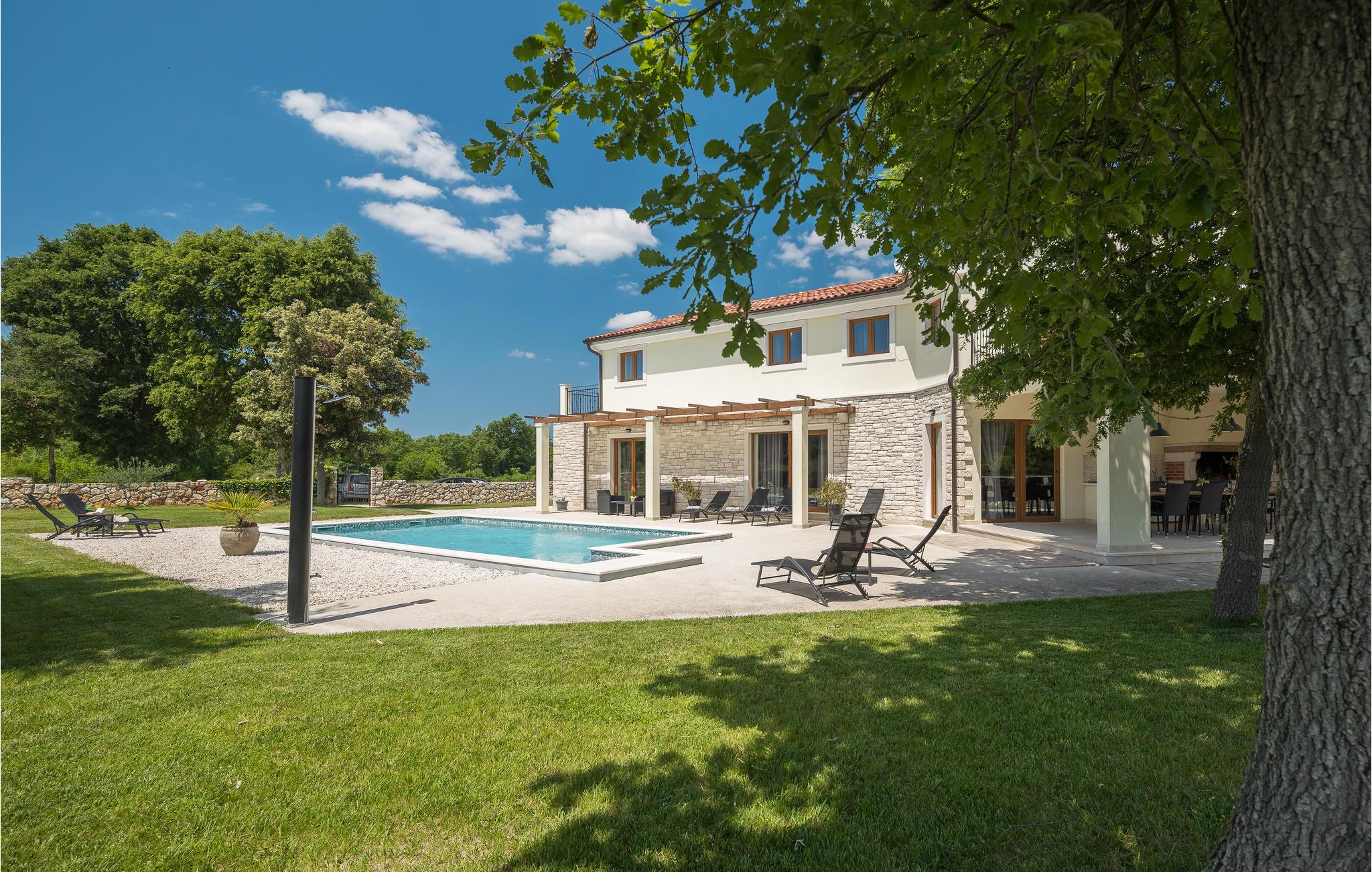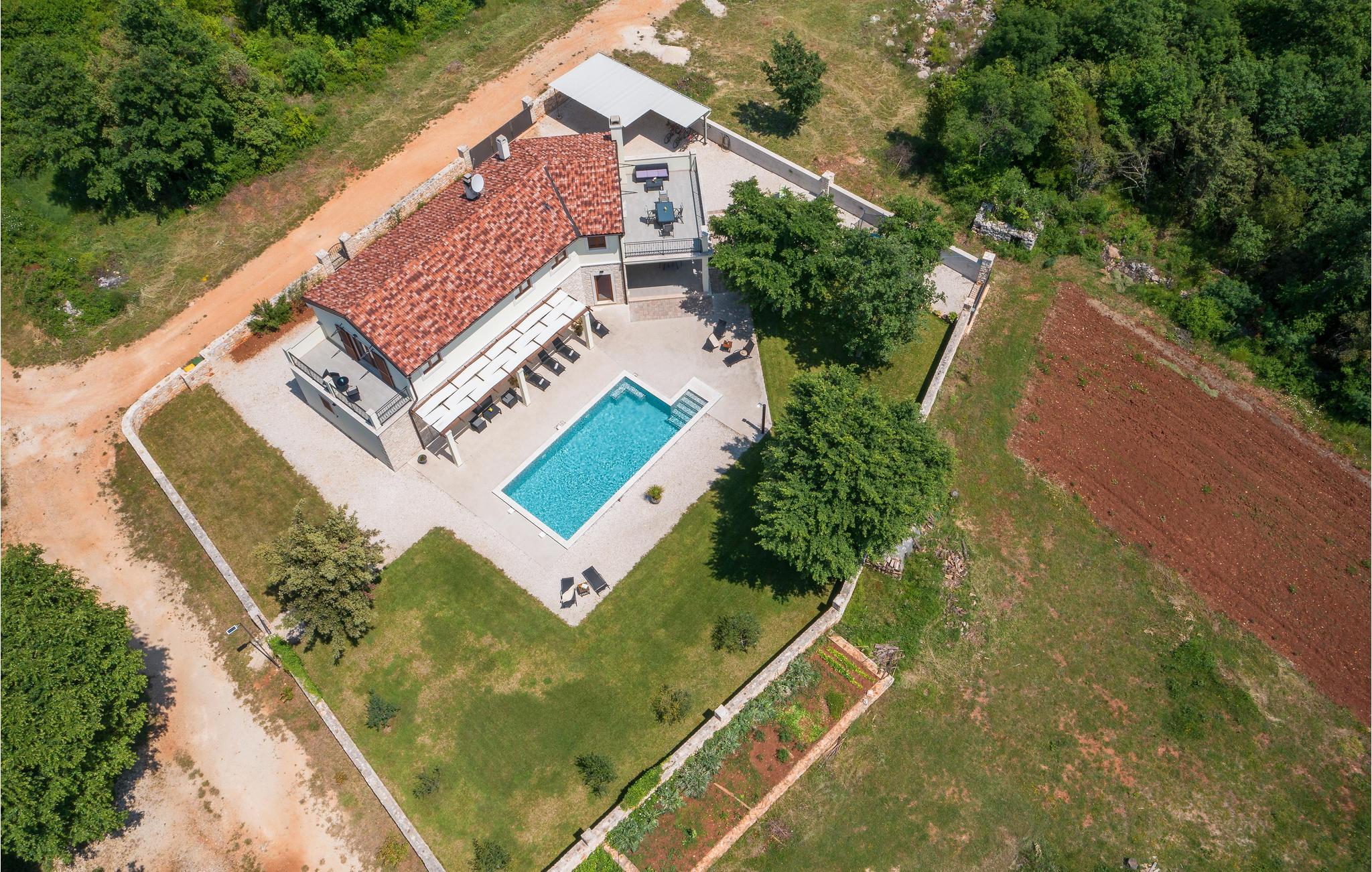 Dette vidunderlige feriehus med pool ligger i rolige omgivelser og tilbyder masser af privatliv til en afslappende ferie med familie og venner. Det store feriehus tilbyder sine gæster masser af komfort og består af fire soveværelser med eget badeværelse, en stue, et køkken og en spiseplads samt direkte adgang til terrassen og poolområdet. Terrassen er overdækket og har et udendørs køkken, hvor I kan tilberede lækre måltider under åben himmel. Ovenpå er der to yderligere terrasser med udsigt over det omkringliggende grønt. De nærmeste strande ligger cirka ti minutters kørsel væk. Besøg den fortryllende by Rovinj med dens Sankt Euphemia-kirke, men den lille by Bale udstråler også en særlig charme og er også et besøg værd. Ejendommen har en stor saltbehandlet pool, hvor I kan svømme og slappe af.