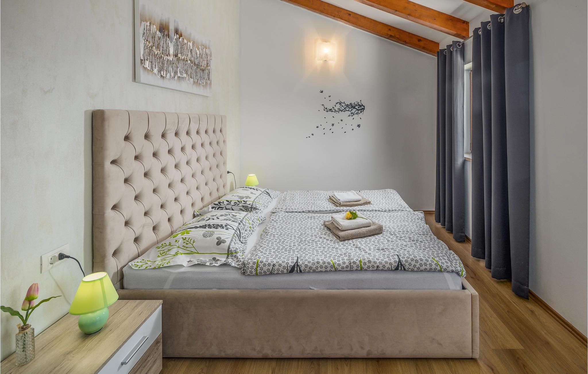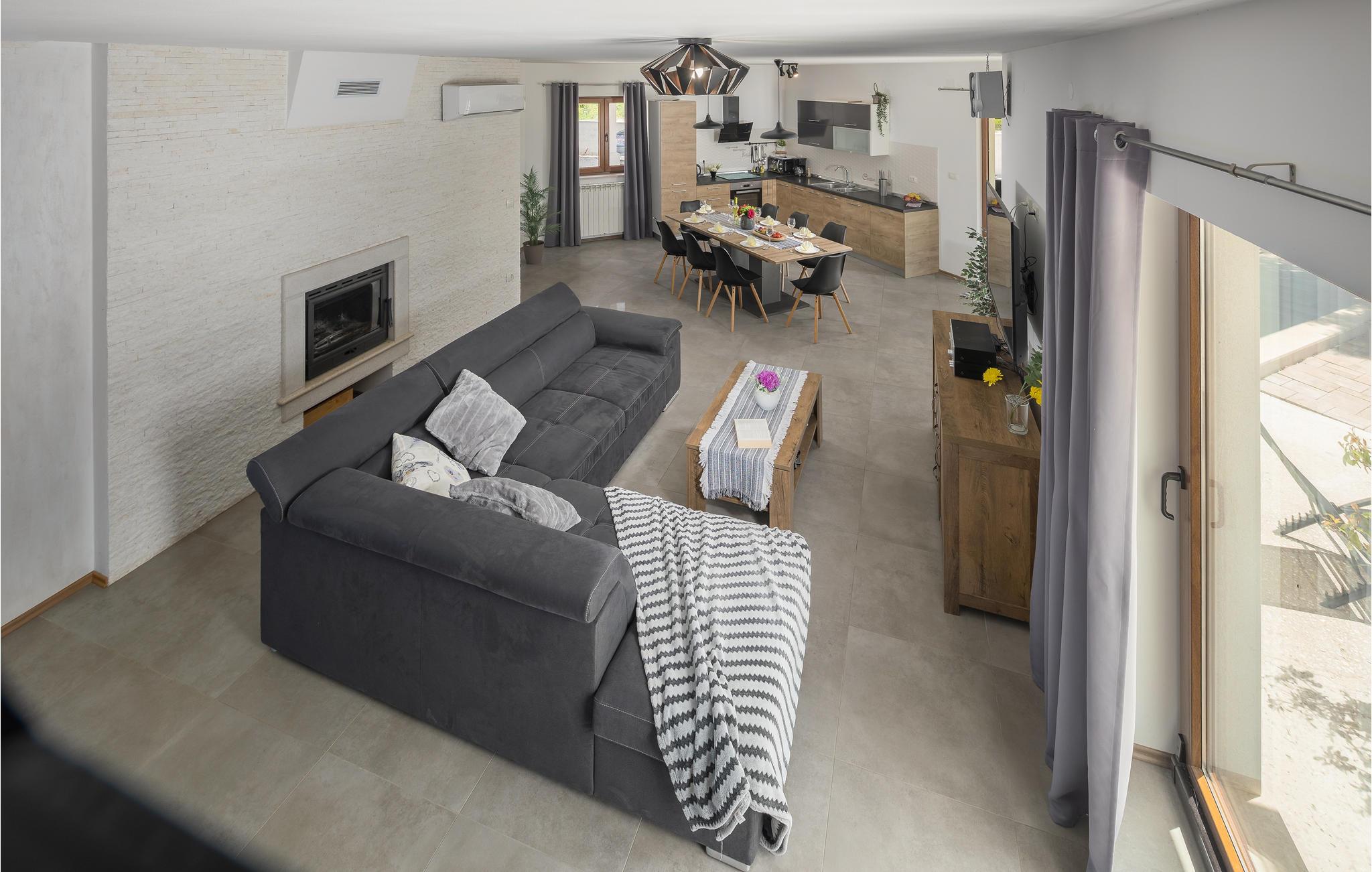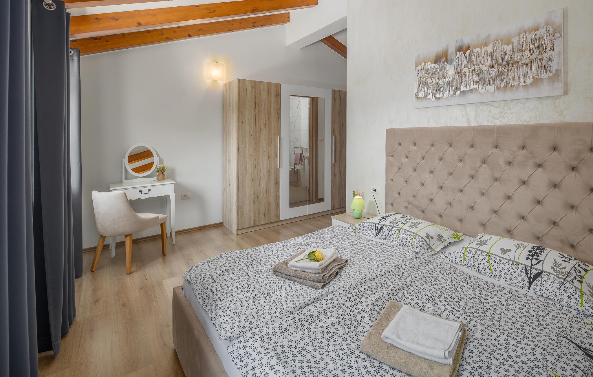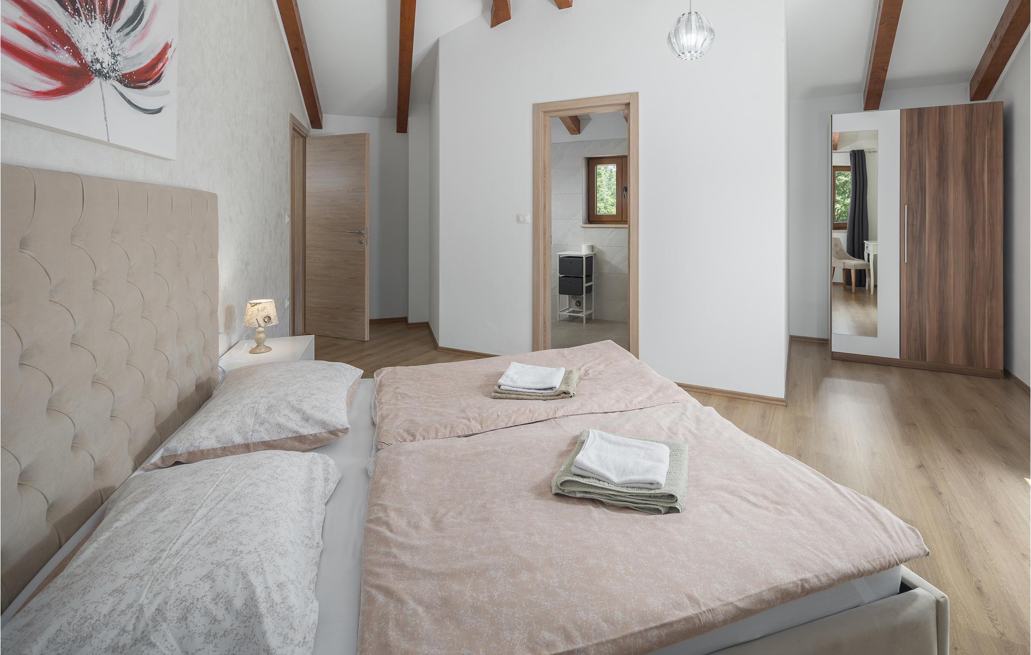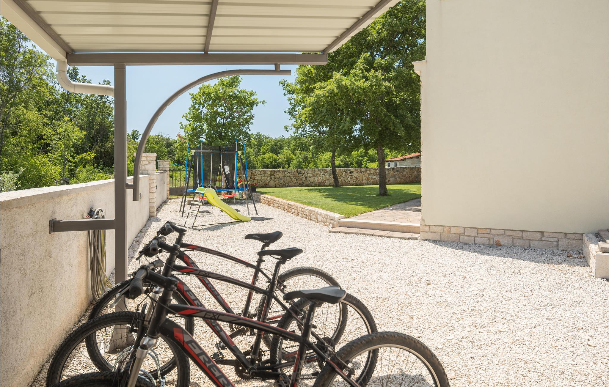 Dette vidunderlige feriehus med pool ligger i rolige omgivelser og tilbyder masser af privatliv til en afslappende ferie med familie og venner. Det store feriehus tilbyder sine gæster masser af komfort og består af fire soveværelser med eget badeværelse, en stue, et køkken og en spiseplads samt direkte adgang til terrassen og poolområdet. Terrassen er overdækket og har et udendørs køkken, hvor I kan tilberede lækre måltider under åben himmel. Ovenpå er der to yderligere terrasser med udsigt over det omkringliggende grønt. De nærmeste strande ligger cirka ti minutters kørsel væk. Besøg den fortryllende by Rovinj med dens Sankt Euphemia-kirke, men den lille by Bale udstråler også en særlig charme og er også et besøg værd. Ejendommen har en stor saltbehandlet pool, hvor I kan svømme og slappe af.