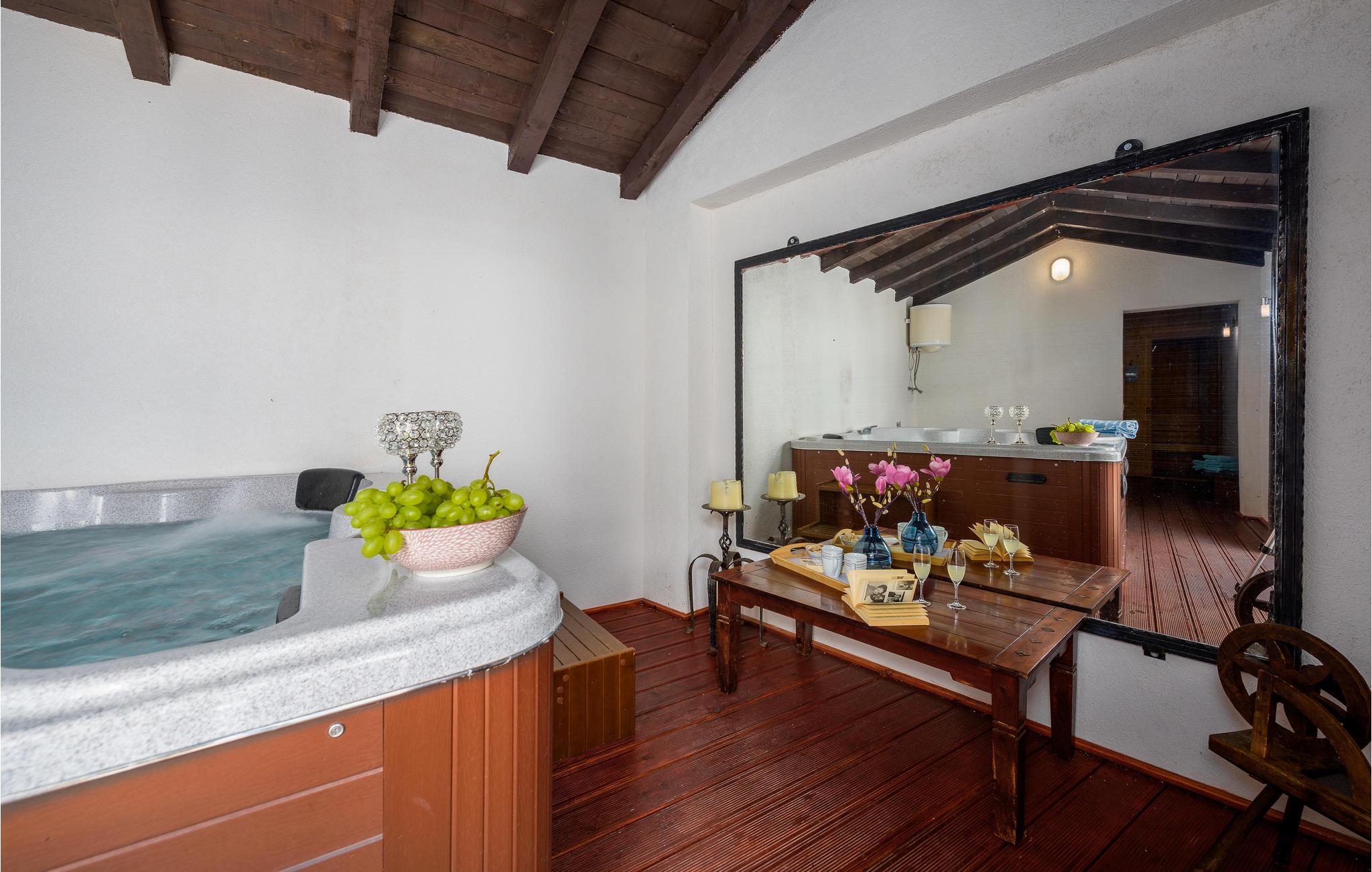 Det smukt indrettede feriehus med pool strækker sig over to etager, der er forbundet med en intern trappe. I stueetagen er der et køkken med spiseplads og stue. På første sal er der to soveværelser og et badeværelse. Huset sover komfortabelt fem personer, og dit kæledyr er også velkommen. I en separat bygning er der en sauna, et badeværelse og en indendørs jacuzzi til afslapning.