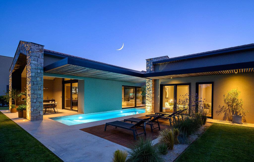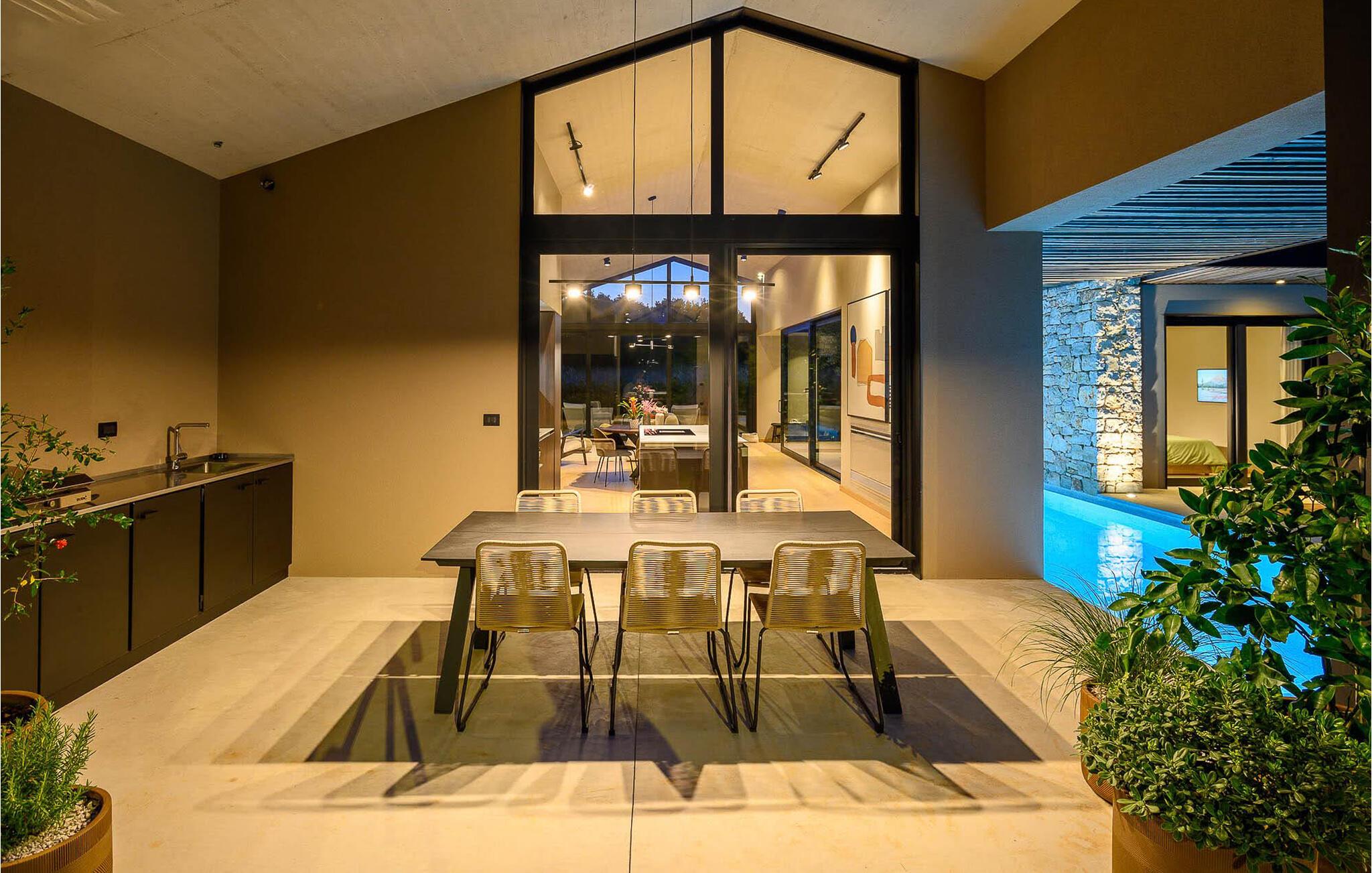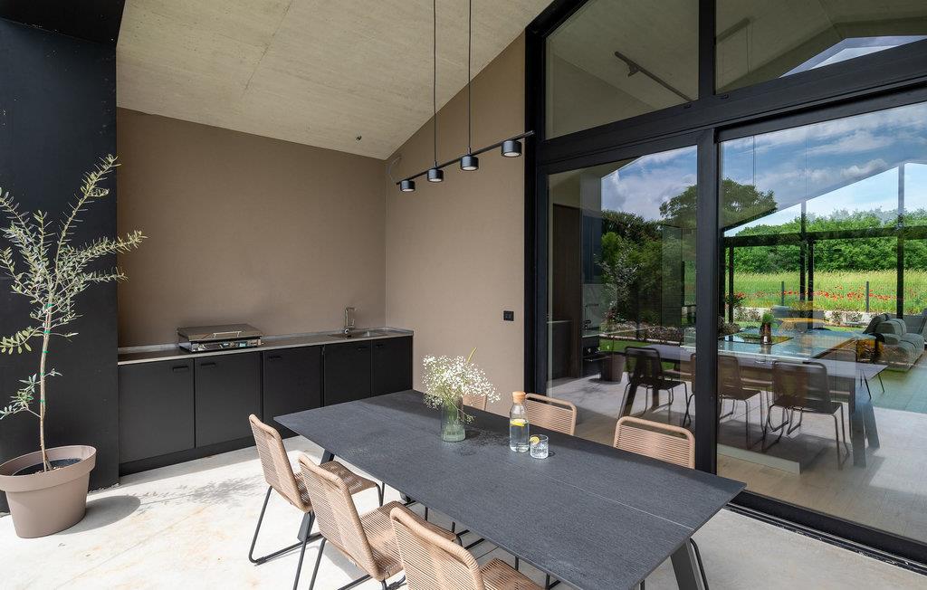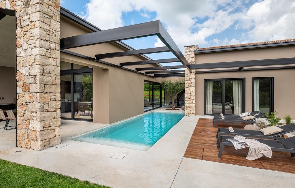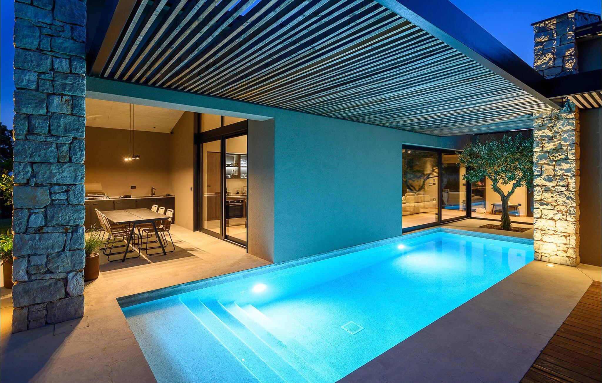 Luksusvillaen Silente ligger i Istrien, i den lille stenby Bale. Dette sted har titlen som en af ??de smukkeste juveler i Istrien og ligger på Istriens vestkyst. Istrien er en velkendt turistdestination for indenlandske og udenlandske gæster, der har besluttet at tilbringe en vidunderlig ferie i fred og ro og udforske historiske seværdigheder og naturlige skønheder. Hvis du ønsker at forkæle dig selv og din familie med en uforglemmelig ferie, er det nu! Villa Silente vil glæde dig ved første øjekast takket være sin vidunderlige moderne arkitektoniske stil. Det er bygget i 2023 og byder på et boligareal på 200 m2. Ejendommens samlede areal er 874 m2. Der er 7,7 km til det rene Adriaterhav, hvilket ikke er langt siden, du helt sikkert skal rejse i bil. Du bør bestemt ikke gå glip af et besøg på stenstranden i Colone, hvor du vil have det så meget sjovt, som hjertet begærer med dit yndlingsselskab. Det har to pænt møblerede soveværelser med dobbeltsenge (160 x 200). Villaen har desuden to badeværelser med bruseniche. Stuen er virkelig speciel, den indeholder en sofa, et sofabord og et fjernsyn. Der er også en romantisk pejs og lige ved siden af ??stuen er der direkte udgang til den udendørs terrasse med siddepladser. Du vil helt sikkert bruge morgentimerne der på at drikke kaffe og læse din yndlingsbog. En spisestue med spisebord og et moderne og fuldt udstyret køkken er blot en del af den luksus, der venter dig! Den udendørs terrasse byder på det bedste: forfriskning på varme sommerdage i en opvarmet pool på 27 m² og 1,4 meter dyb. Der er 4 liggestole på græsplænen, så du kan hvile og slappe af. Du kan bruge en grill, vaskemaskine og strygejern. En høj stol og en babyseng er til rådighed for børn. Yderligere tjenester, der tilbydes efter forudgående aftale og mod et gebyr, omfatter: kok, babysitter, rengøringsassistent, gartner, lufthavnstransport og private udflugter. Denne historiske stenby ligger på en bakke og er omgivet af olivenlunde og vinmarker. Den maleriske middelalderby i Istrien ligger kun 13 kilometer fra Rovinj og 20 kilometer fra Pula. Disse byer er også værd at besøge og udforske. Prøv de lækre gastronomiske tilbud i restauranterne og nyd som en konge! Velkommen til den smukke Villa Silente!
