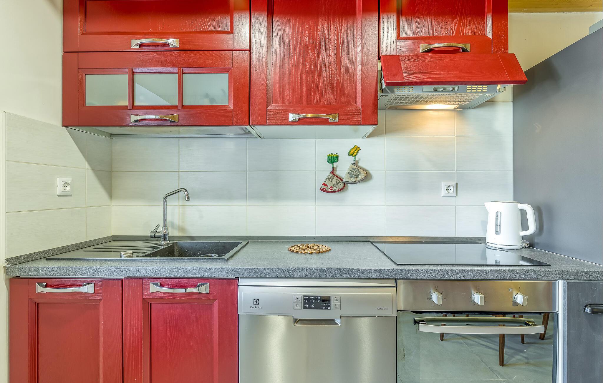I dette lyse og stilfuldt indrettede feriehus skaber træbjælkelofter, naturstensvægge og varme farveaccenter en hyggelig atmosfære. Tilbered lækre specialiteter i det moderne køkken og nyd dem i den hyggelige spiseplads. Afslut dagen med en filmaften i den behagelige sofa eller tilbring hyggelige timer med at spille et brætspil.