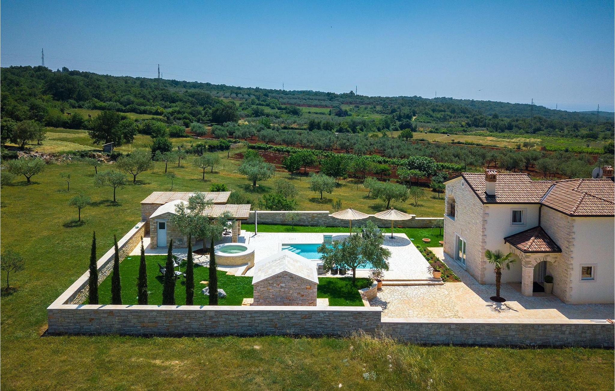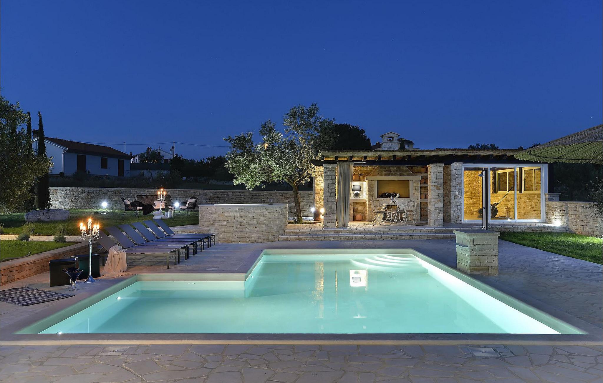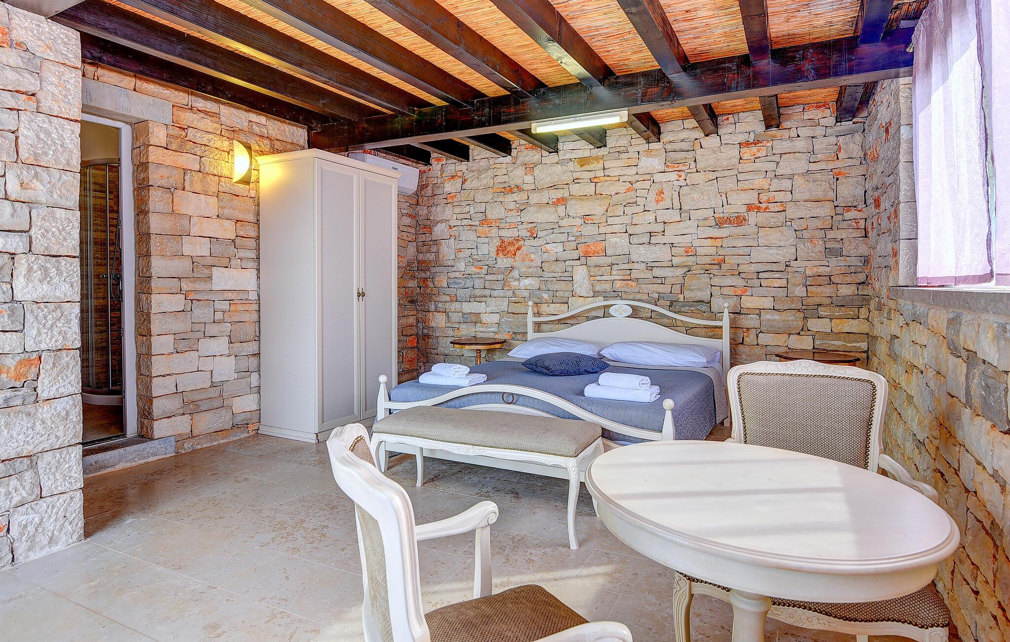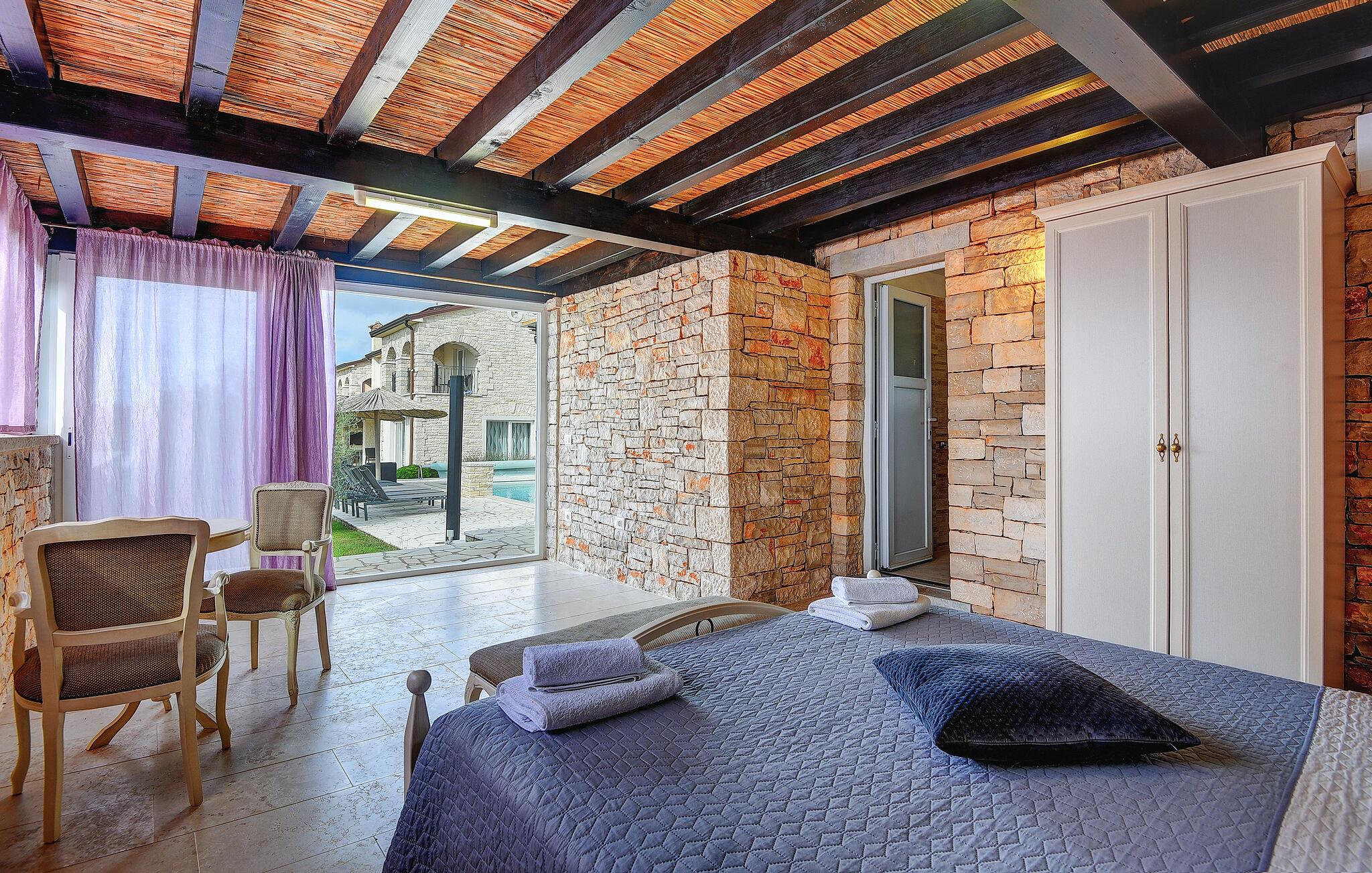I haven, direkte ved siden af poolen, er der et lille poolhus lavet af sten, hvor det 4. soveværelse er placeret. Det er perfekt til dem, der ønsker ekstra privatliv i et idyllisk lille istrisk stenhus. Også perfekt til dem, der ønsker at hoppe i poolen direkte efter at være vågnet! Poolhuset har også en finsk sauna, et ekstra badeværelse og en udendørs spiseplads med 2 griller.