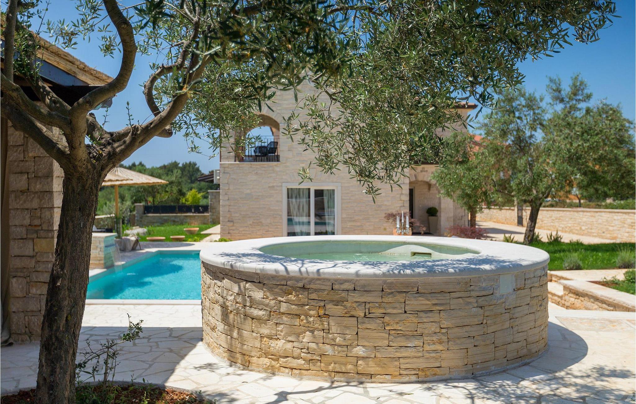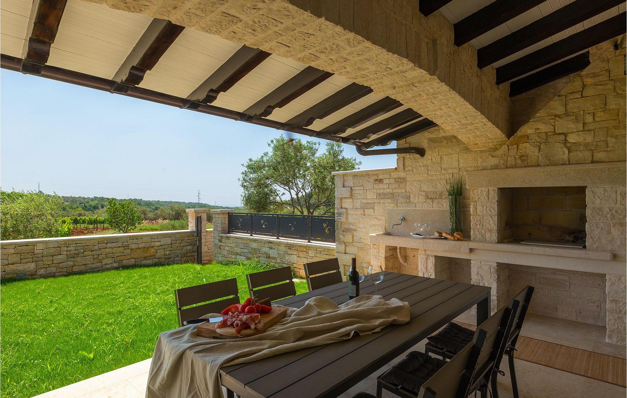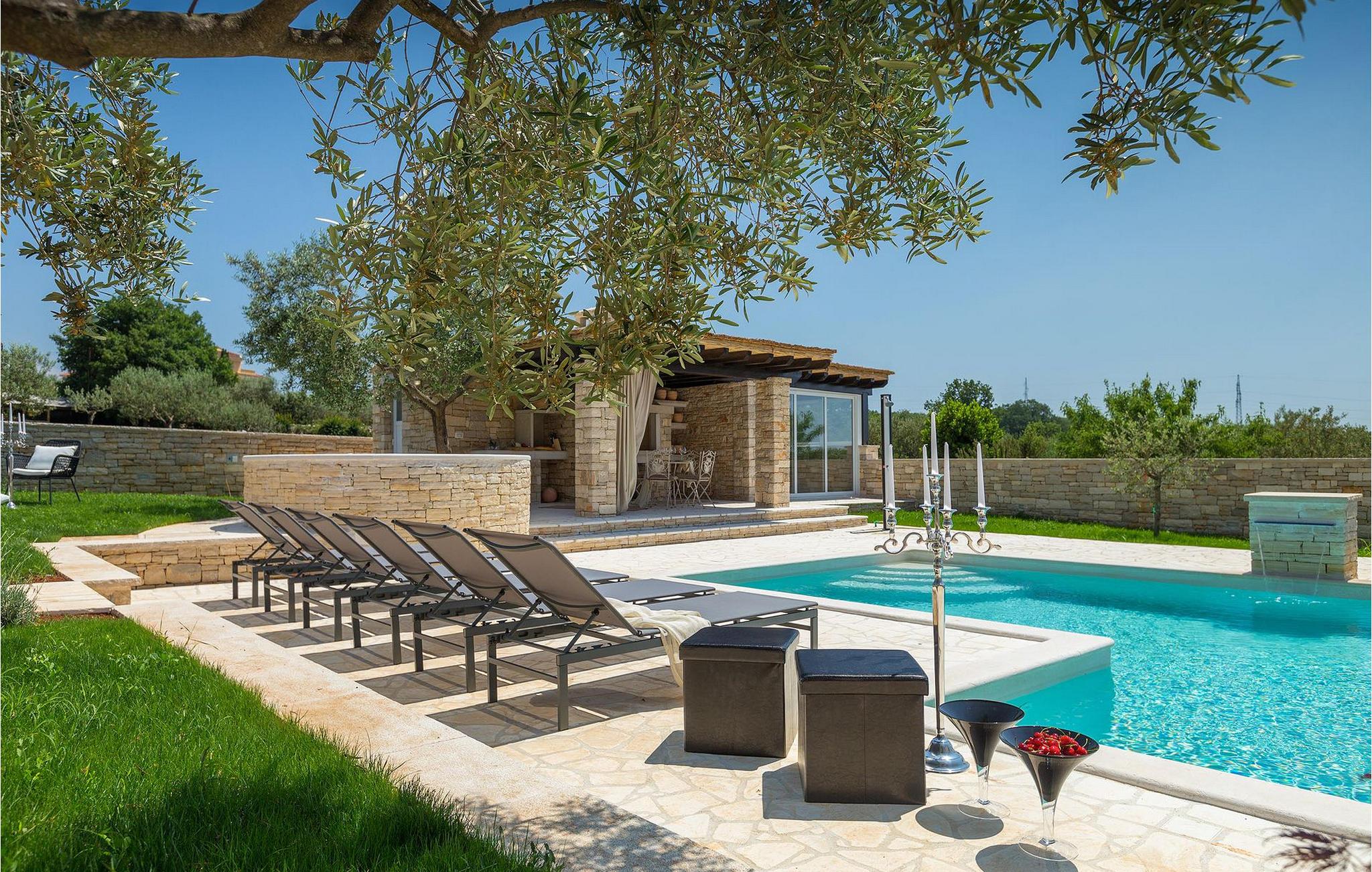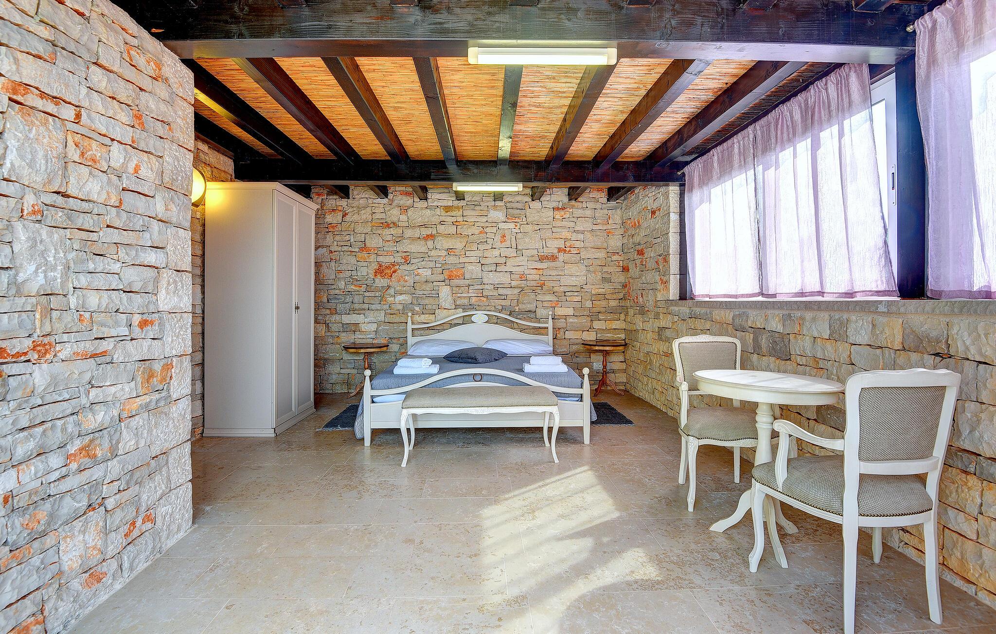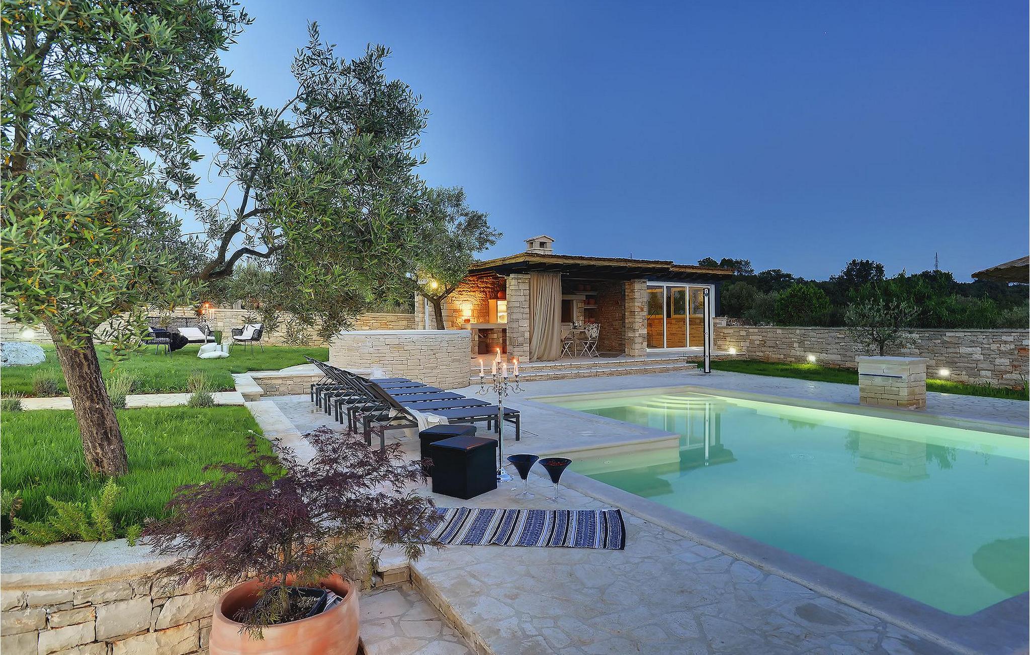 I haven, direkte ved siden af poolen, er der et lille poolhus lavet af sten, hvor det 4. soveværelse er placeret. Det er perfekt til dem, der ønsker ekstra privatliv i et idyllisk lille istrisk stenhus. Også perfekt til dem, der ønsker at hoppe i poolen direkte efter at være vågnet! Poolhuset har også en finsk sauna, et ekstra badeværelse og en udendørs spiseplads med 2 griller.