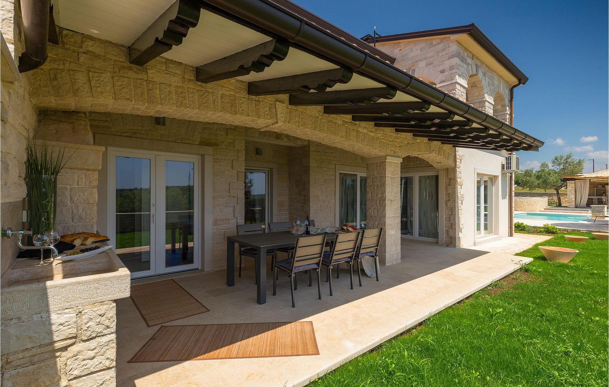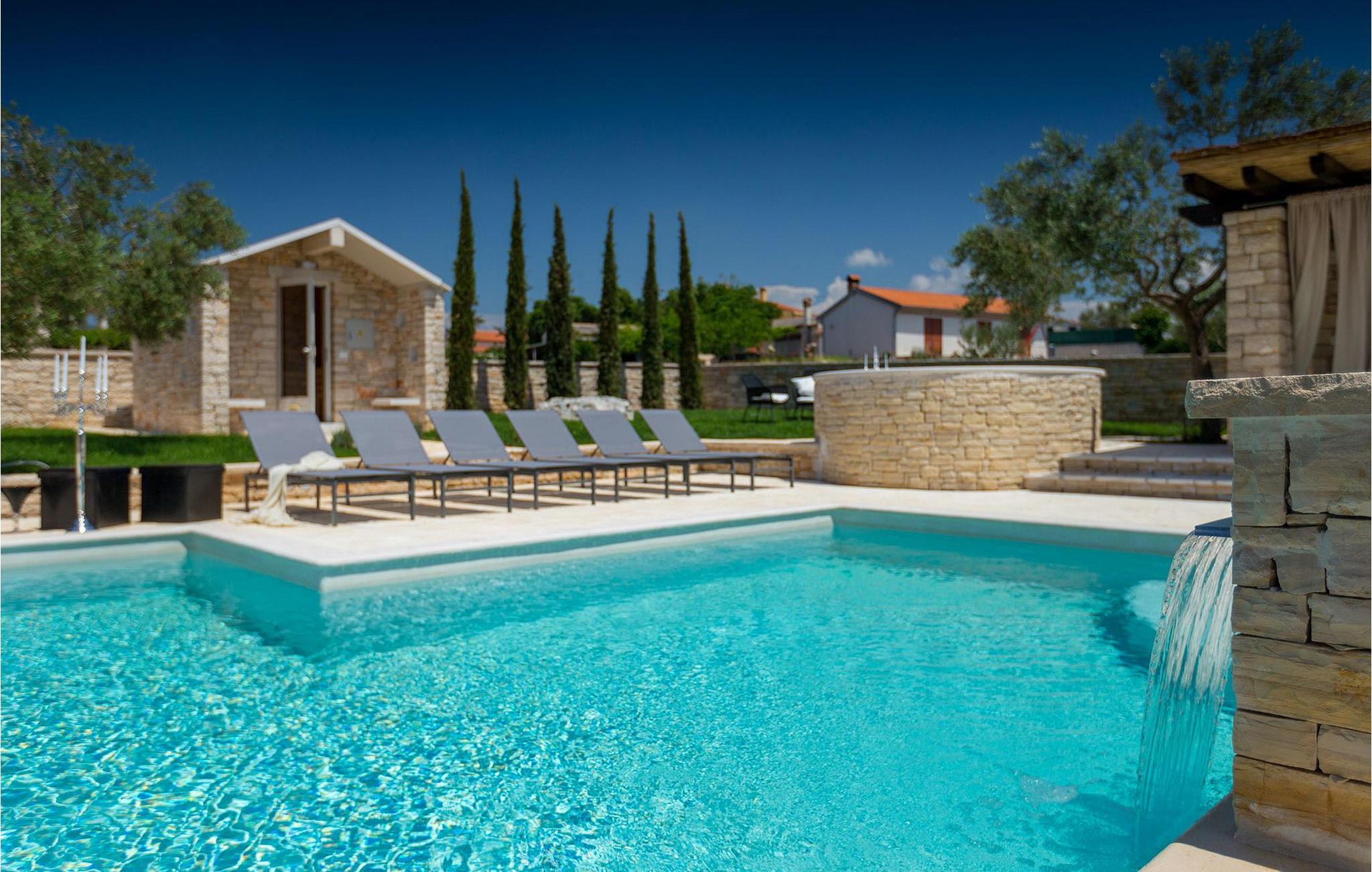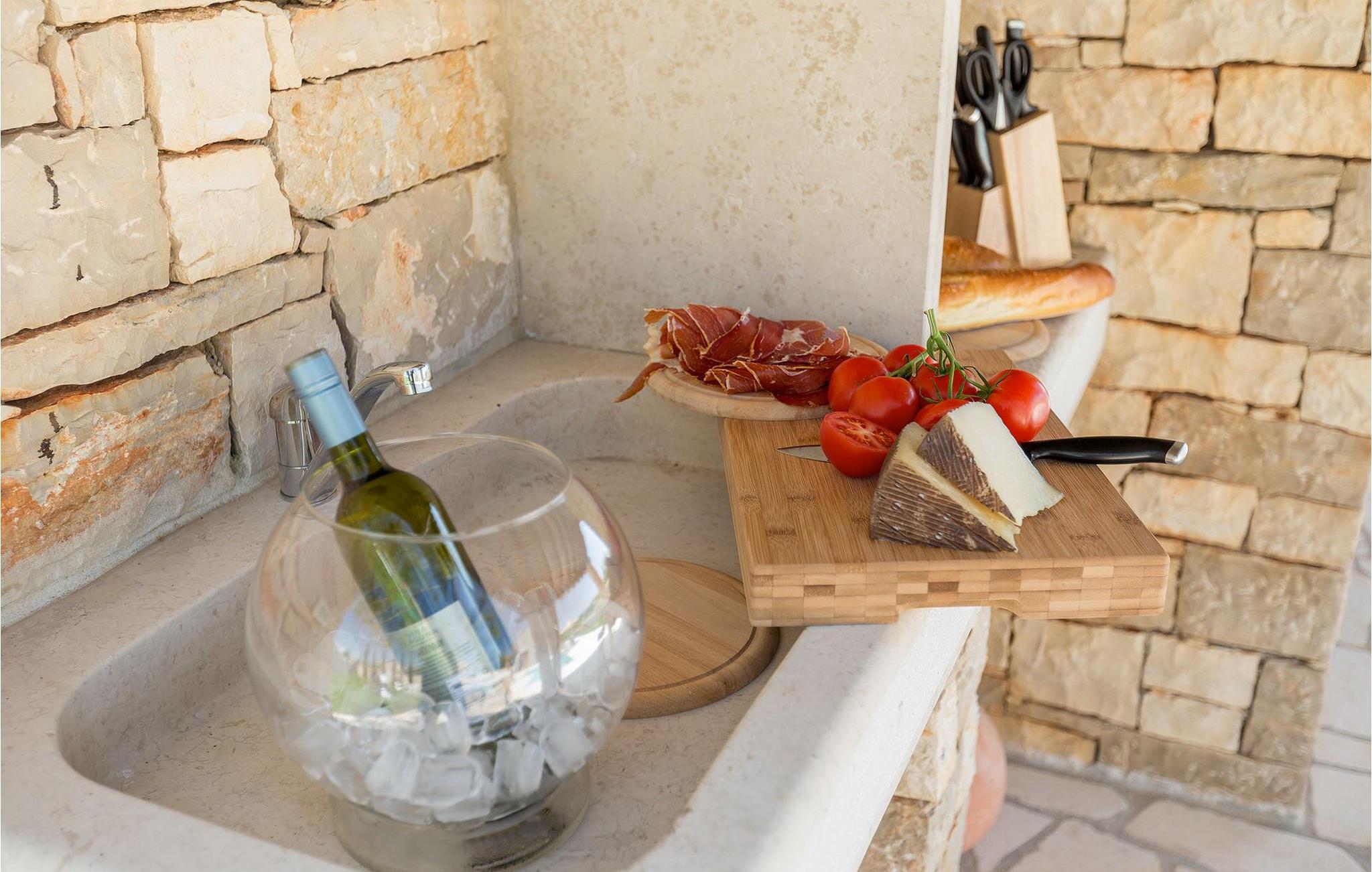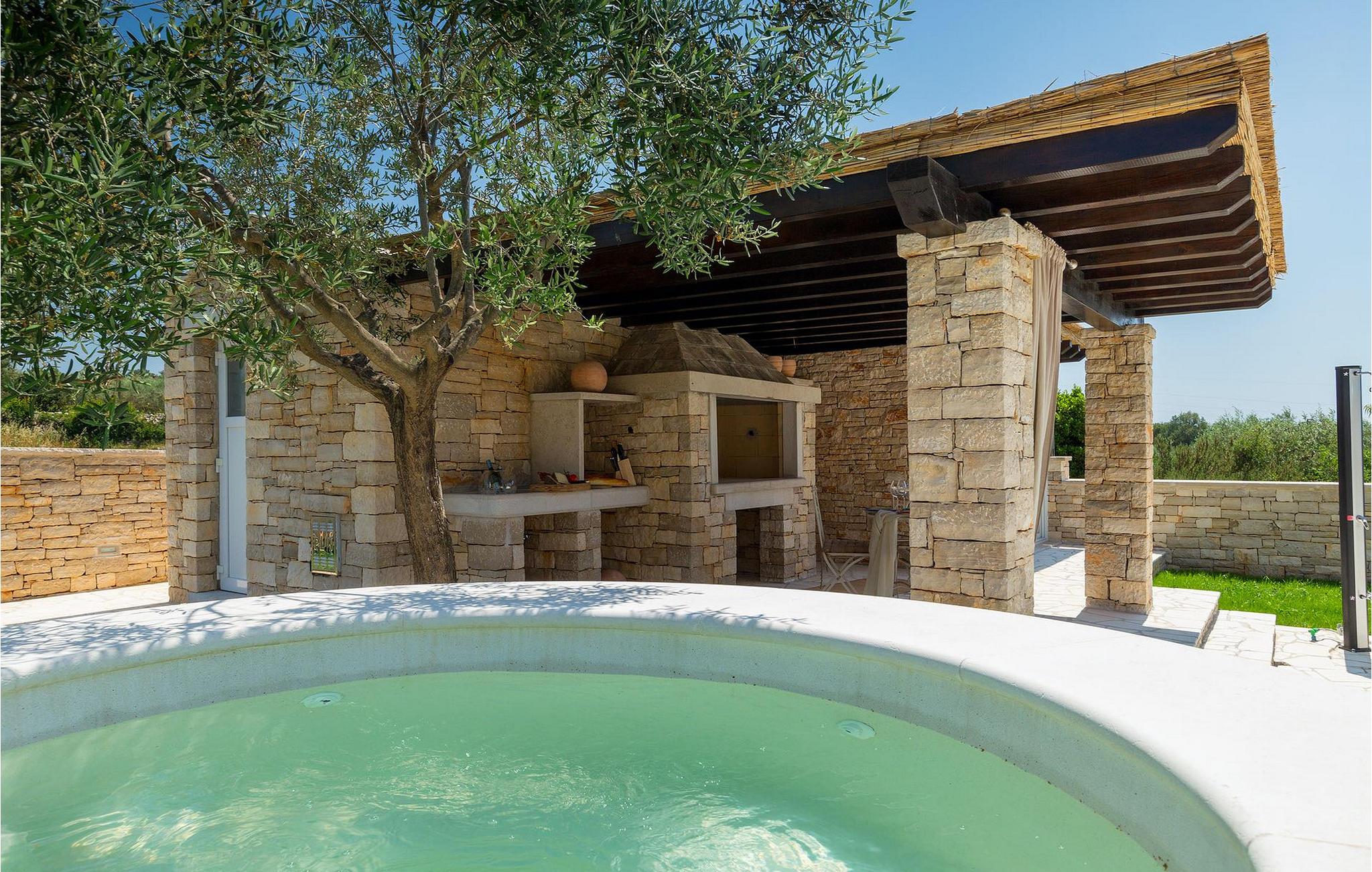 I haven, direkte ved siden af poolen, er der et lille poolhus lavet af sten, hvor det 4. soveværelse er placeret. Det er perfekt til dem, der ønsker ekstra privatliv i et idyllisk lille istrisk stenhus. Også perfekt til dem, der ønsker at hoppe i poolen direkte efter at være vågnet! Poolhuset har også en finsk sauna, et ekstra badeværelse og en udendørs spiseplads med 2 griller.