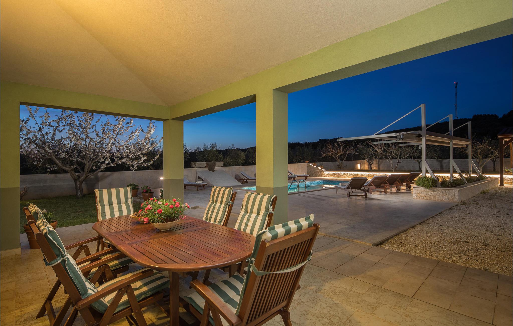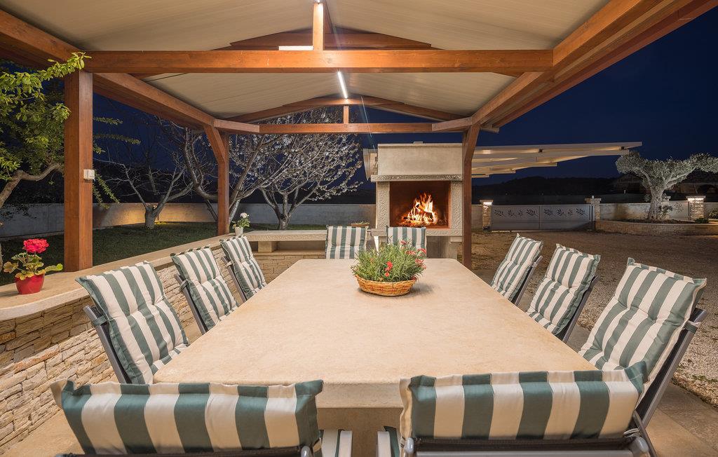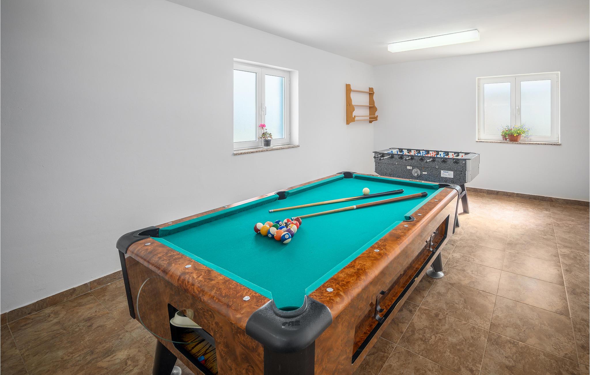 I den indhegnede gård ligger der ved siden af poolen en overdækket terrasse. Her er udekøkkenet, et bord og stole anbragt. En skønt, skyggefuldt miljø til at spise grillmad sammen. Nyd jeres fritid med billard, dart og bordfodbold. Fem minutters gang væk ligger de skønne stenstrande og de naturlige sandstrande ved Rovinj.