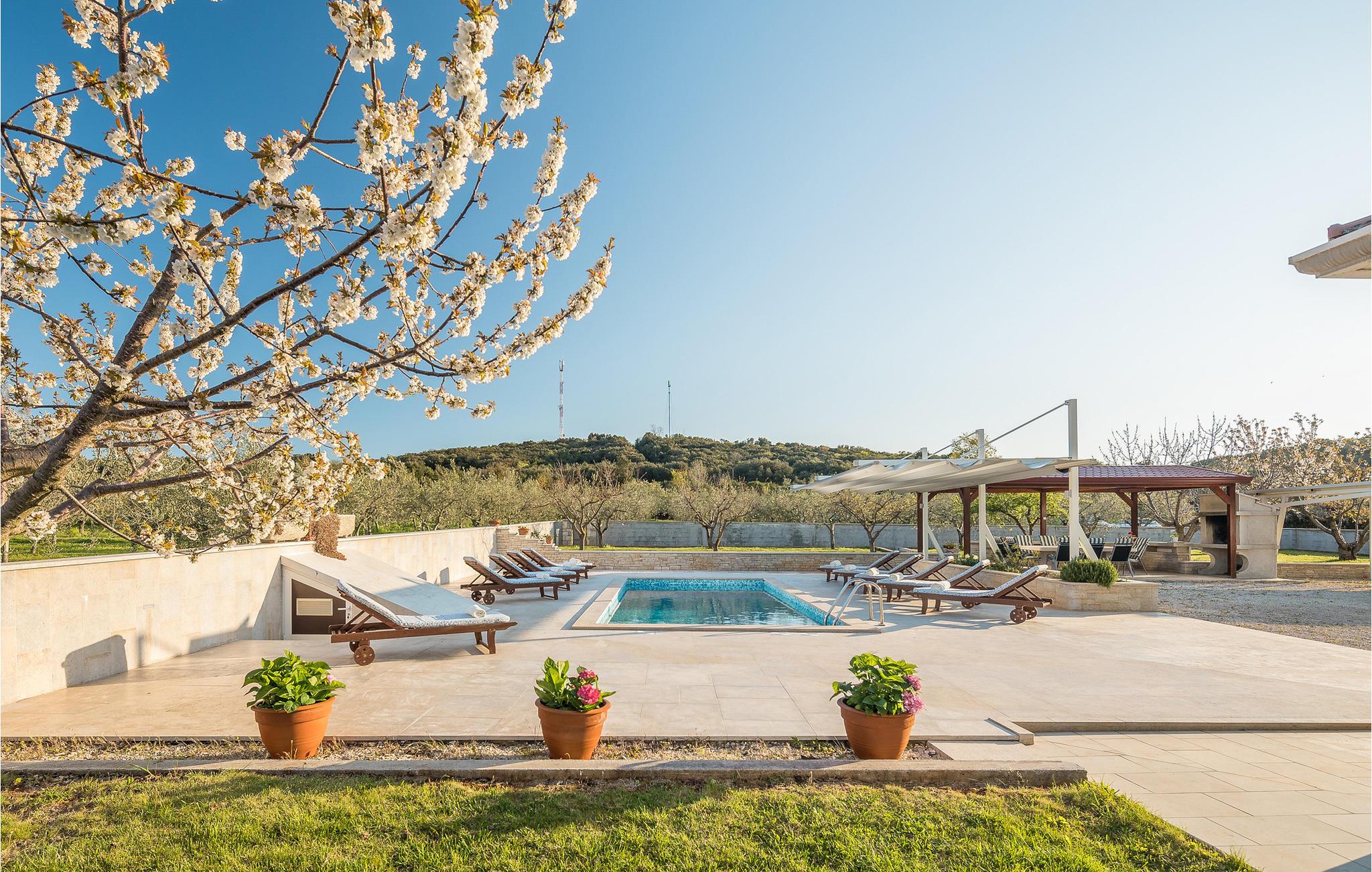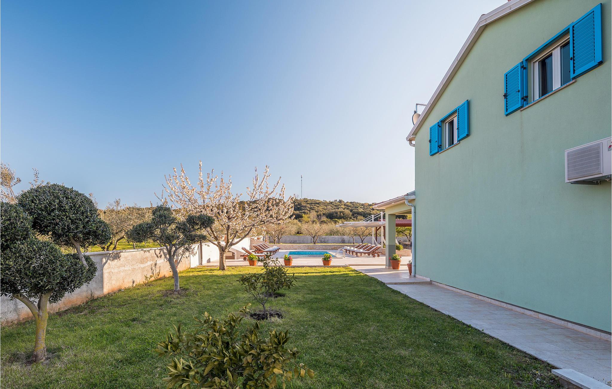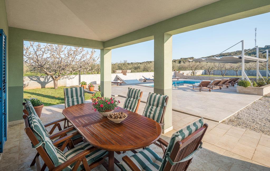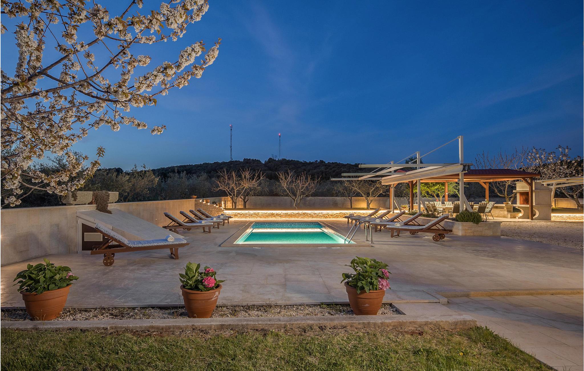 I den indhegnede gård ligger der ved siden af poolen en overdækket terrasse. Her er udekøkkenet, et bord og stole anbragt. En skønt, skyggefuldt miljø til at spise grillmad sammen. Nyd jeres fritid med billard, dart og bordfodbold. Fem minutters gang væk ligger de skønne stenstrande og de naturlige sandstrande ved Rovinj.