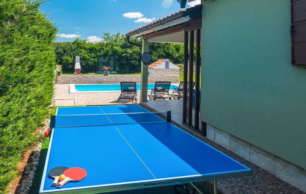 Den store, overdækkede terrasse byder på fuld komfort med et spisebord samt et hyggeligt afslapningshjørne. Fra terrassen er du kun et stenkast fra swimmingpoolen. Der er også en trampolin til de små, og du kan også spille et spil dart.