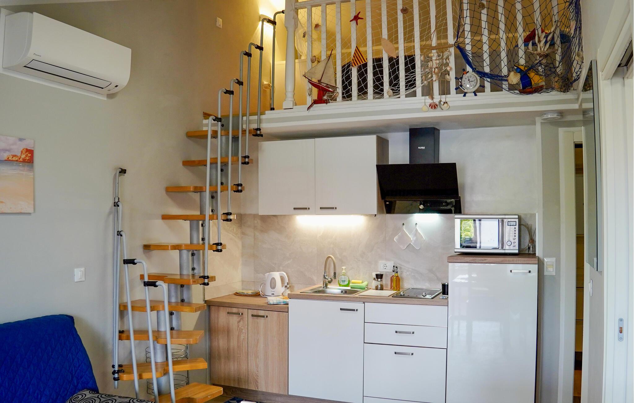 Jeres behagelige studiolejlighed ligger på anden sal i et hus med flere ferieboliger og er velegnet for en familie med ældre børn, da lejligheden har en hems, der er tilgængelig via trappen i stuen. Den gode indretning og de lyse omgivelser skaber et afslappet miljø, hvor I alle sammen vil føle jer hjemme. Start dagen med en lækker morgenmad på terrassen, og slut dagen af samme sted med et godt glas vin. Dagen efter venter der flere dejlige oplevelser.