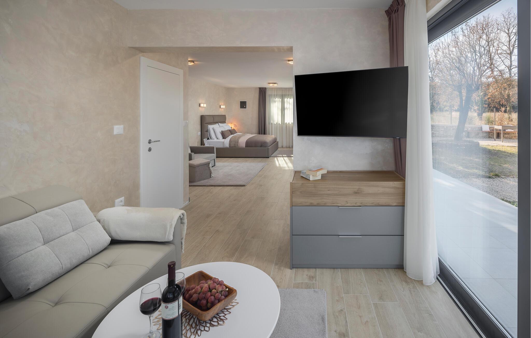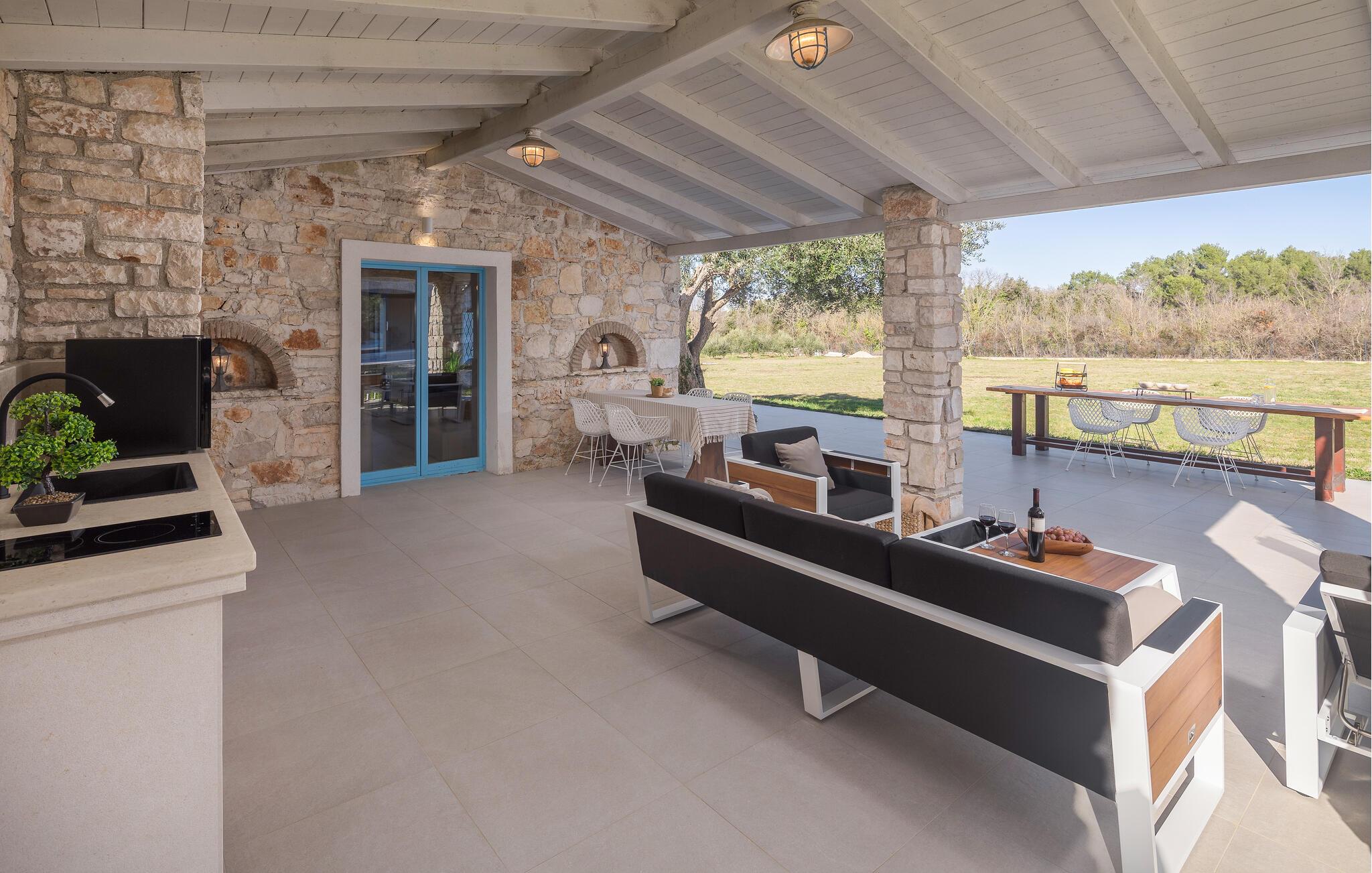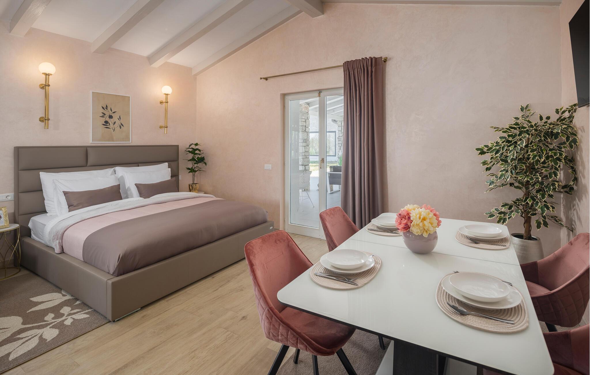 Tæt på kysten og lidt syd for Rovinj ligger denne bolig, der består af to elegante stenbygninger, hvor der venter jer en herlig ferie i det kroatiske.